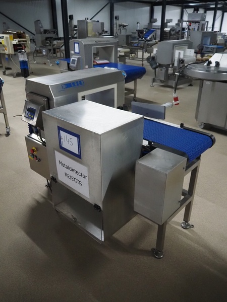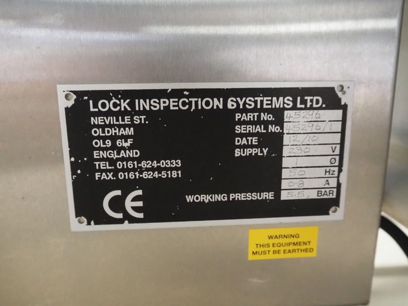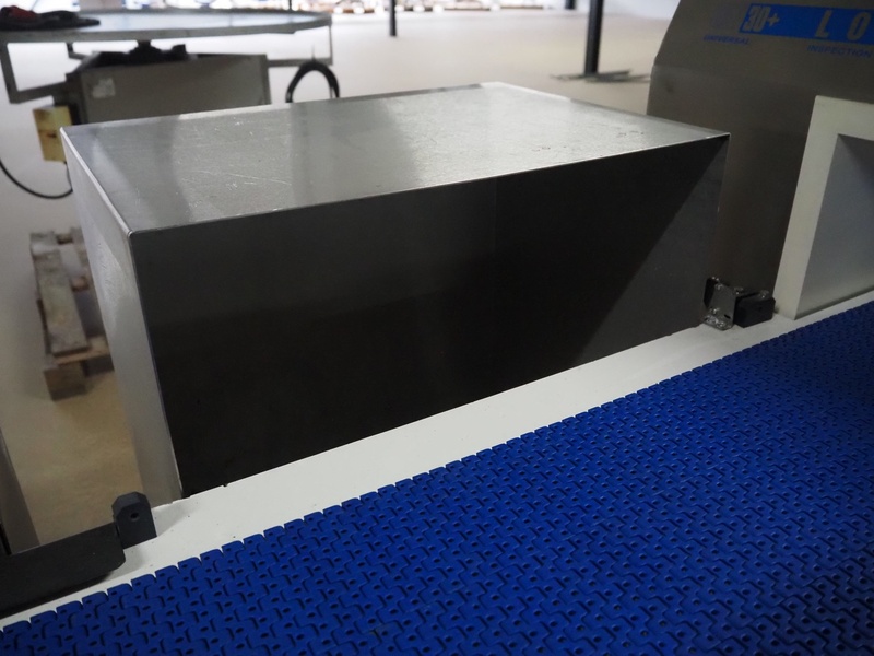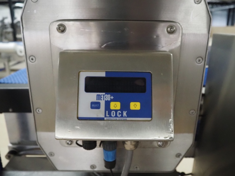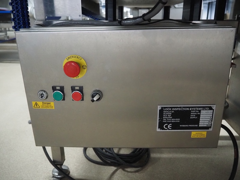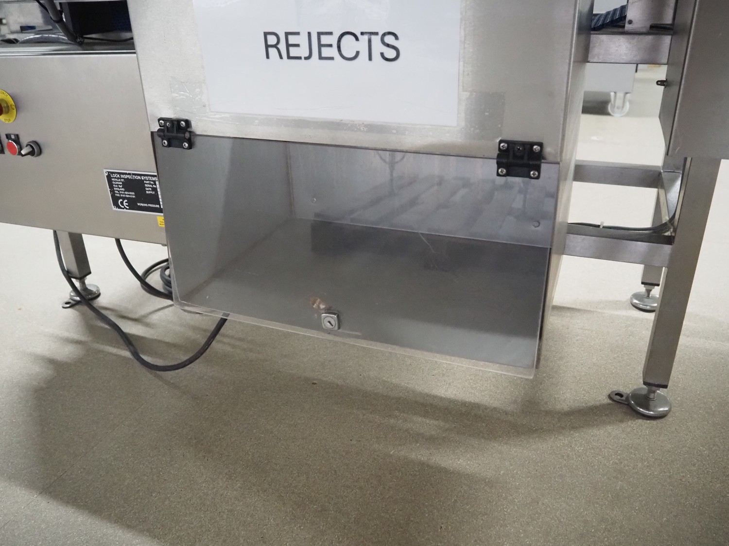 Lock Inspection Systems Ltd. metal detector with rejector, model: MET 30+, serial number: 45296/1, year of construction: 12/10, 230 V, 1 Ph, 50 Hz, 0.8 A, 5.5 bar, plastic belt, belt width: 300 mm, clearance: 350 mm x 170 mm, total dimensions: 1500 mm x 1100 mm x 1300 mm.