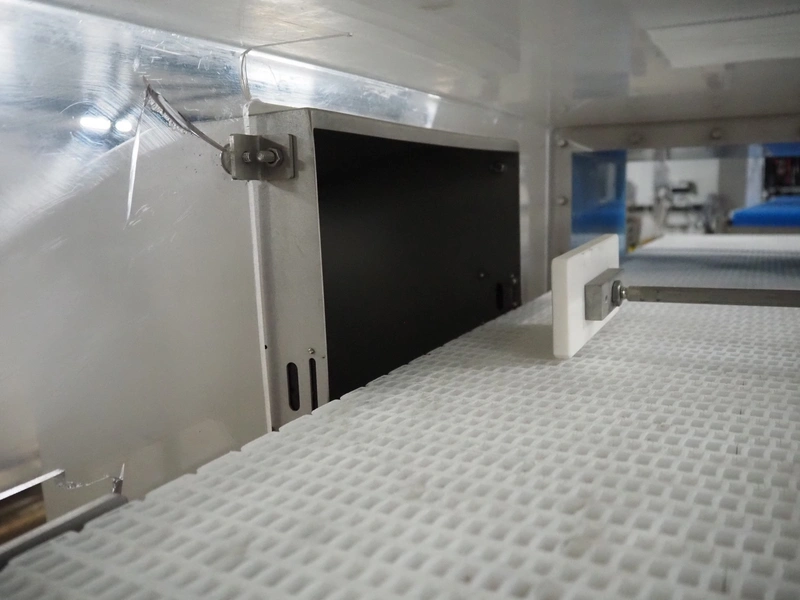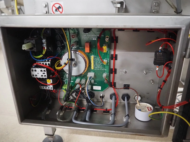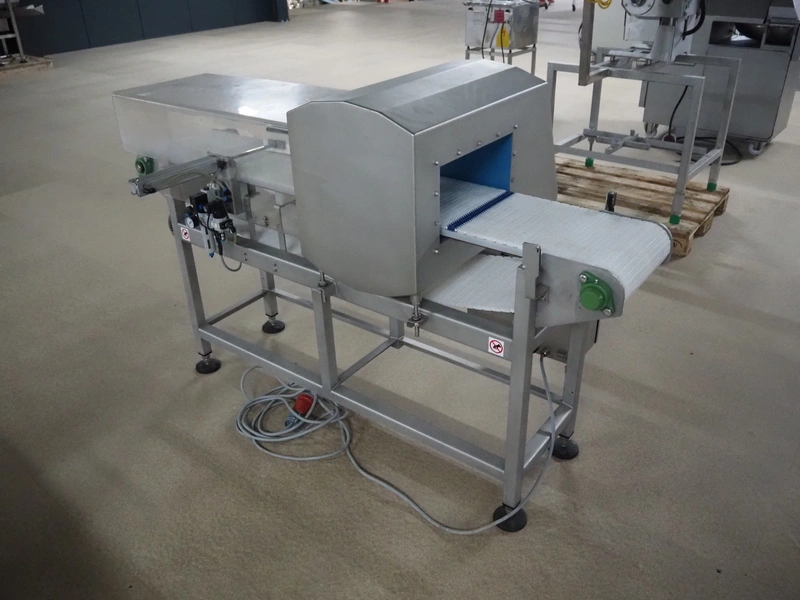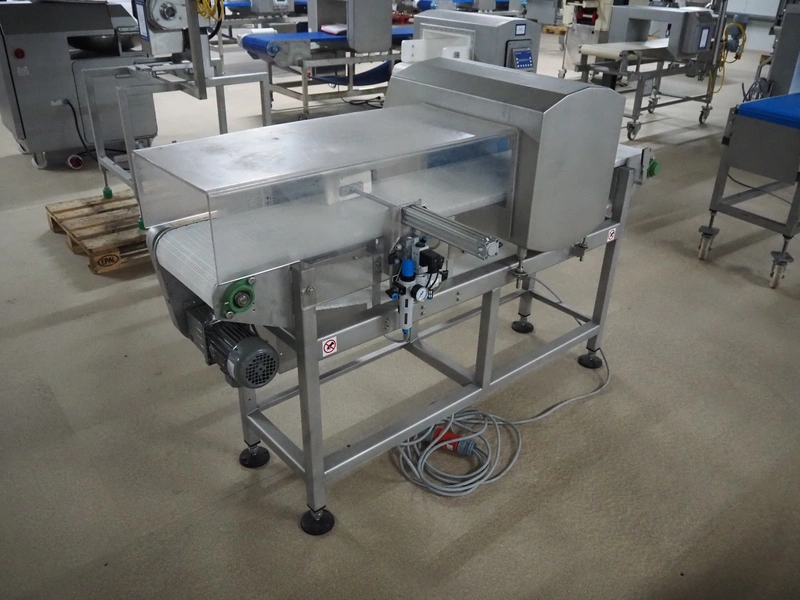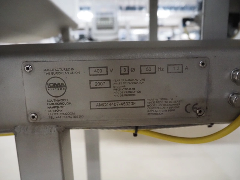 Loma Systems metal detector with rejector, model: IQ3+, serial number: AMC44407-45020F, year of construction: 2007, 400 V, 3 Ph, 50 Hz, 1.2 A, plastic mesh belt, belt width: 305 mm, clearance: 350 mm x 160 mm, total dimensions: 1800 mm x 1000 mm x 1180 mm.