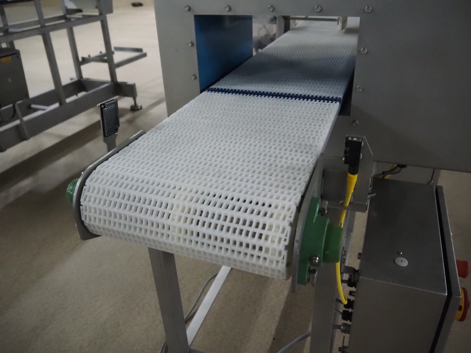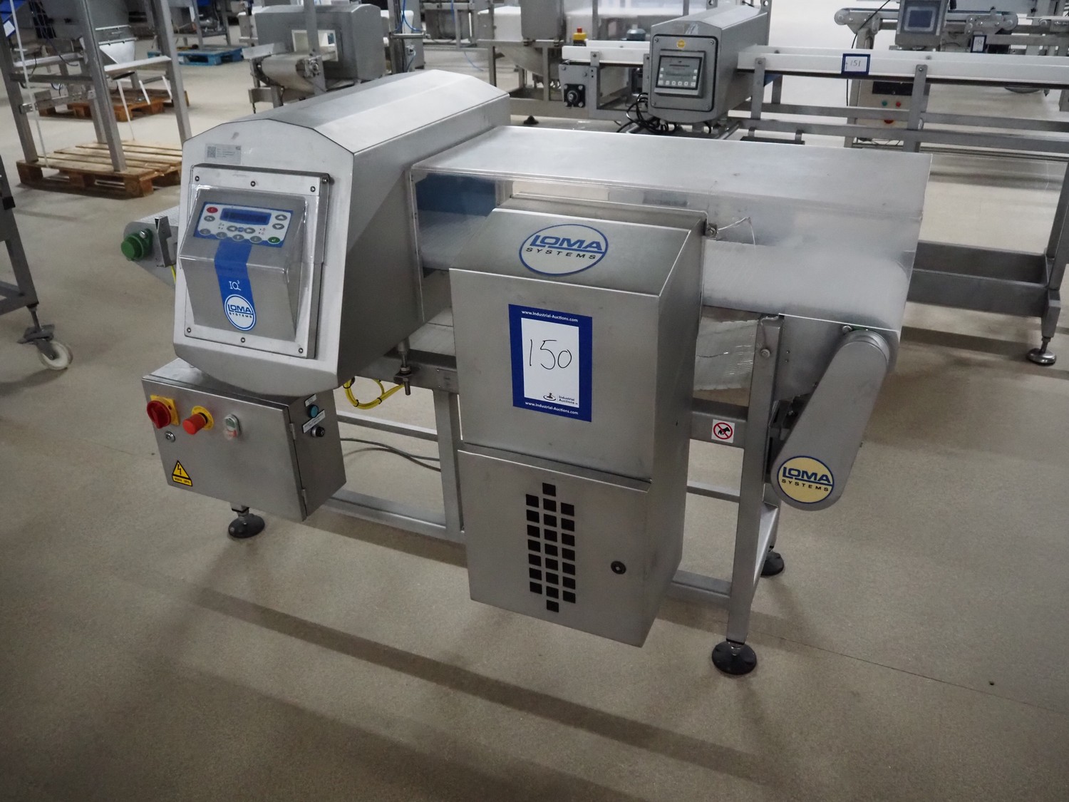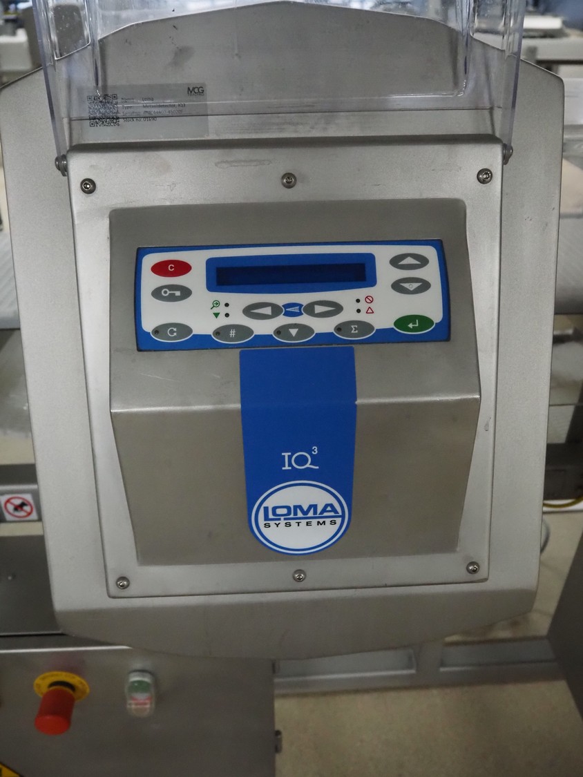 Loma Systems metal detector with rejector, model: IQ3+, serial number: AMC44407-45020F, year of construction: 2007, 400 V, 3 Ph, 50 Hz, 1.2 A, plastic mesh belt, belt width: 305 mm, clearance: 350 mm x 160 mm, total dimensions: 1800 mm x 1000 mm x 1180 mm.