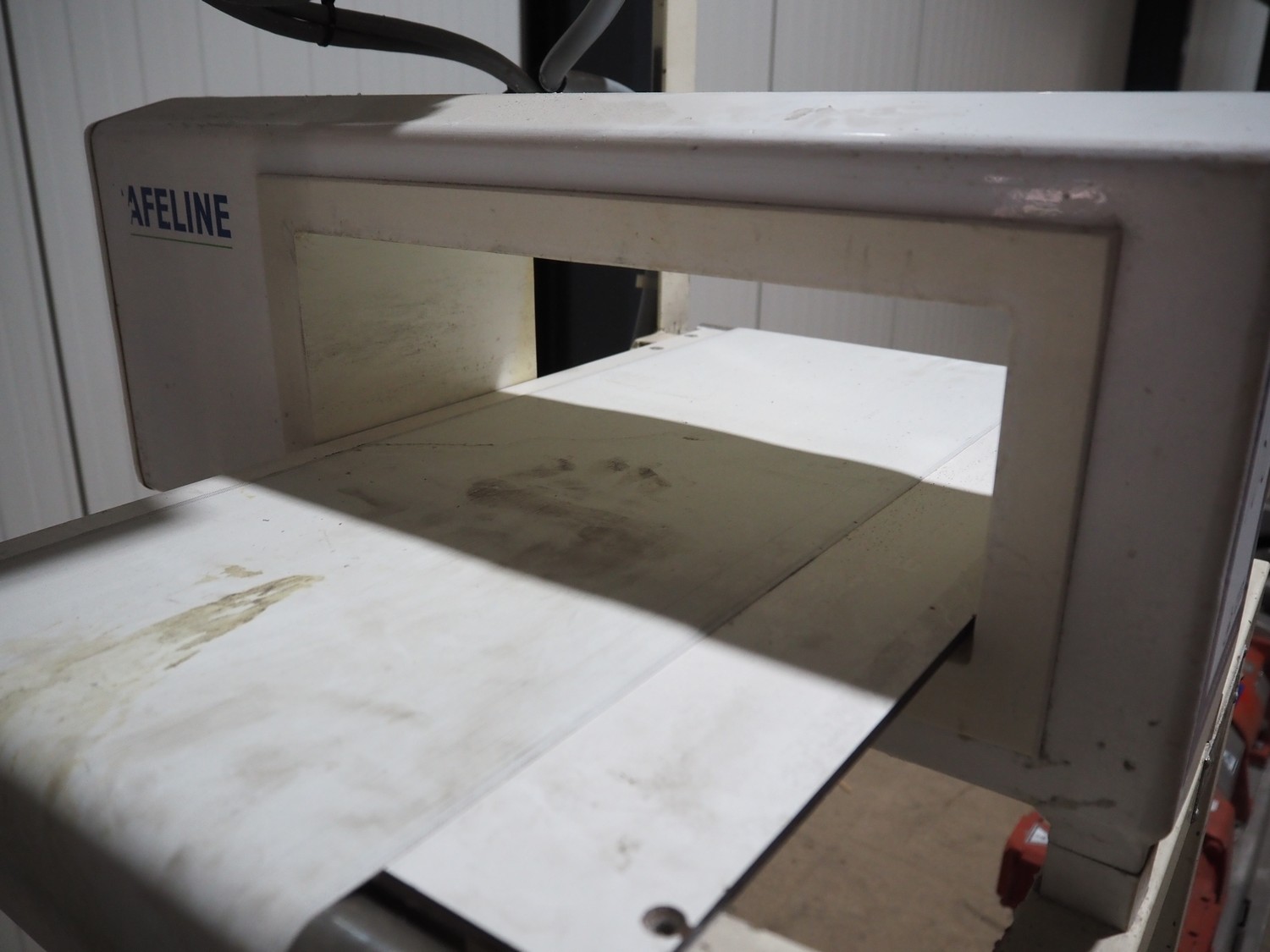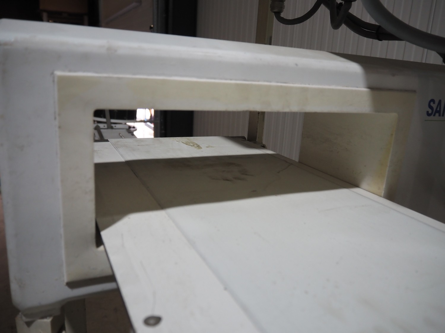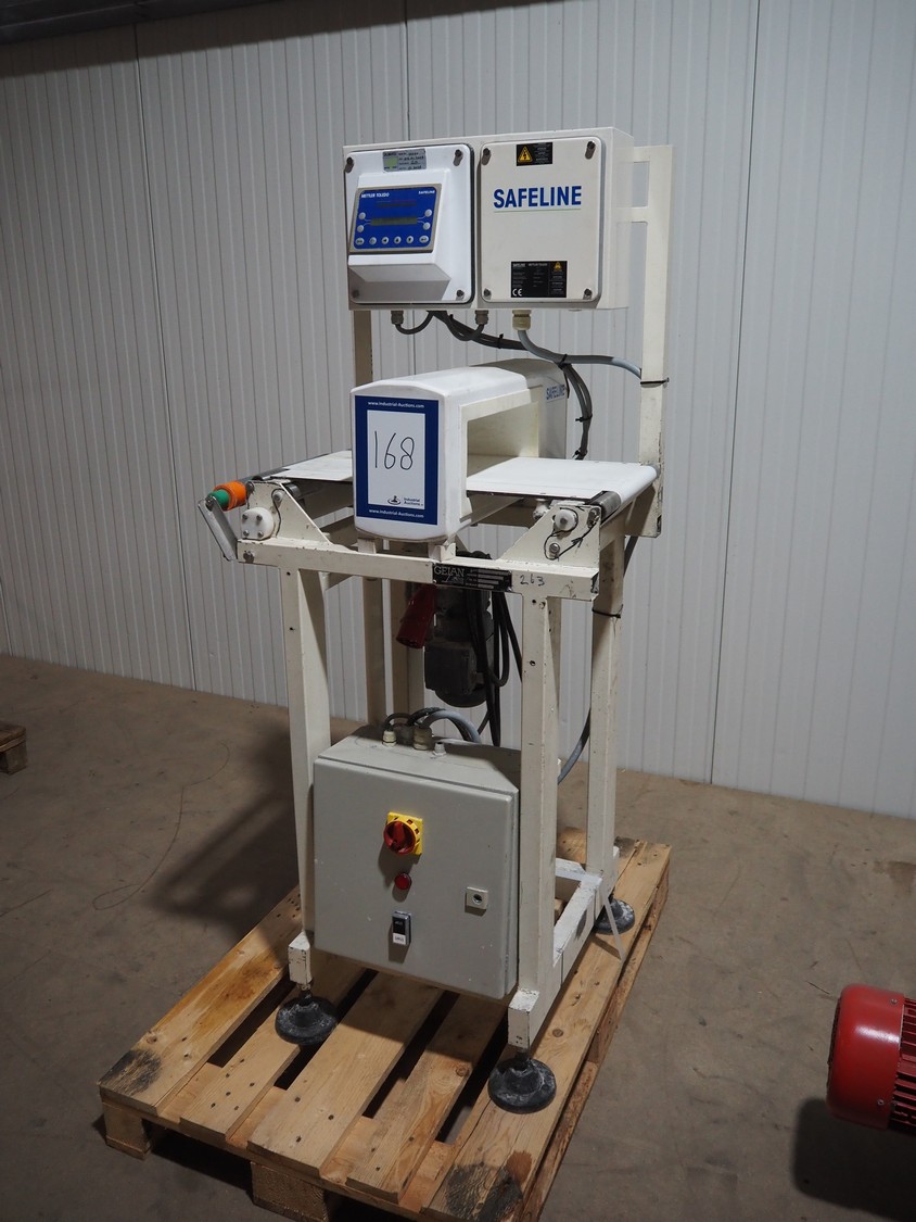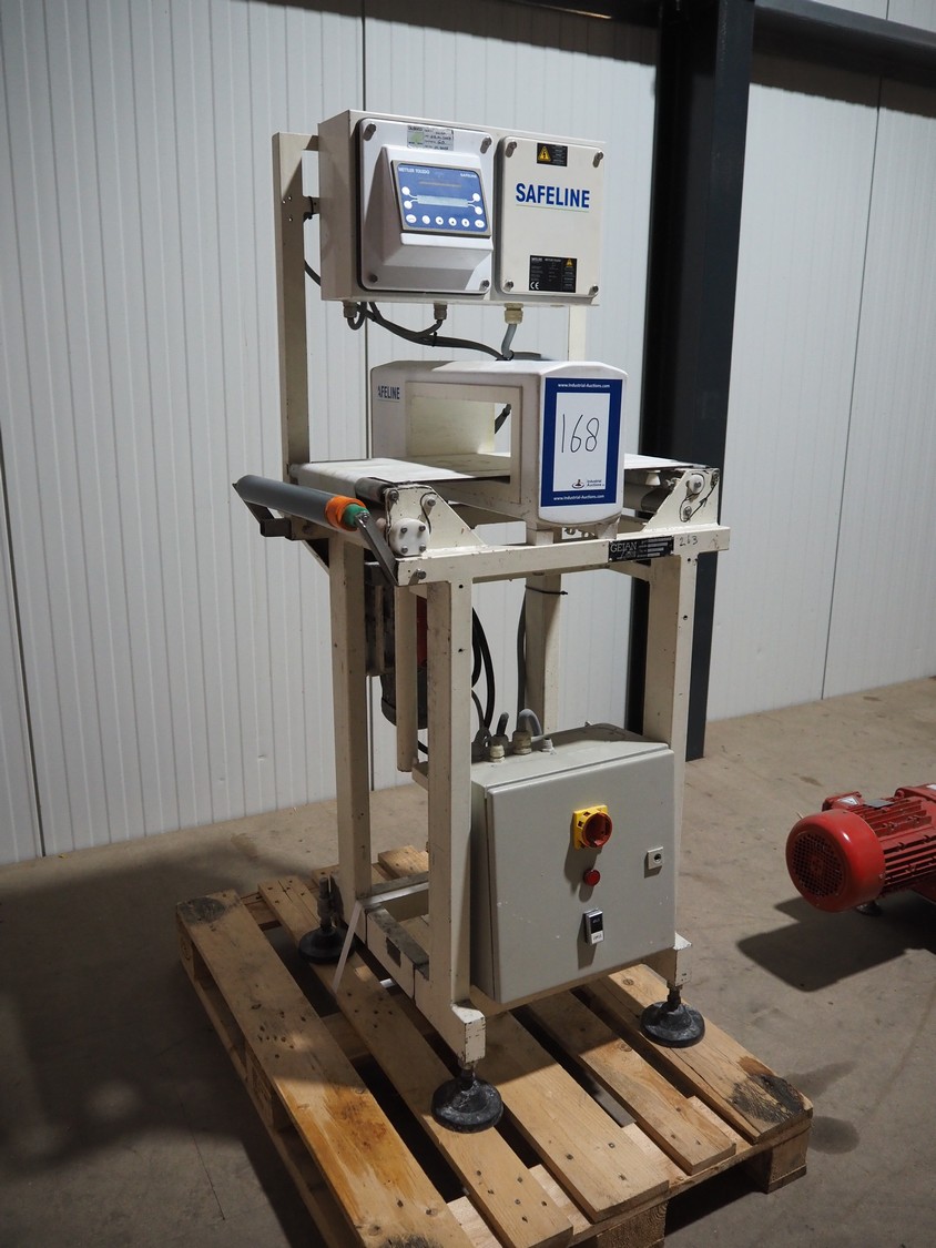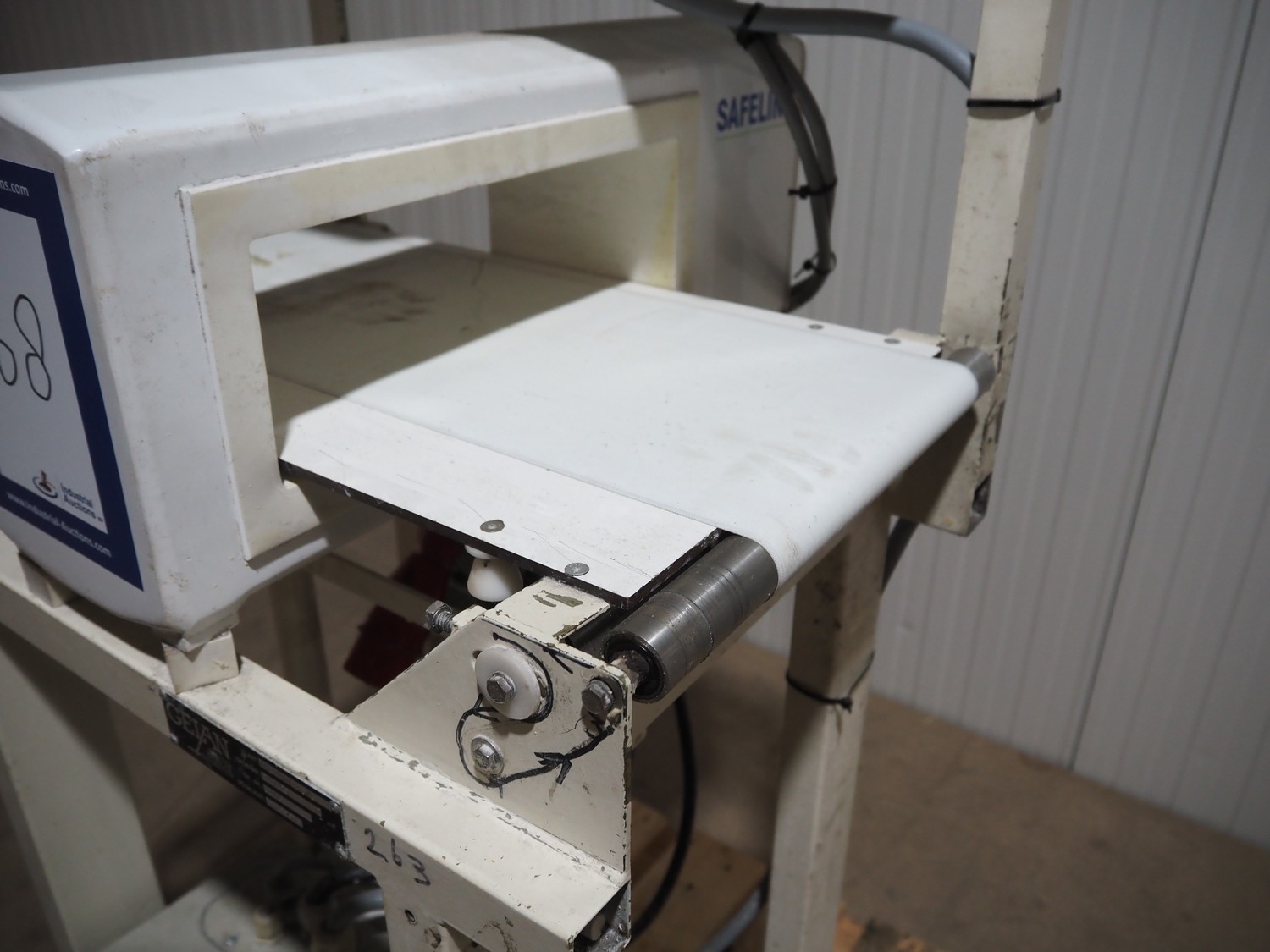 Safeline metal detector, serial number: 119579, plastic belt, belt width: 250 mm, clearance: 350 mm x 110 mm, total dimensions: 700 mm x 650 mm x 1600 mm.