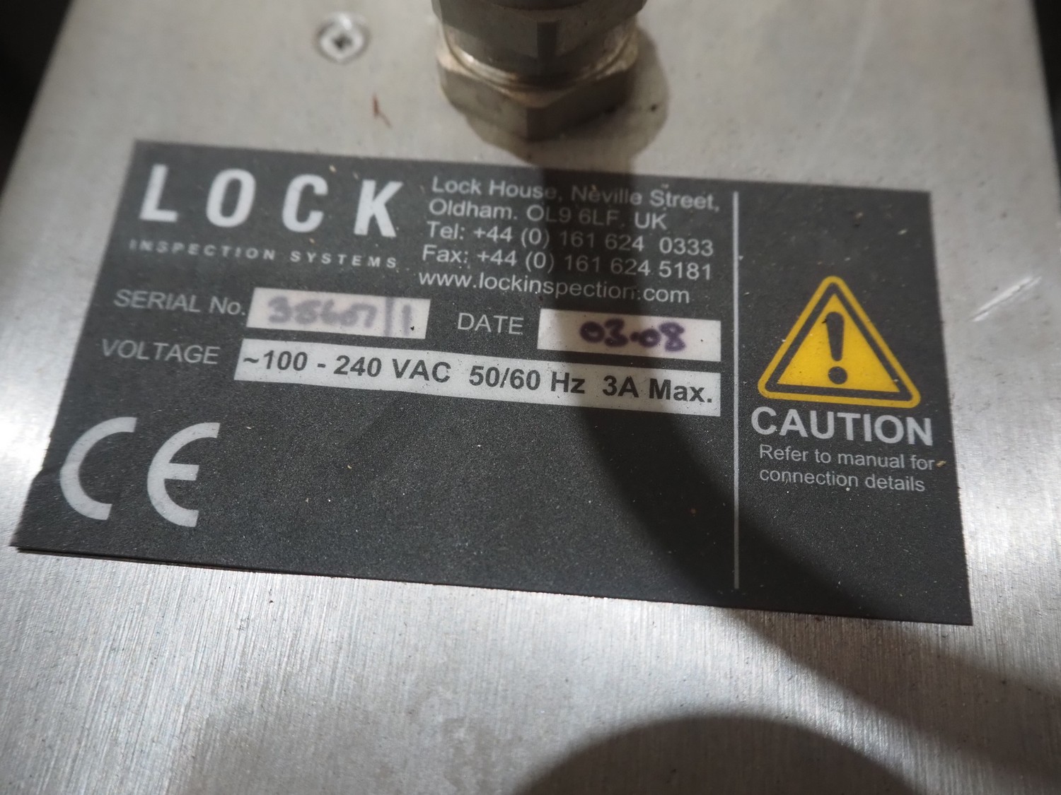Lock Inspection Systems Ltd. pipe line metal detector head, serial number: 35651-1, year of construction: 03-08, 100-240 V, 50/60 Hz, 3 A, diameter pipe: 55 mm, total dimensions: 400 mm x 500 mm x 790 mm.