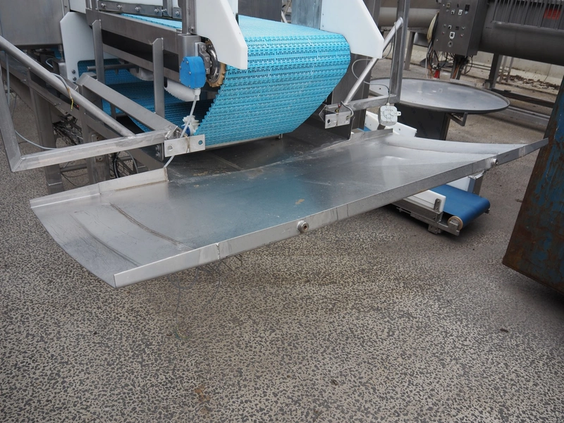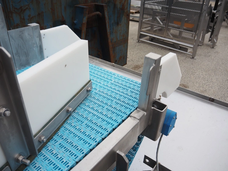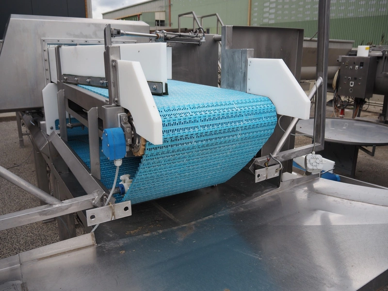 Loma metal detector with rejector, serial number: MH308-100001D, 230 V, 1 Ph, 50 Hz, 0.3 A, year of construction: 2009, plastic mesh belt, belt width: 570 mm, total dimensions: 6800 mm x 1900 mm x 2350 mm.
