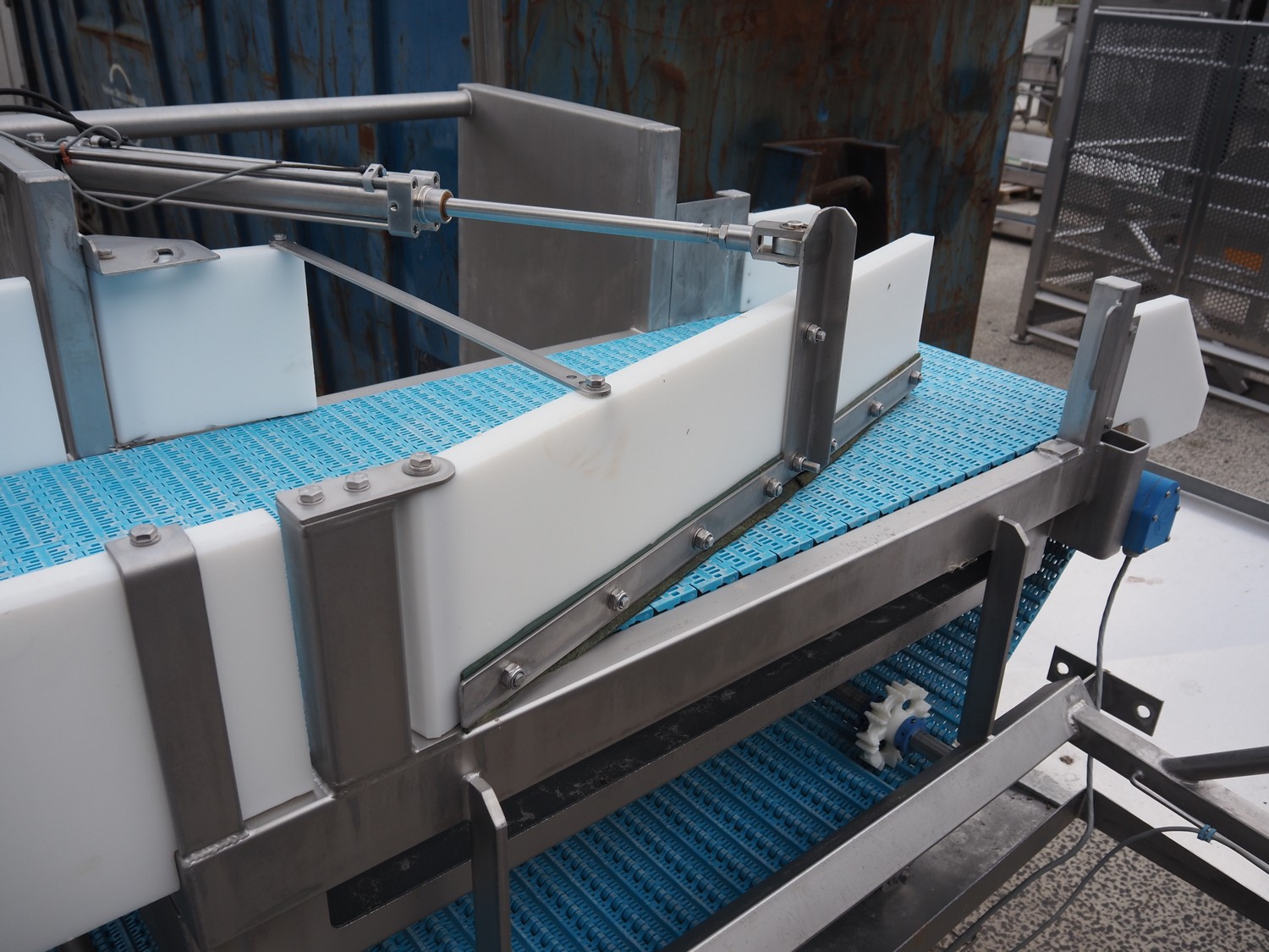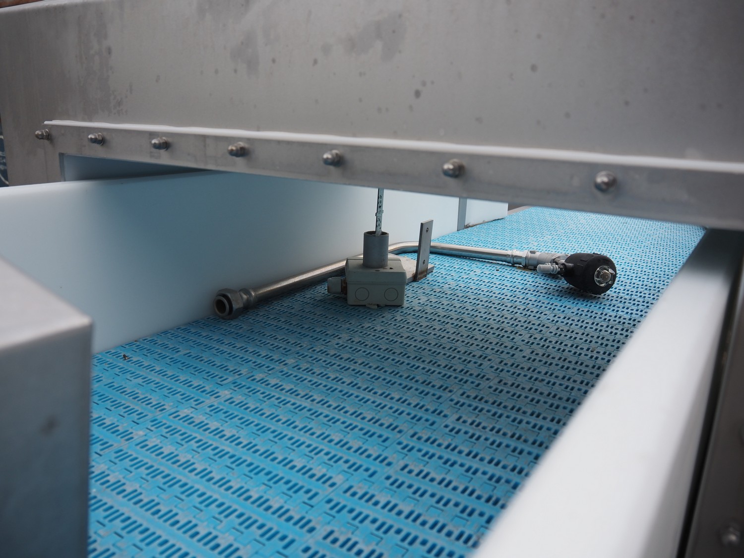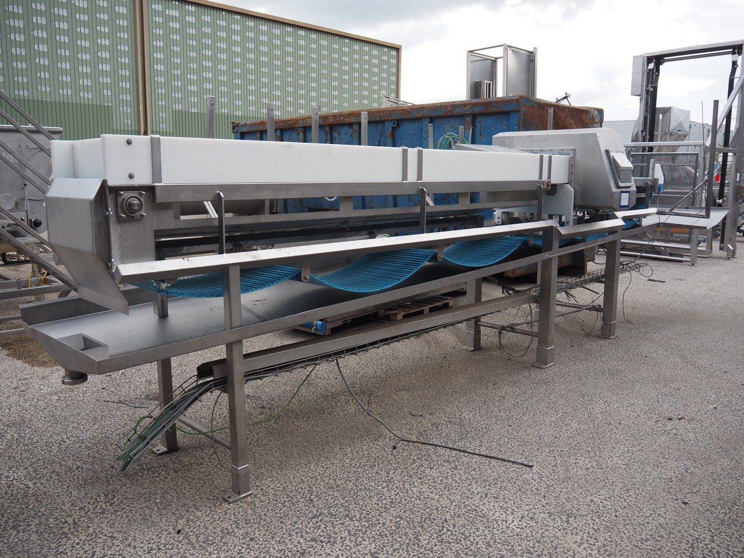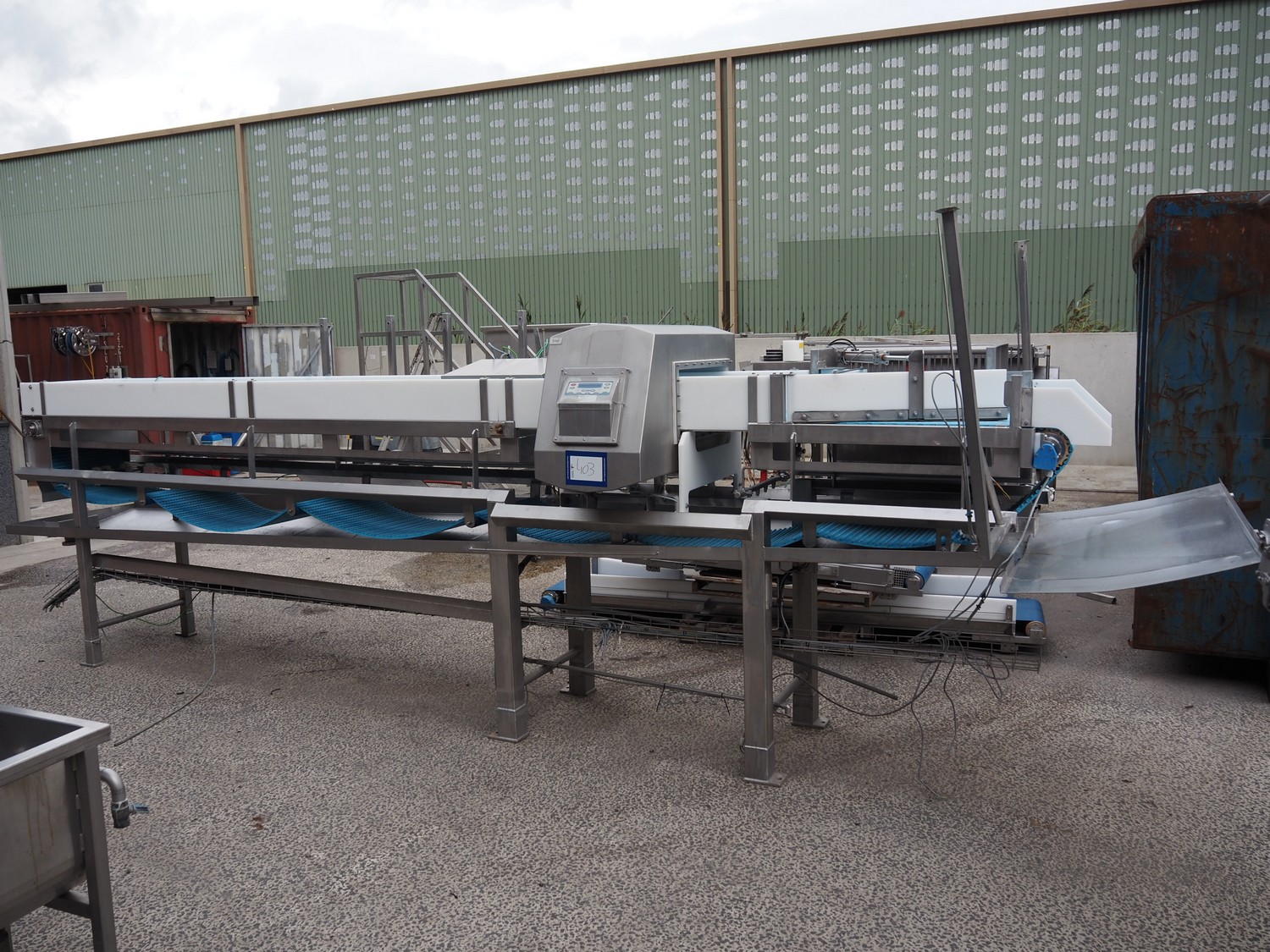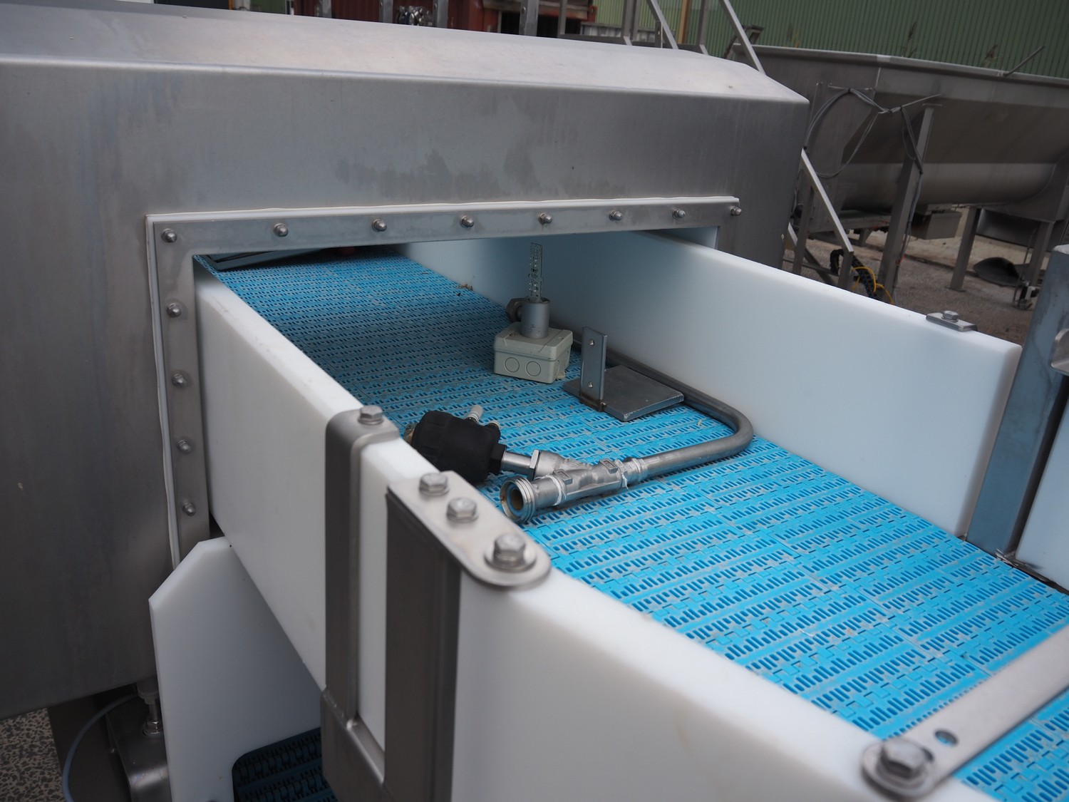 Loma metal detector with rejector, serial number: MH308-100001D, 230 V, 1 Ph, 50 Hz, 0.3 A, year of construction: 2009, plastic mesh belt, belt width: 570 mm, total dimensions: 6800 mm x 1900 mm x 2350 mm.