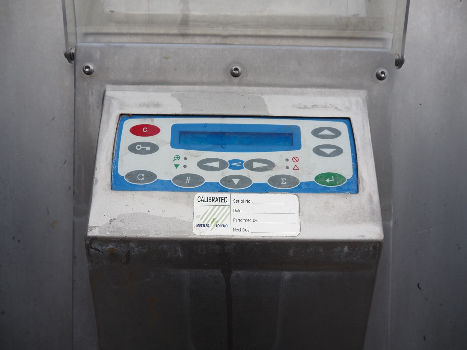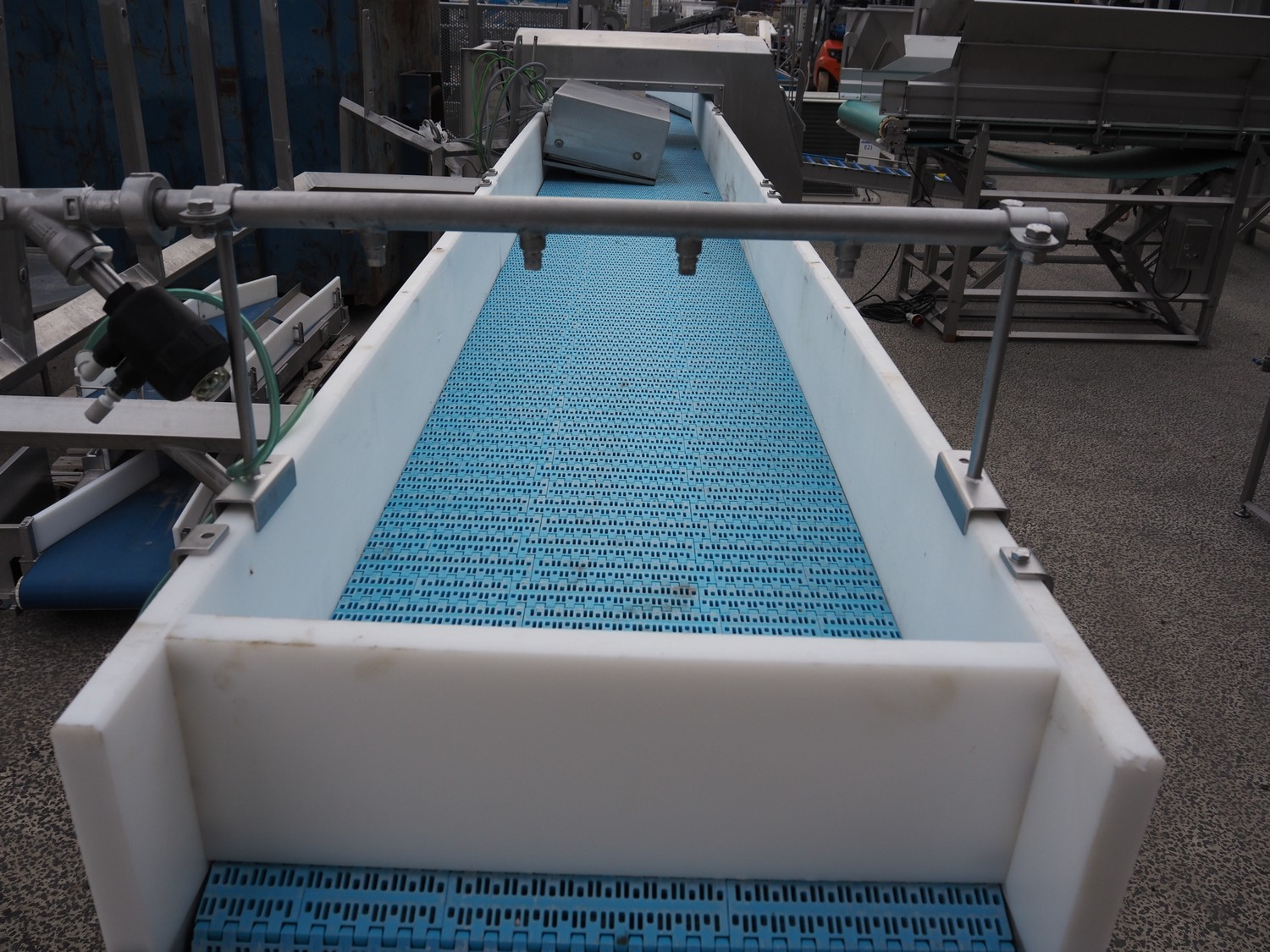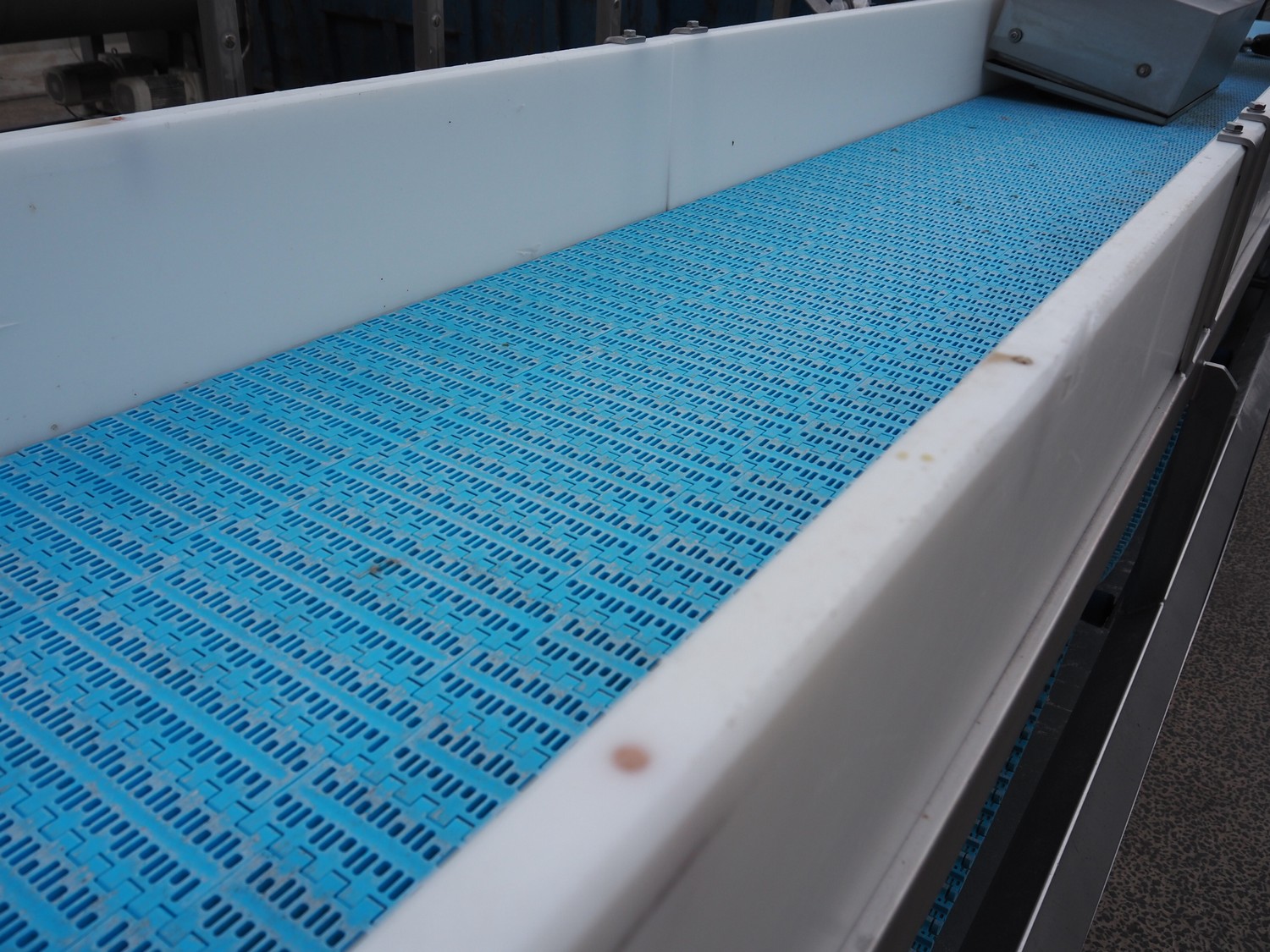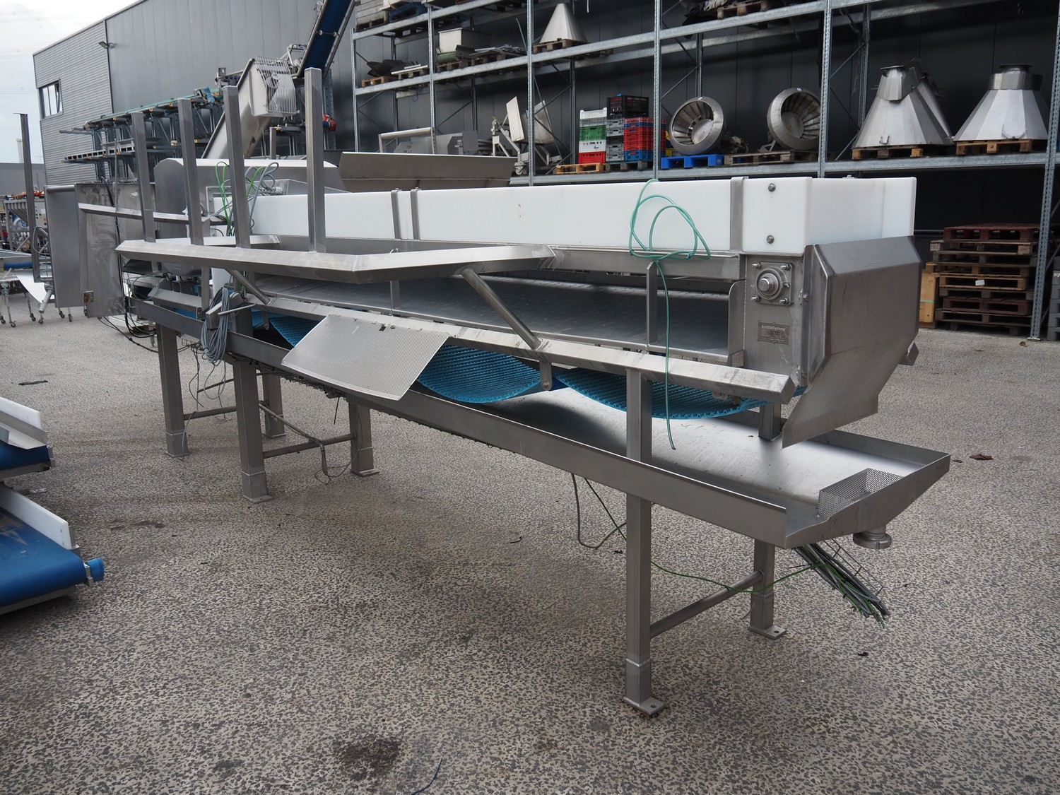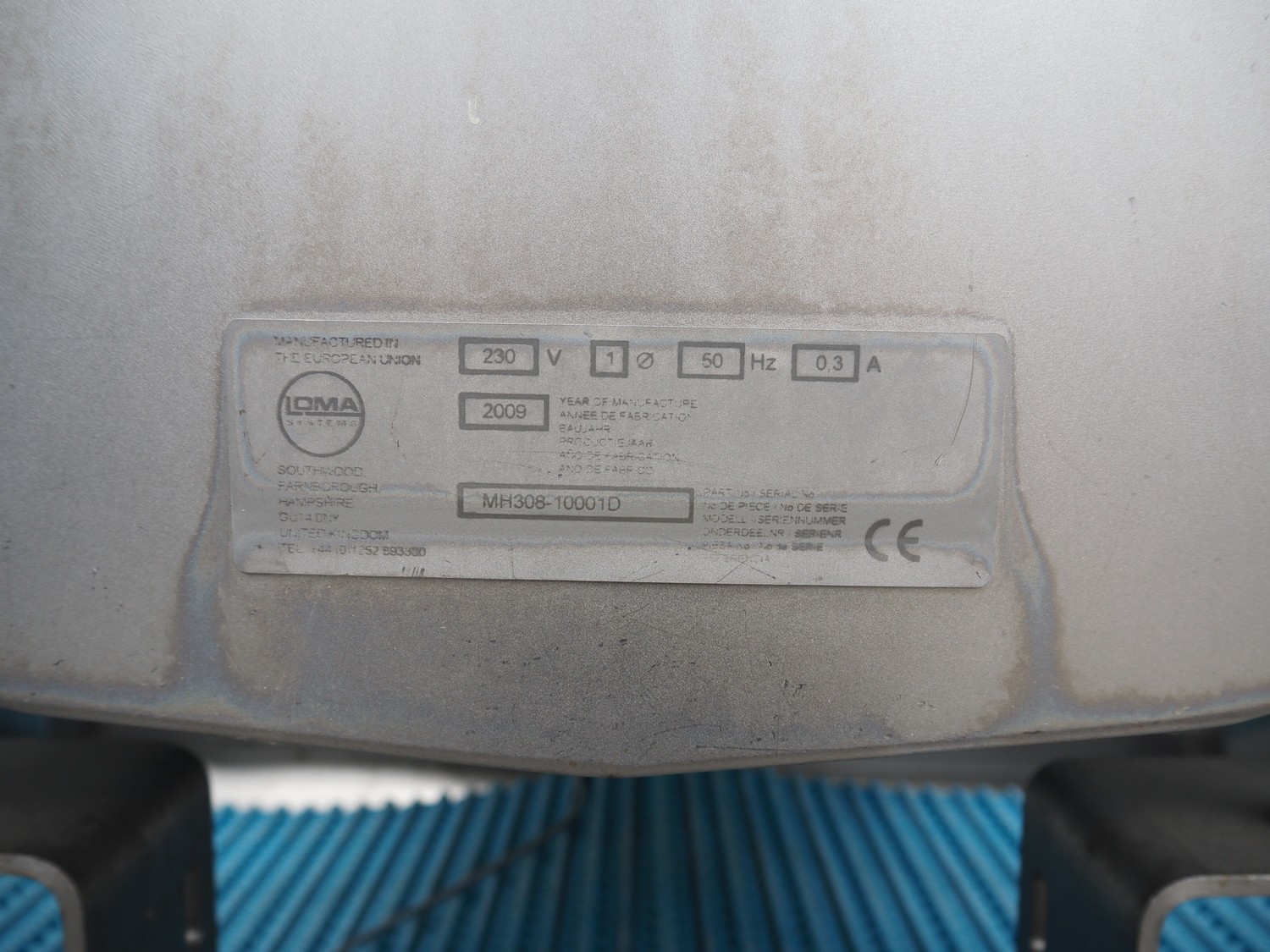 Loma metal detector with rejector, serial number: MH308-100001D, 230 V, 1 Ph, 50 Hz, 0.3 A, year of construction: 2009, plastic mesh belt, belt width: 570 mm, total dimensions: 6800 mm x 1900 mm x 2350 mm.