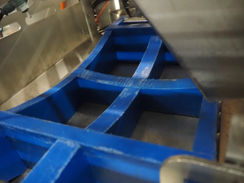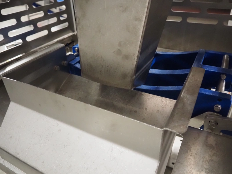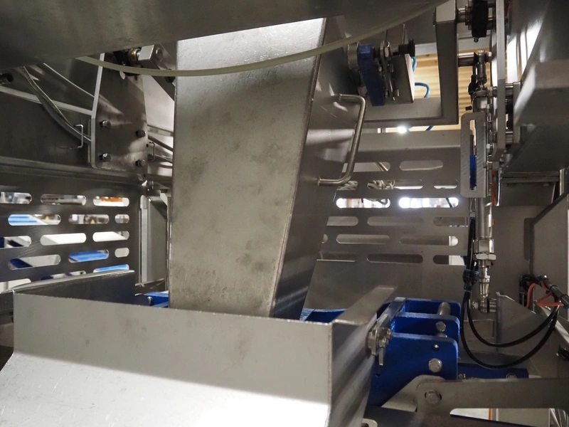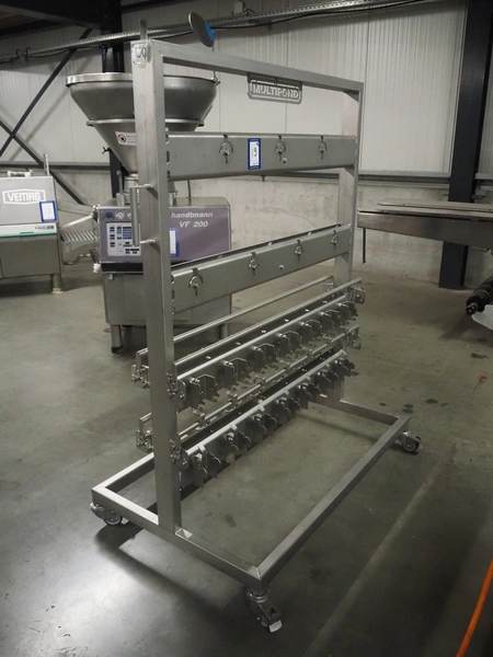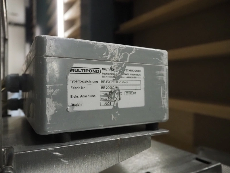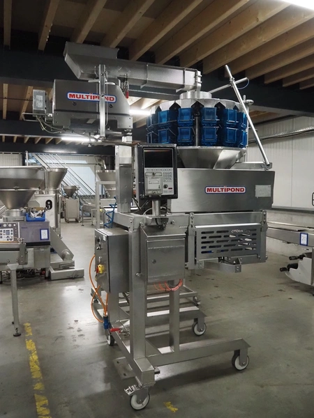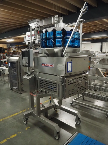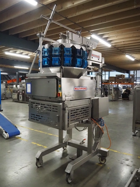 Multipond mobile multihead weigher, 14 heads, type: MP 1401-F, year of construction: 1998, 230 V, 1 Ph, 50 Hz, weighing range: 20 - 100 gram, total dimensions: 2100 mm x 1250 mm x 3250 mm. Including s/s trolley for bins, dimensions trolley: 1450 mm x 800 mm x 1730 mm.