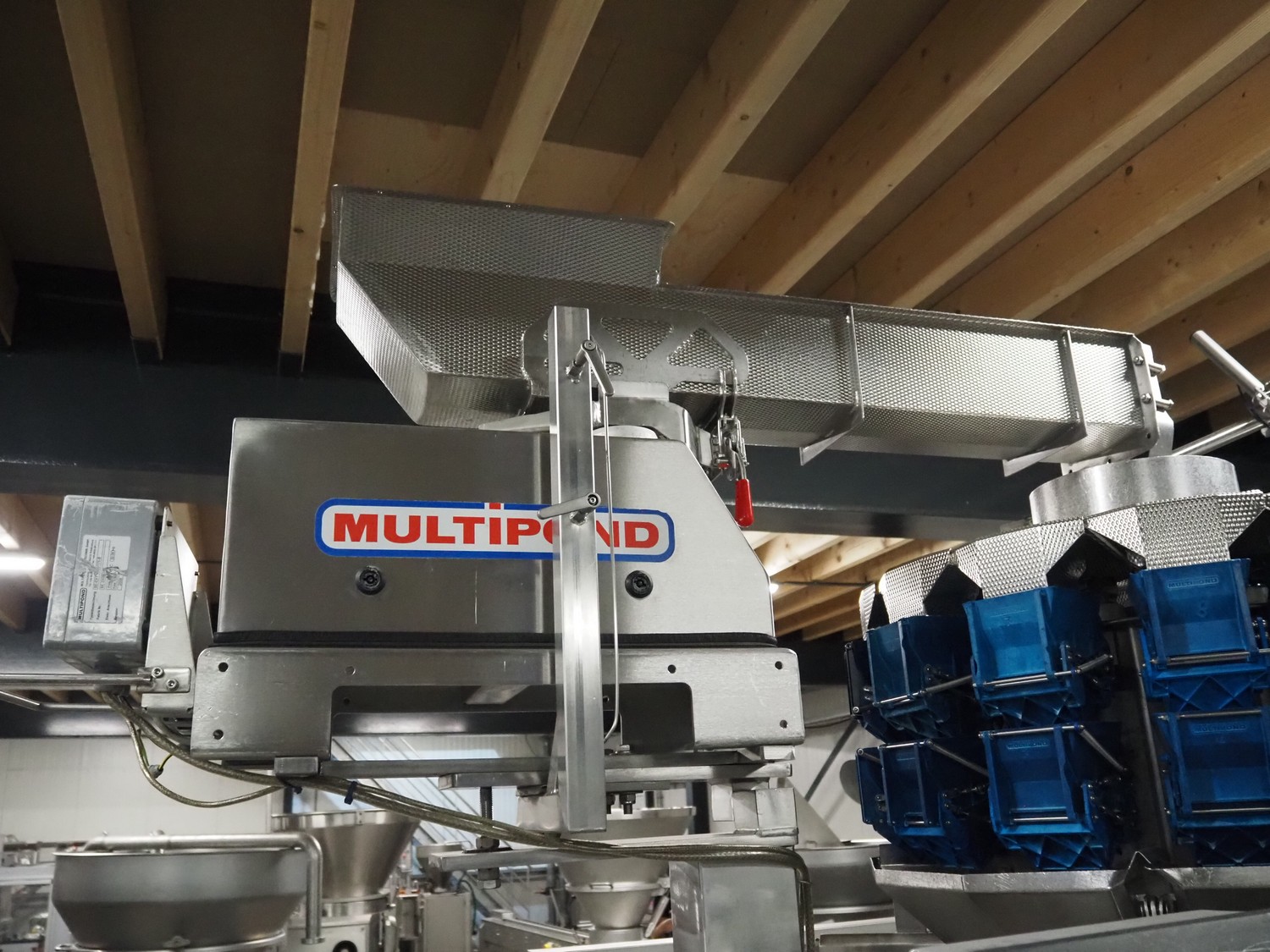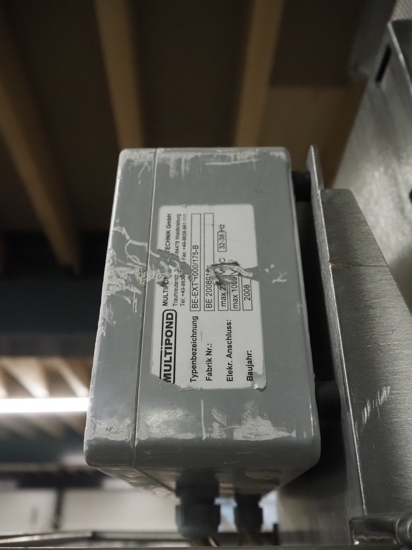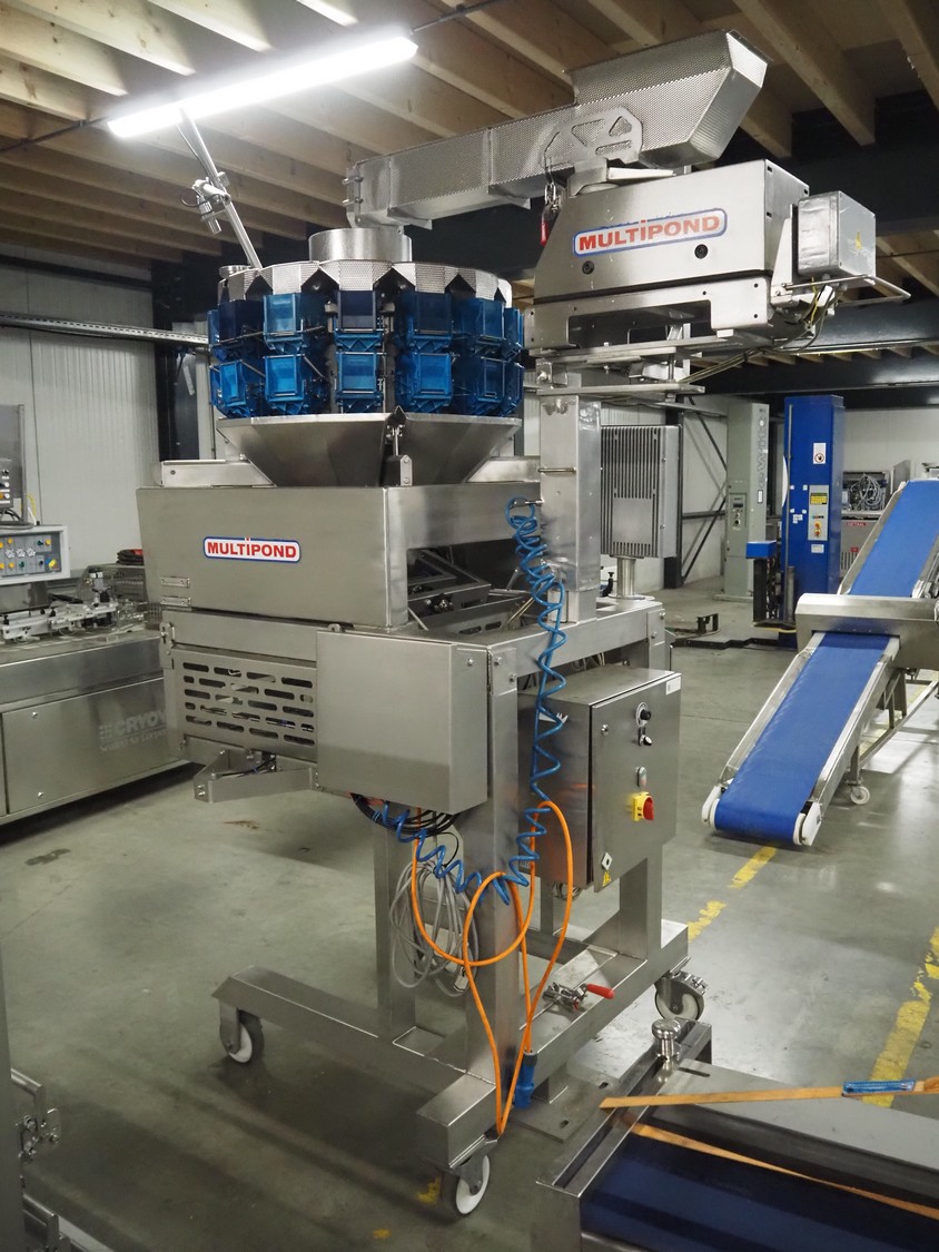 Multipond mobile multihead weigher, 14 heads, type: MP 1401-F, year of construction: 1998, 230 V, 1 Ph, 50 Hz, weighing range: 20 - 100 gram, total dimensions: 2100 mm x 1250 mm x 3250 mm. Including s/s trolley for bins, dimensions trolley: 1450 mm x 800 mm x 1730 mm.