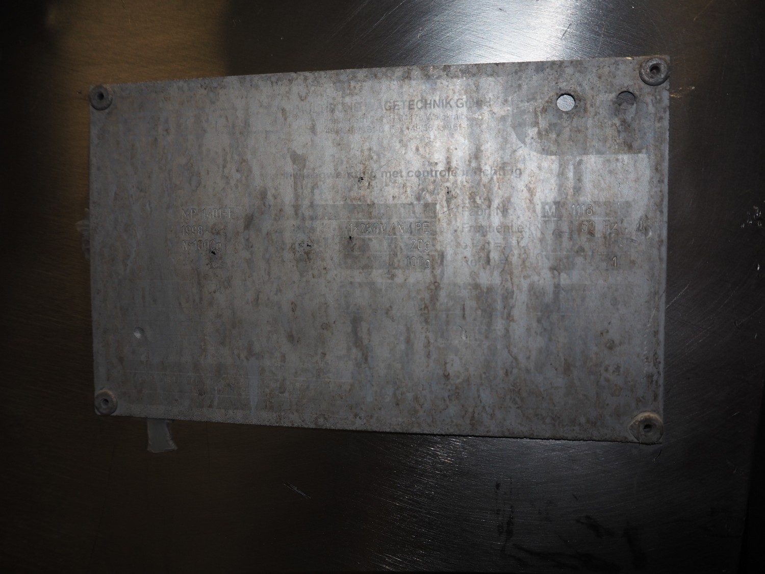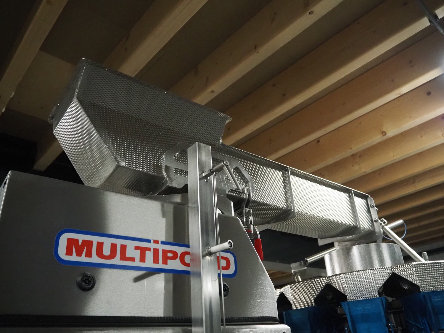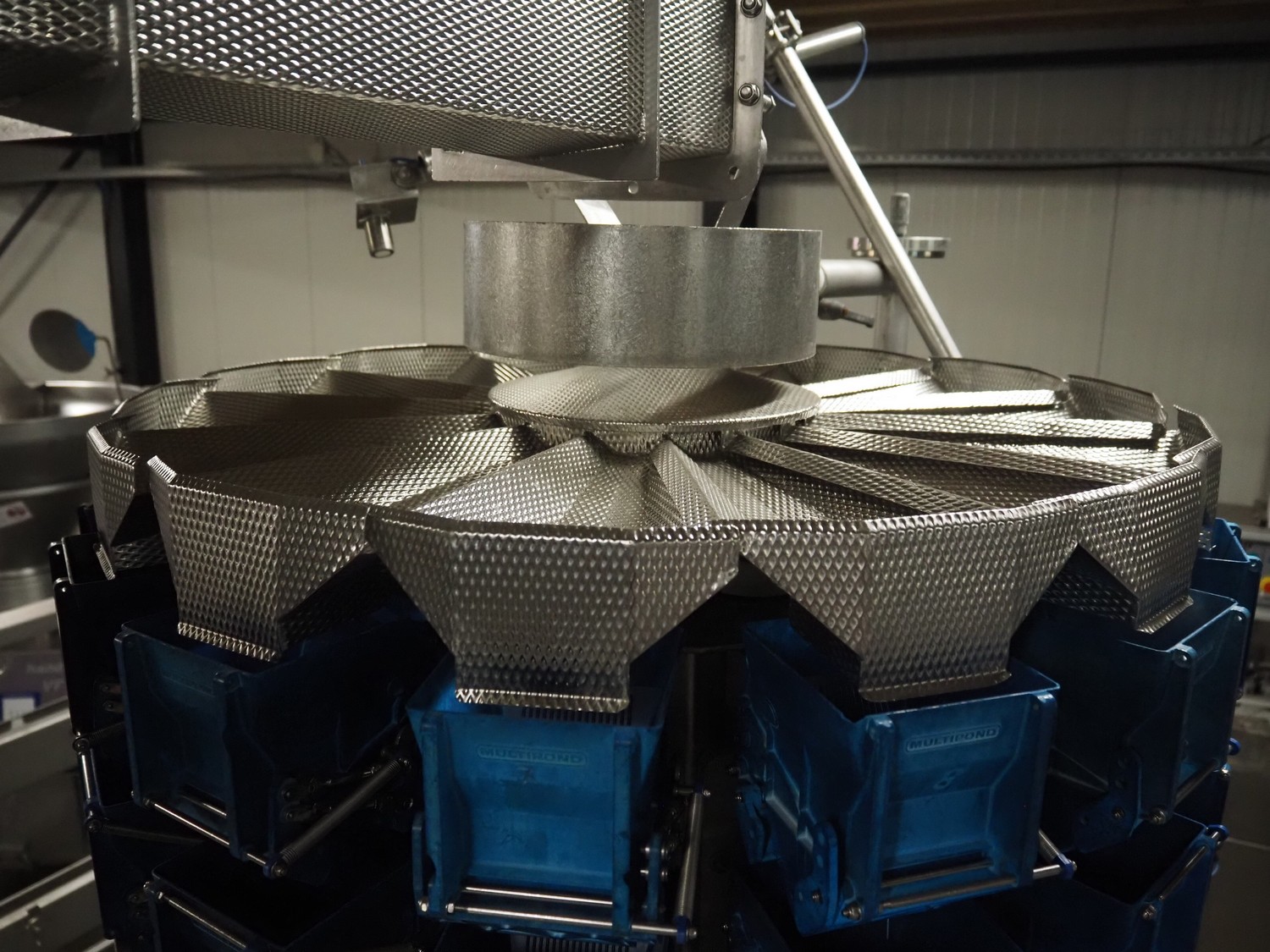 Multipond mobile multihead weigher, 14 heads, type: MP 1401-F, year of construction: 1998, 230 V, 1 Ph, 50 Hz, weighing range: 20 - 100 gram, total dimensions: 2100 mm x 1250 mm x 3250 mm. Including s/s trolley for bins, dimensions trolley: 1450 mm x 800 mm x 1730 mm.