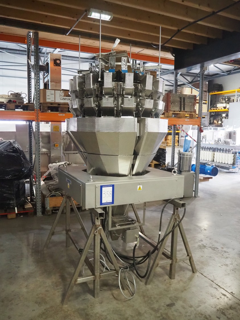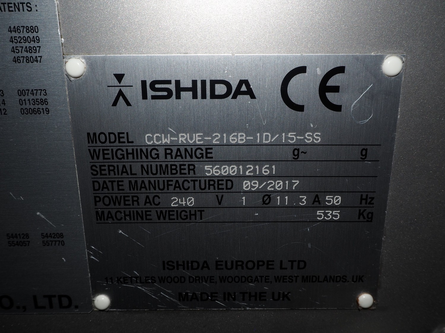 Ishida 16-heads multihead weigher, model: CCW-RVE-216B1D/15-SS, serial number: 560012161, year of construction: 08/2017, 240 V, 1 Ph, 50 Hz, 11.3 A, weight: 535 kg, dimensions: 1750 mm x 1600 mm x 2850 mm.