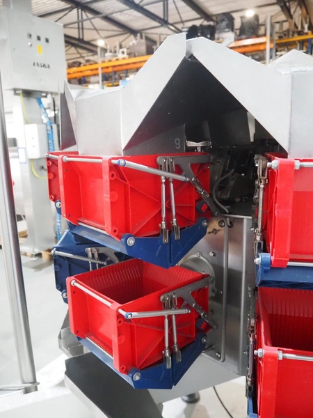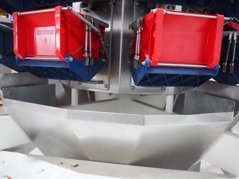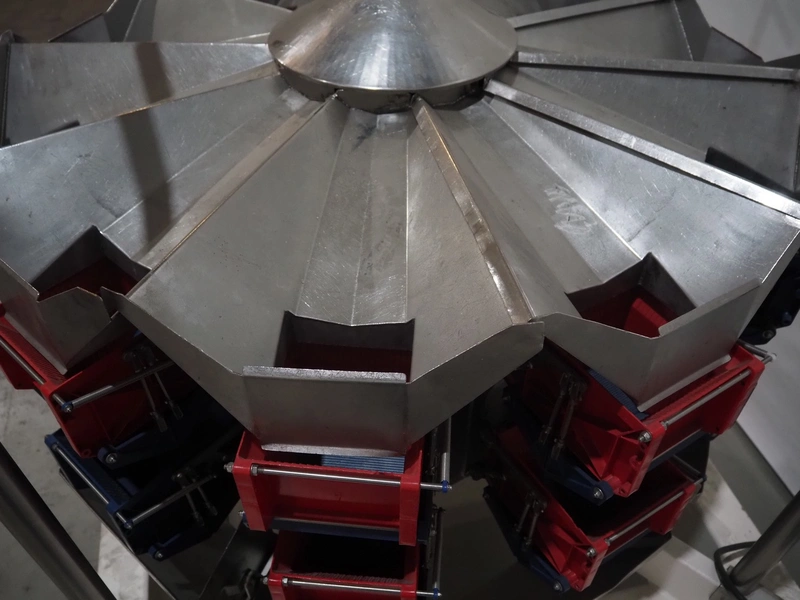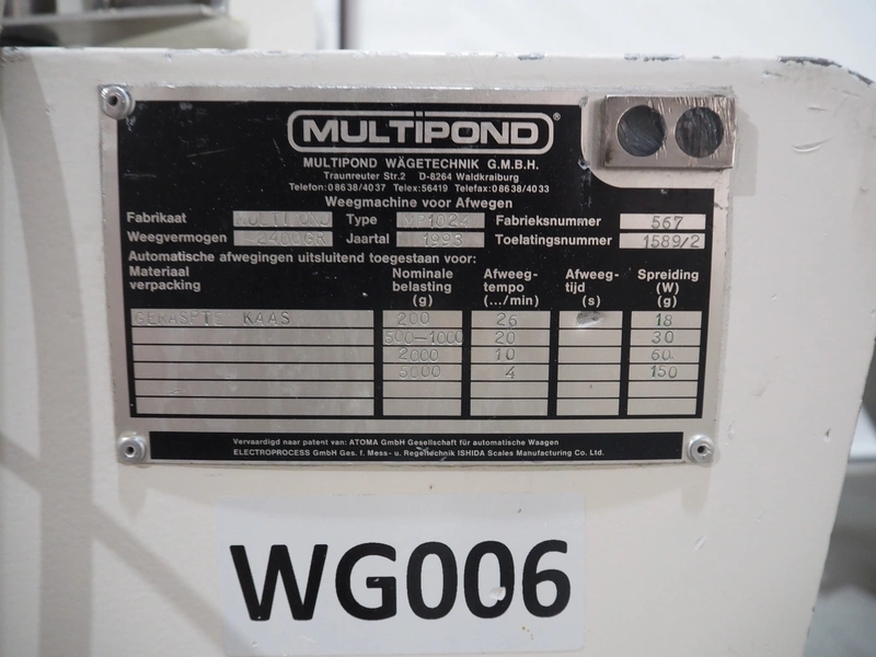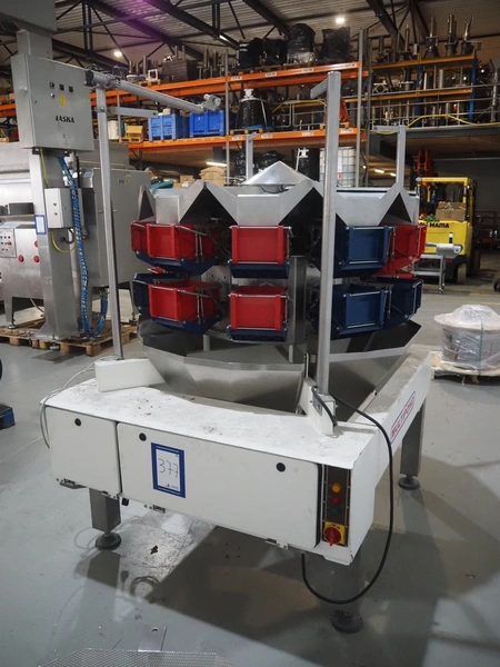 Multipond multihead weigher, 10 heads, type: MP1024, number: 557, year of construction: 1993, weighing capacity: 2400 gram, dimensions: 1560 mm x 1340 mm x 2120 mm. Without control screen.