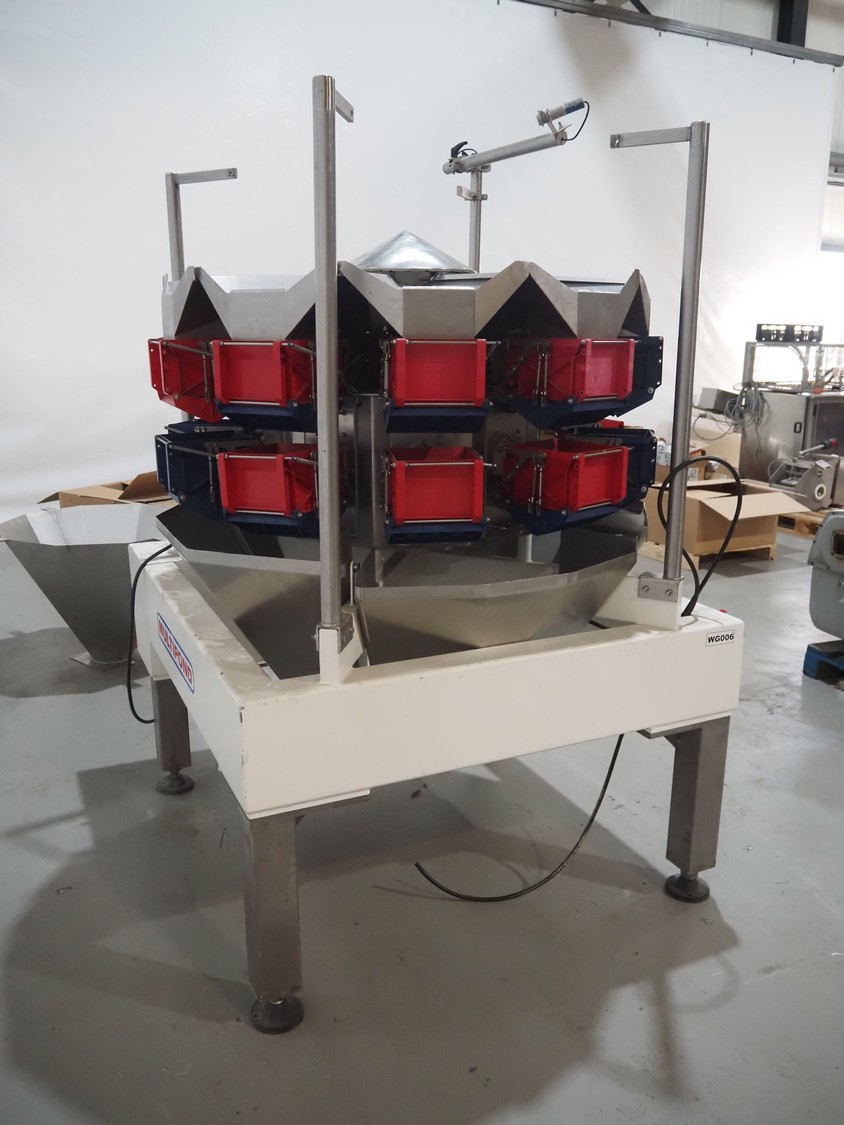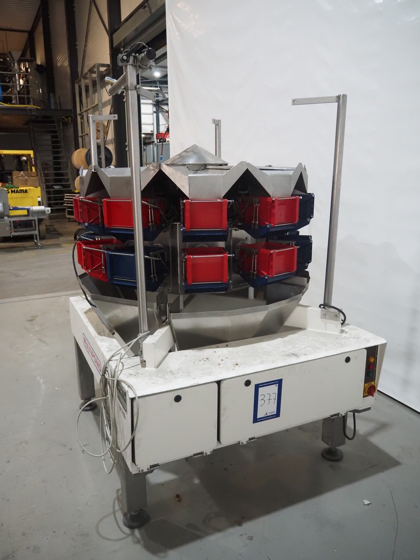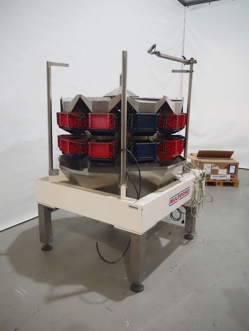 Multipond multihead weigher, 10 heads, type: MP1024, number: 557, year of construction: 1993, weighing capacity: 2400 gram, dimensions: 1560 mm x 1340 mm x 2120 mm. Without control screen.