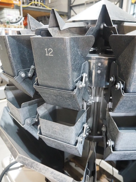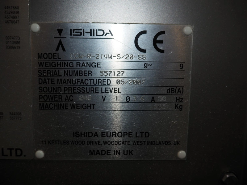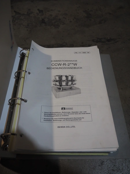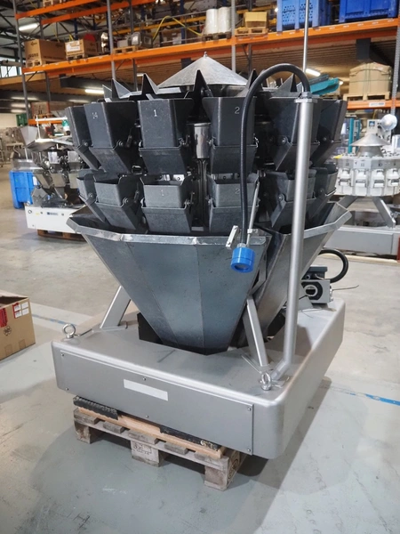 Ishida multihead weigher, 14 heads, model: CCW-R-214W-S/20-SS, serial number: 557127, year of construction: 05/2007, 240 V, 1 Ph, 50 Hz, 3.6 A, machine weight: 645 kg, dimensions: 1150 mm x 1150 mm x 1700 mm. Including pallet box with parts, dimensions: 1200 mm x 800 mm x 540 mm.