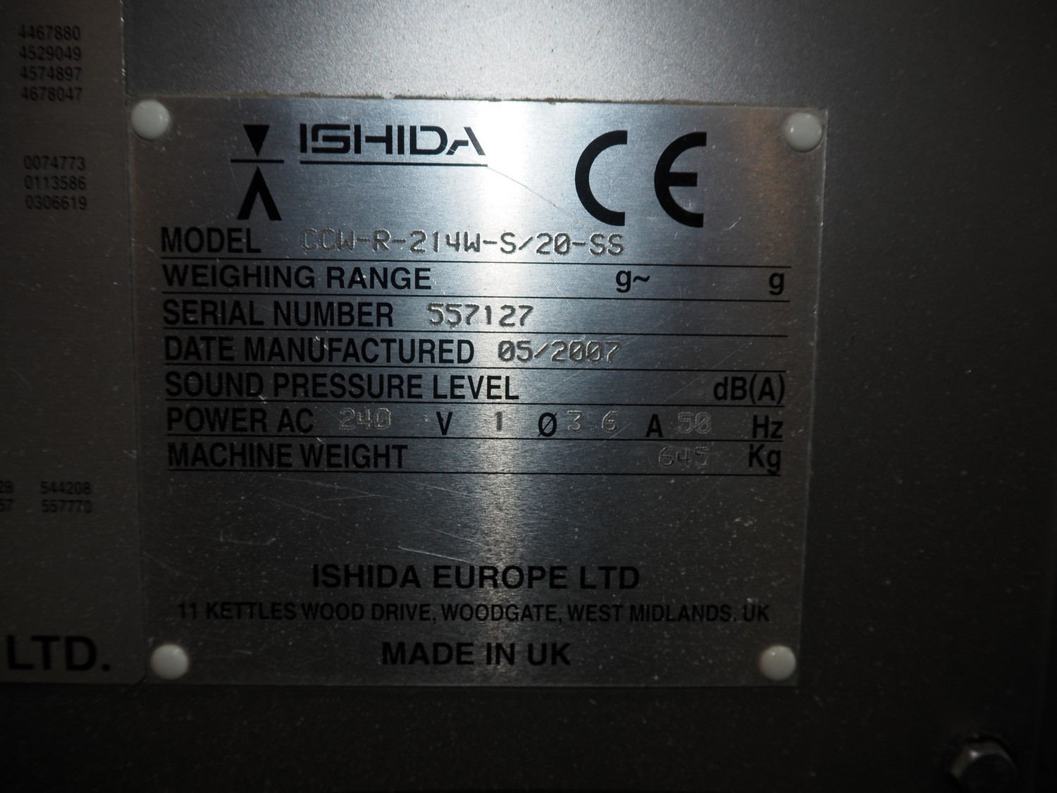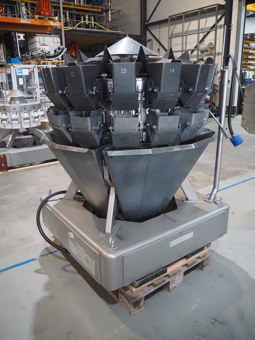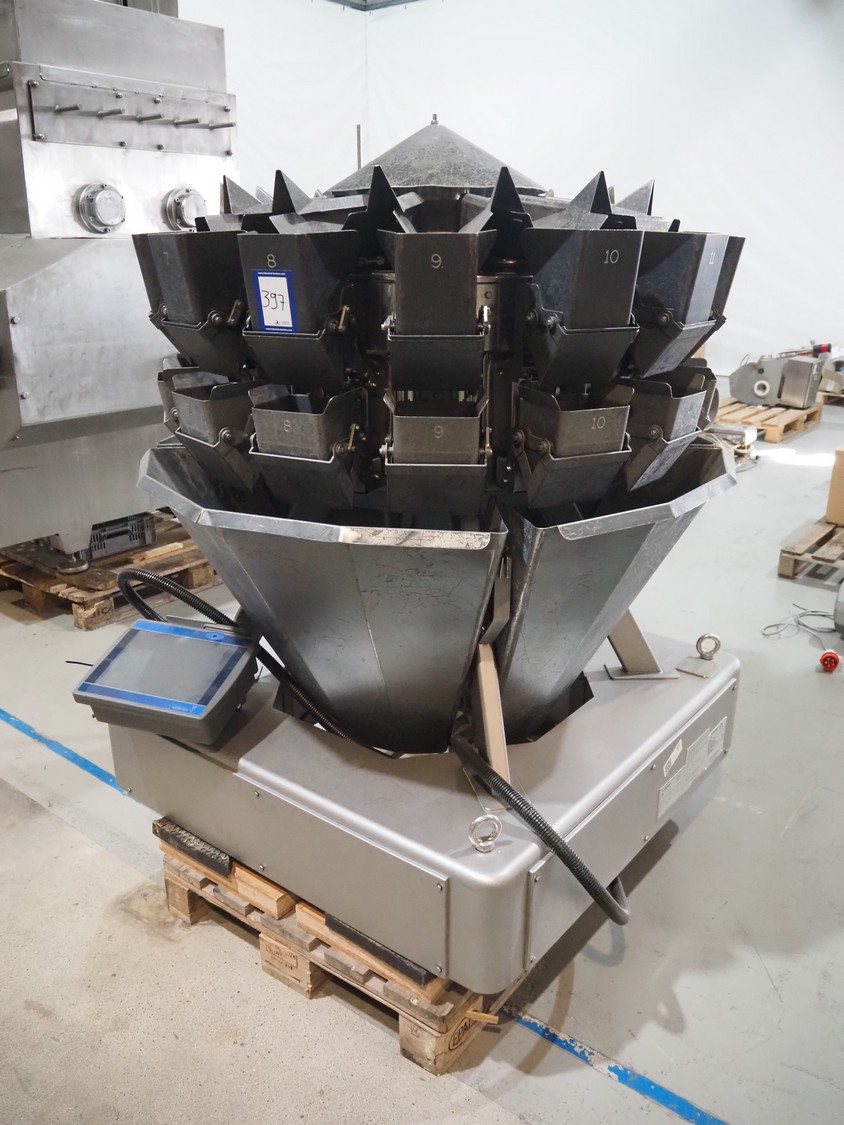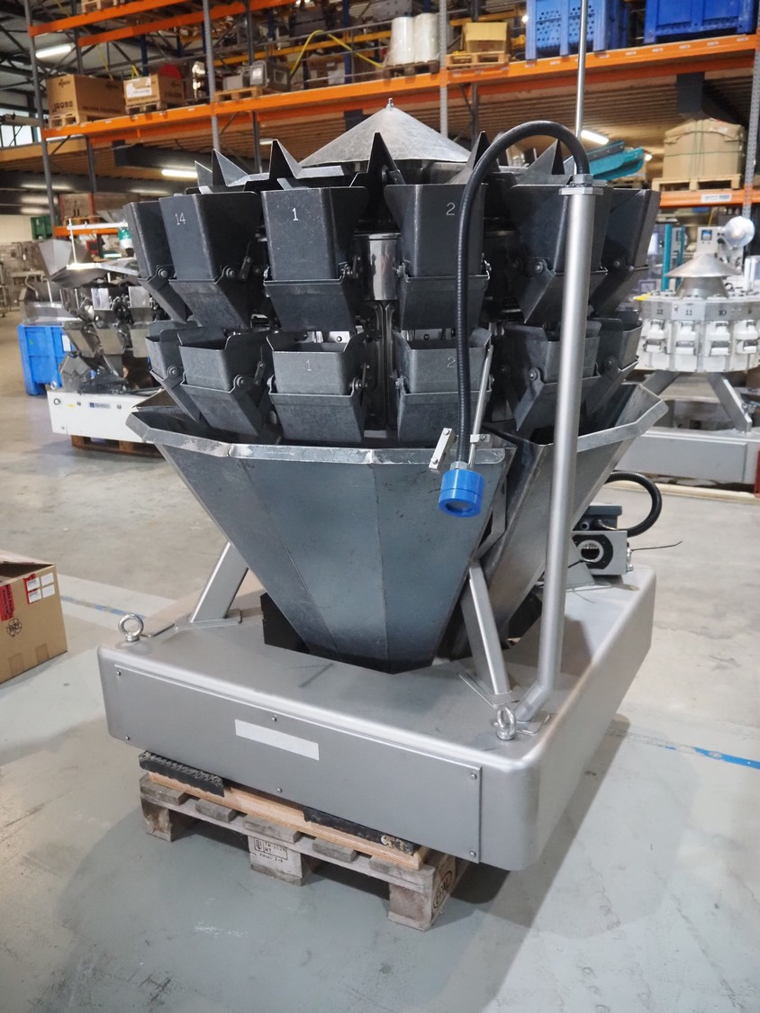 Ishida multihead weigher, 14 heads, model: CCW-R-214W-S/20-SS, serial number: 557127, year of construction: 05/2007, 240 V, 1 Ph, 50 Hz, 3.6 A, machine weight: 645 kg, dimensions: 1150 mm x 1150 mm x 1700 mm. Including pallet box with parts, dimensions: 1200 mm x 800 mm x 540 mm.