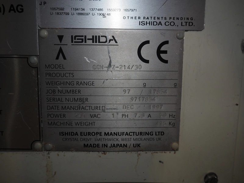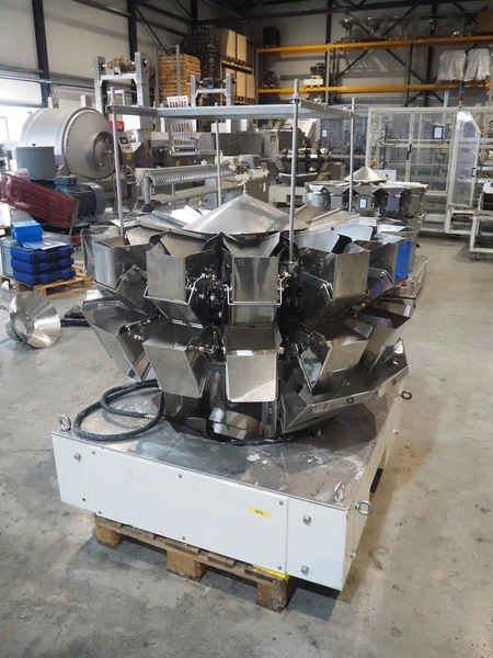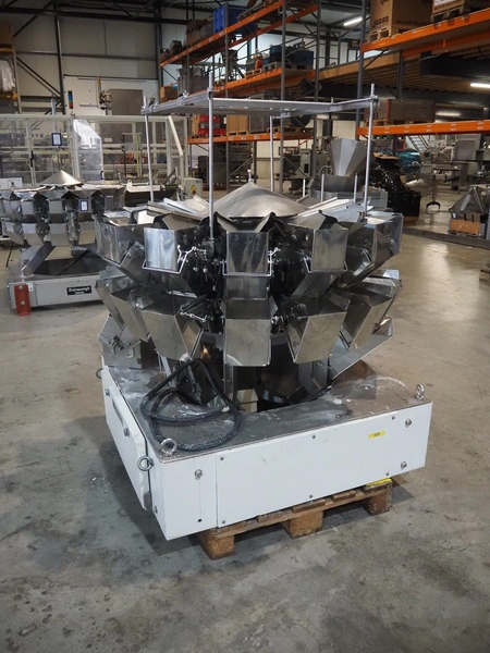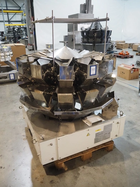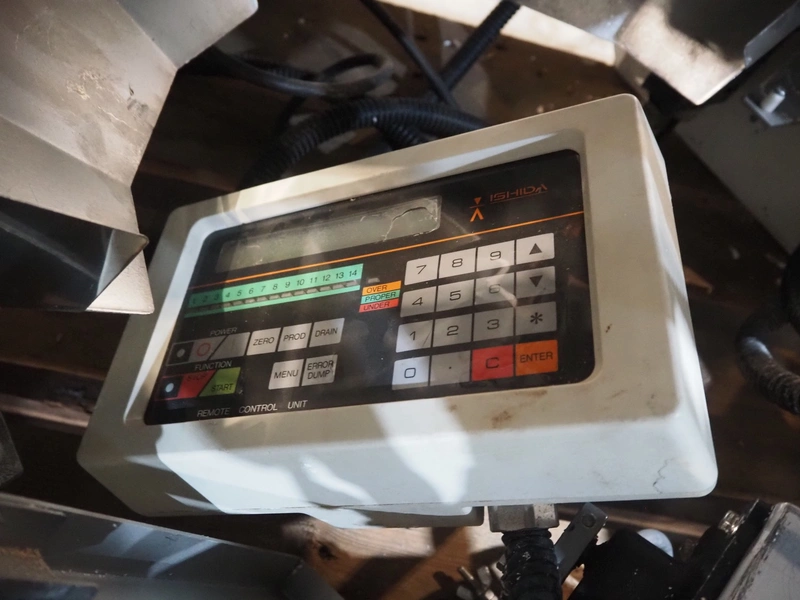 Ishida multihead weigher, 14 heads, model: CCW-Z-214/30, serial number: 9717854, year of construction: 1997, 230 V, 1 Ph, 50 Hz, 7.3 A, weight: 415 kg, dimensions: 1150 mm x 1150 mm x 1700 mm.