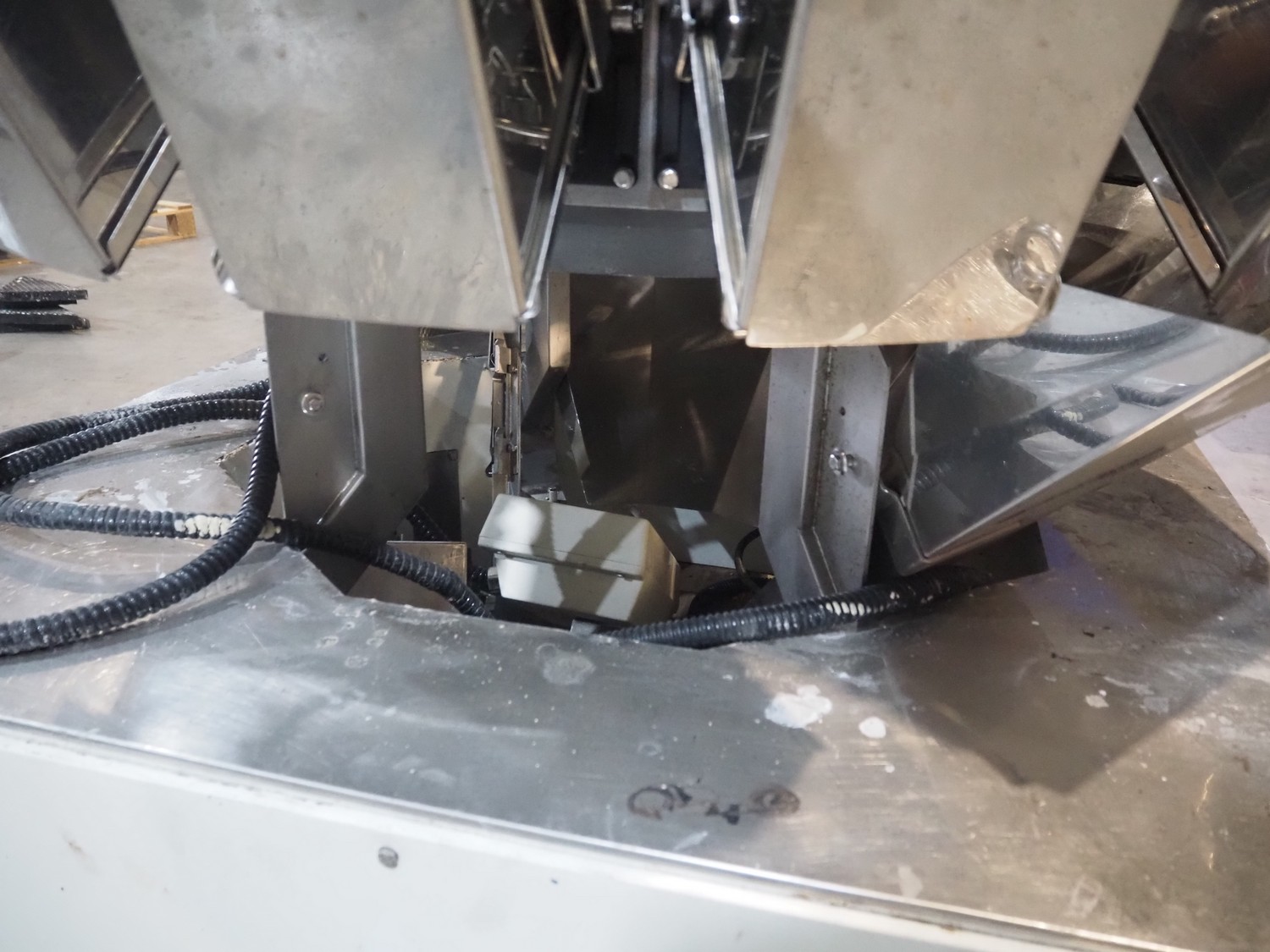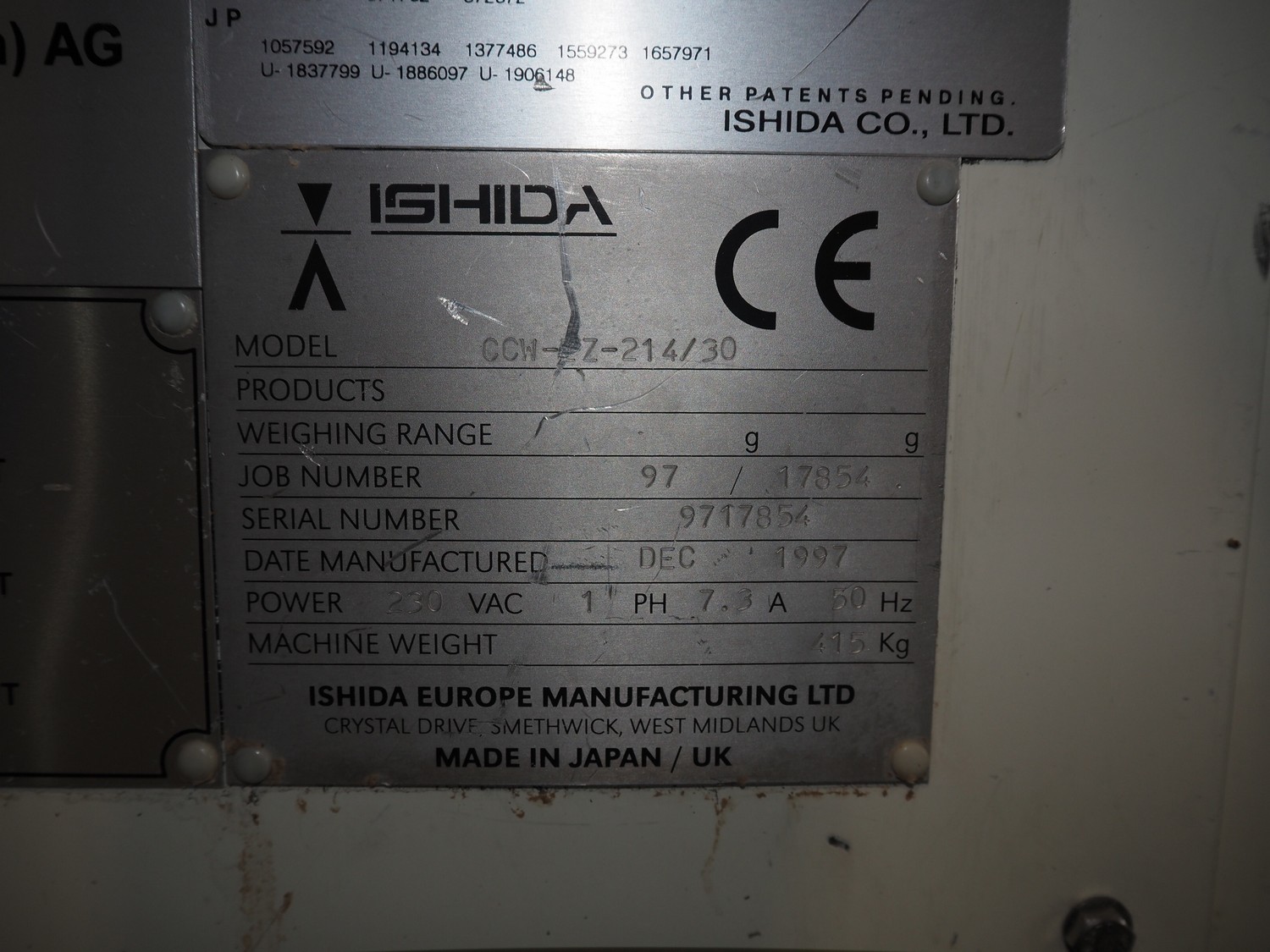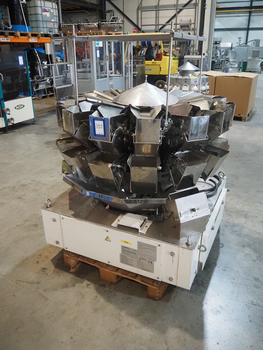 Ishida multihead weigher, 14 heads, model: CCW-Z-214/30, serial number: 9717854, year of construction: 1997, 230 V, 1 Ph, 50 Hz, 7.3 A, weight: 415 kg, dimensions: 1150 mm x 1150 mm x 1700 mm.