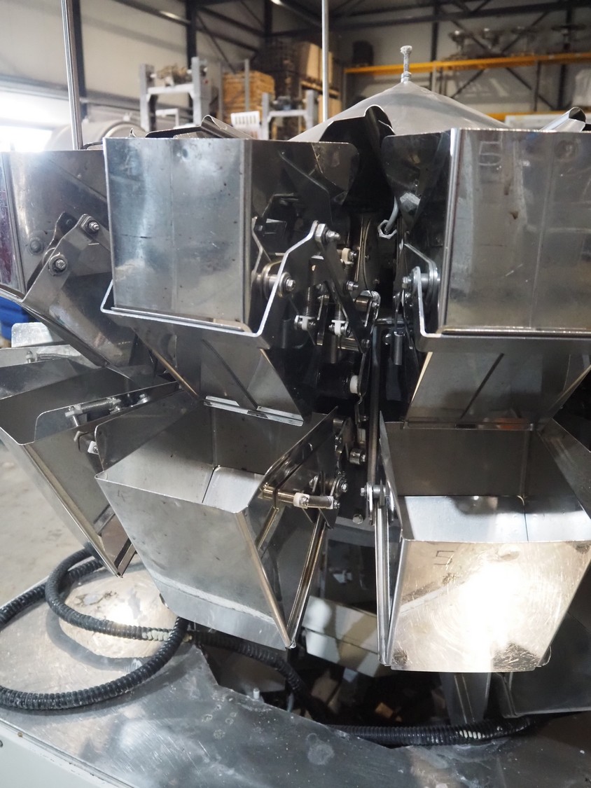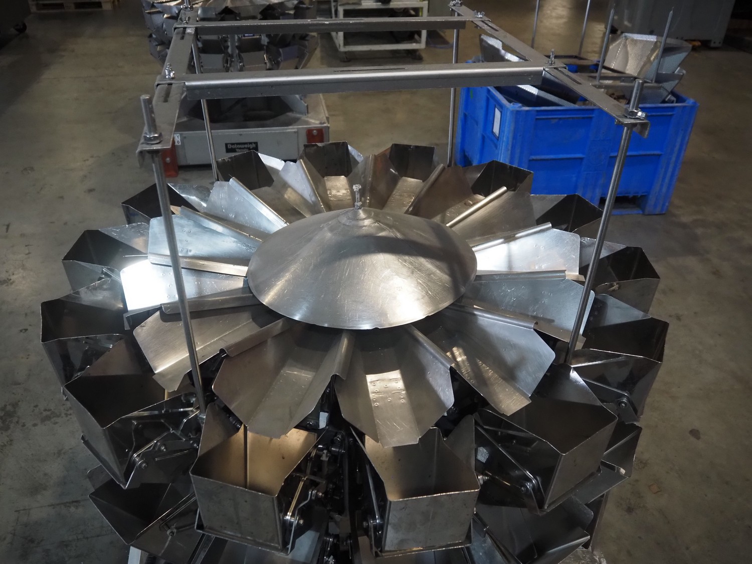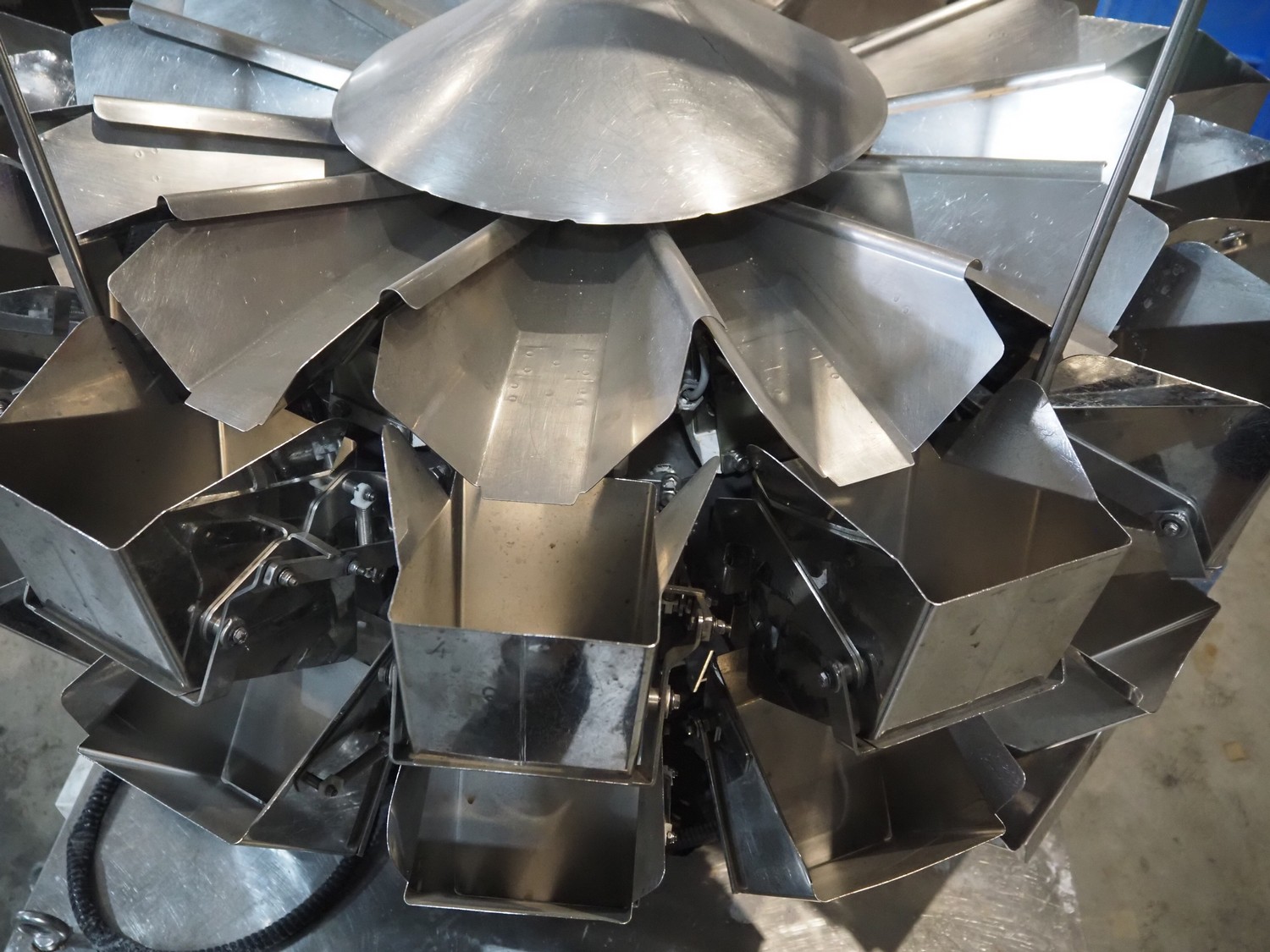 Ishida multihead weigher, 14 heads, model: CCW-Z-214/30, serial number: 9717854, year of construction: 1997, 230 V, 1 Ph, 50 Hz, 7.3 A, weight: 415 kg, dimensions: 1150 mm x 1150 mm x 1700 mm.