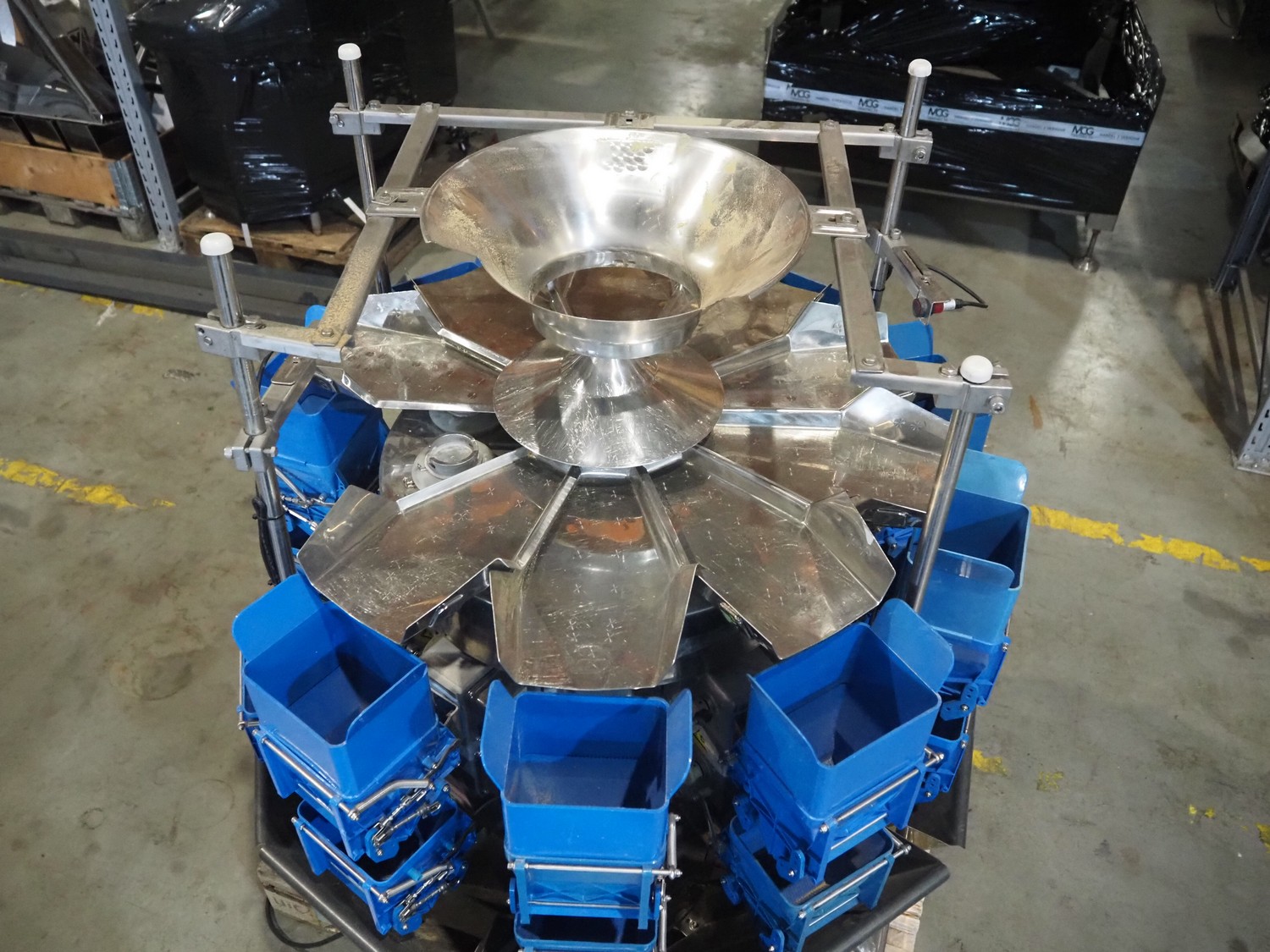 10-heads multihead weigher, dimensions: 1150 mm x 1150 mm x 1450 mm.