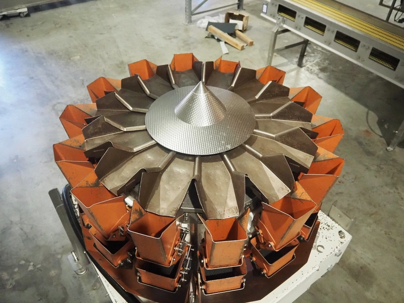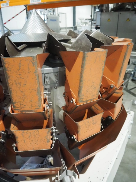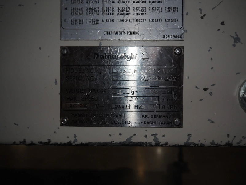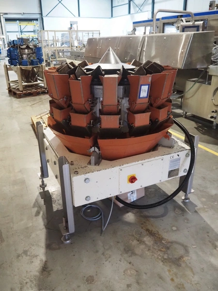 Yamato Scale Gmbh/Dataweigh 14-heads multihead weigher, model: ADW-414SD, serial number: WG020347, 220-240 V, 1Ph, 50/60 Hz, 5 A, weight range: 8-1000 gram, dimensions: 13000 mm x 1200 mm x 1600 mm.