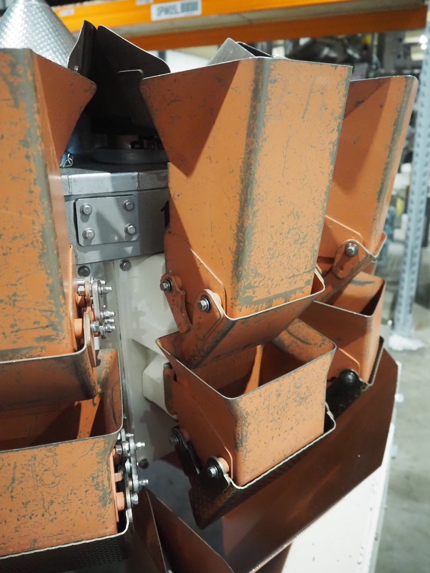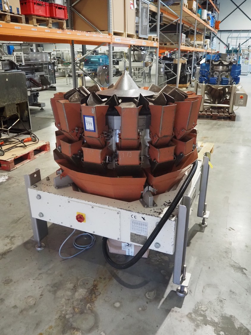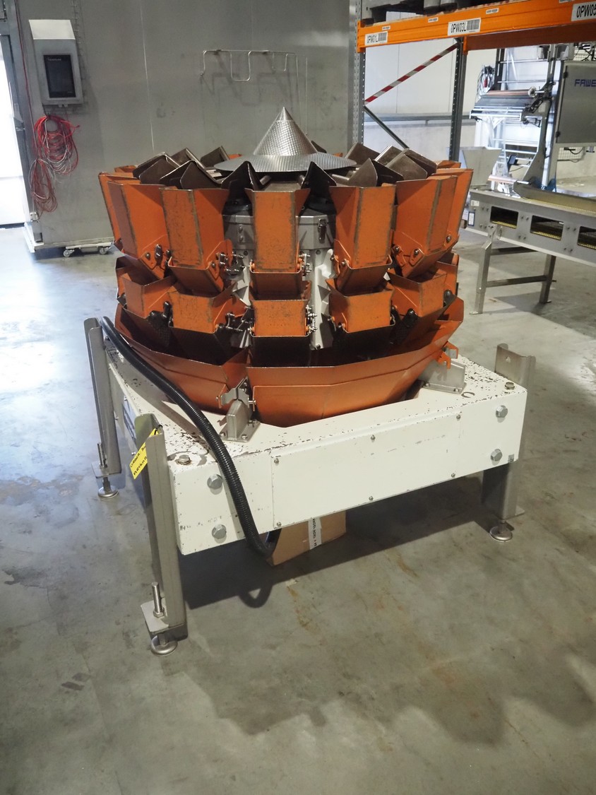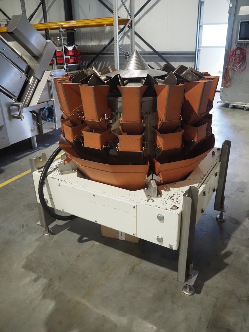 Yamato Scale Gmbh/Dataweigh 14-heads multihead weigher, model: ADW-414SD, serial number: WG020347, 220-240 V, 1Ph, 50/60 Hz, 5 A, weight range: 8-1000 gram, dimensions: 13000 mm x 1200 mm x 1600 mm.