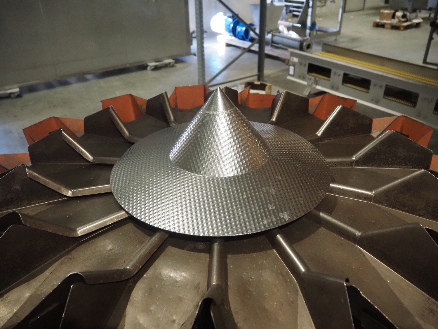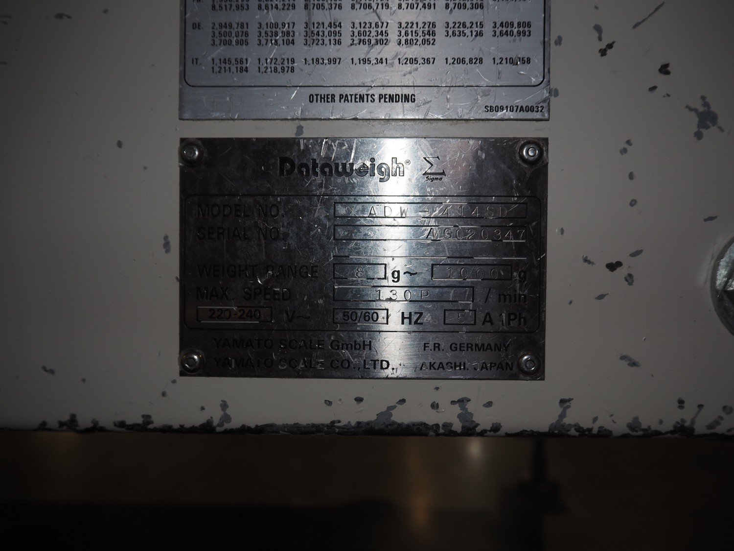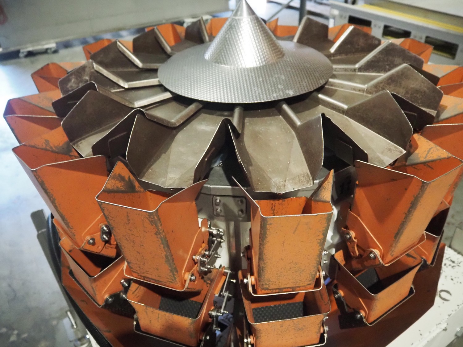 Yamato Scale Gmbh/Dataweigh 14-heads multihead weigher, model: ADW-414SD, serial number: WG020347, 220-240 V, 1Ph, 50/60 Hz, 5 A, weight range: 8-1000 gram, dimensions: 13000 mm x 1200 mm x 1600 mm.