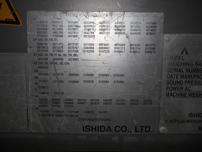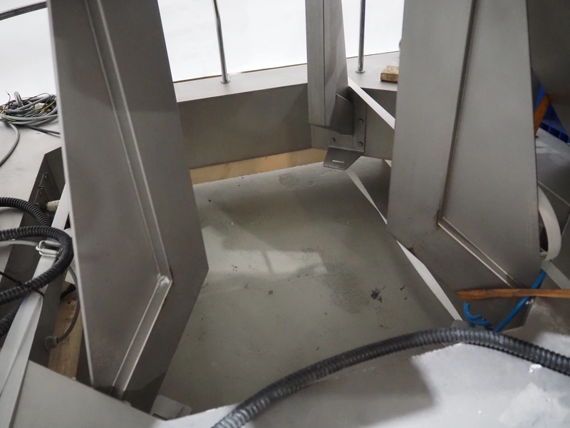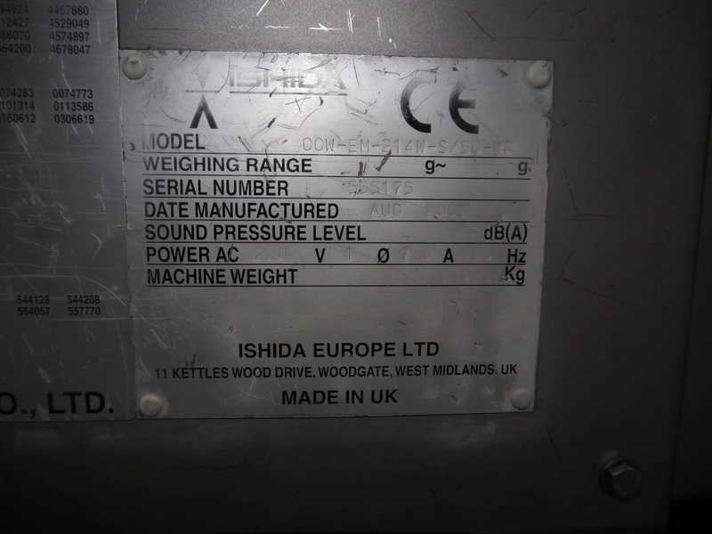 Ishida 14-heads multihead weigher, model: CCW-EM-214W-S/50-WR, serial number: 555175, year of construction: 2005, 220 V, 1 Ph, 50 Hz, 7 A, weight: 920 kg, dimensions: 1850 mm x 1700 mm x 2200 mm. Including pallet box with parts, dimensions pallet box: 1200 mm x 1000 mm x 1250 mm. Including s/s trolley, dimensions: 1710 mm x 700 mm x 2000 mm.