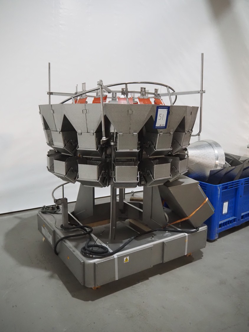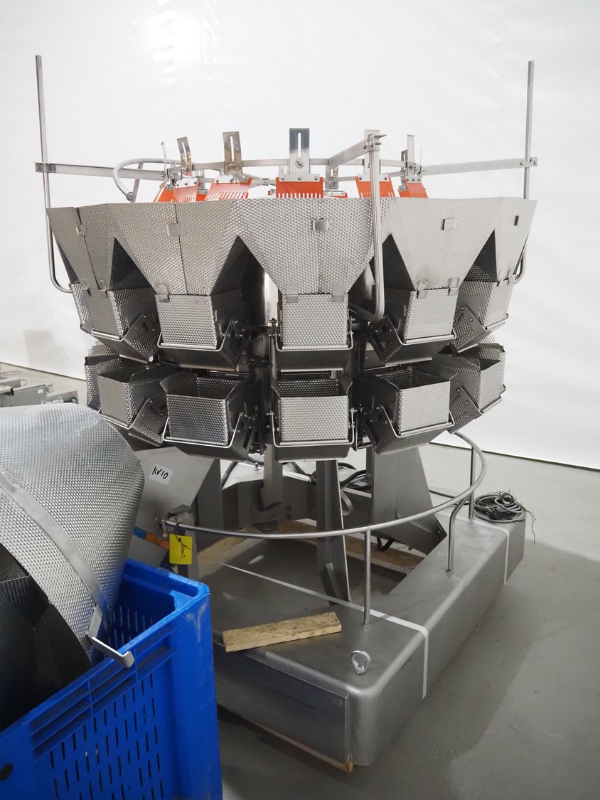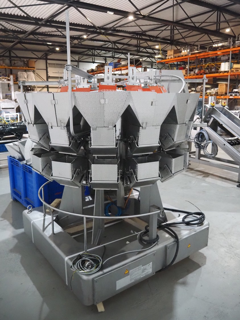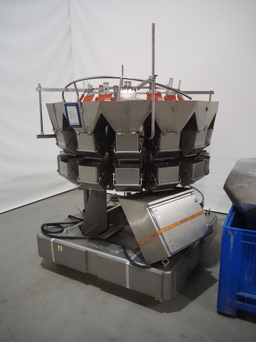 Ishida 14-heads multihead weigher, model: CCW-EM-214W-S/50-WR, serial number: 555175, year of construction: 2005, 220 V, 1 Ph, 50 Hz, 7 A, weight: 920 kg, dimensions: 1850 mm x 1700 mm x 2200 mm. Including pallet box with parts, dimensions pallet box: 1200 mm x 1000 mm x 1250 mm. Including s/s trolley, dimensions: 1710 mm x 700 mm x 2000 mm.