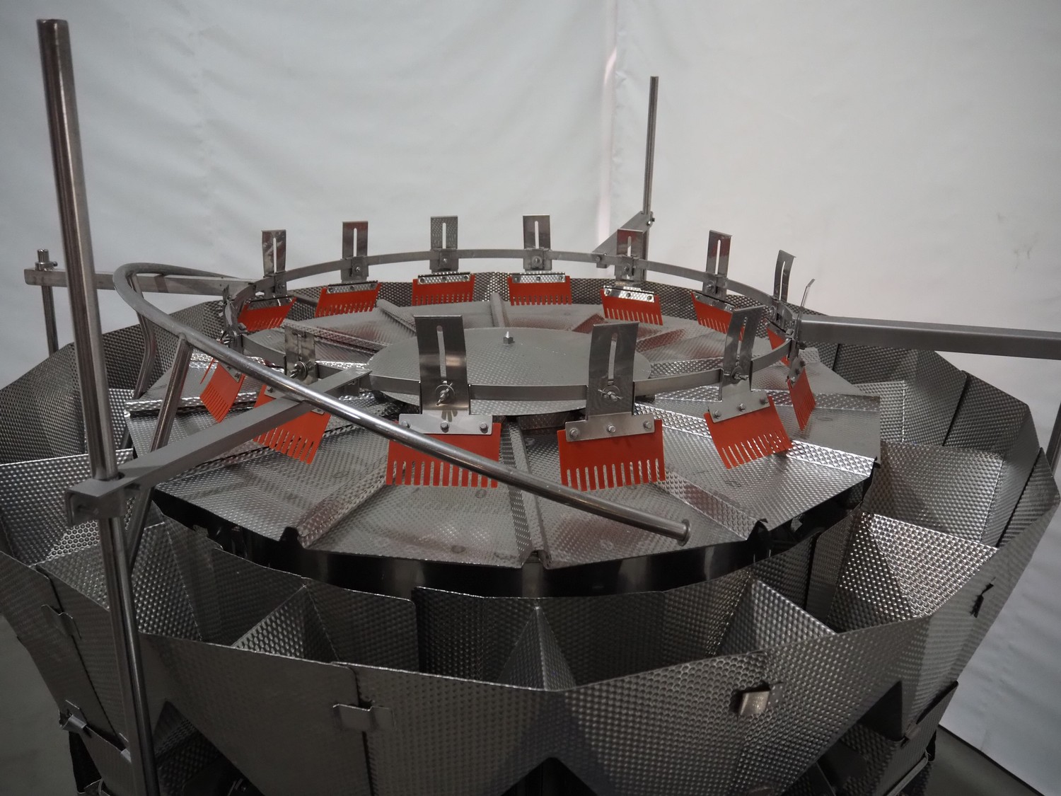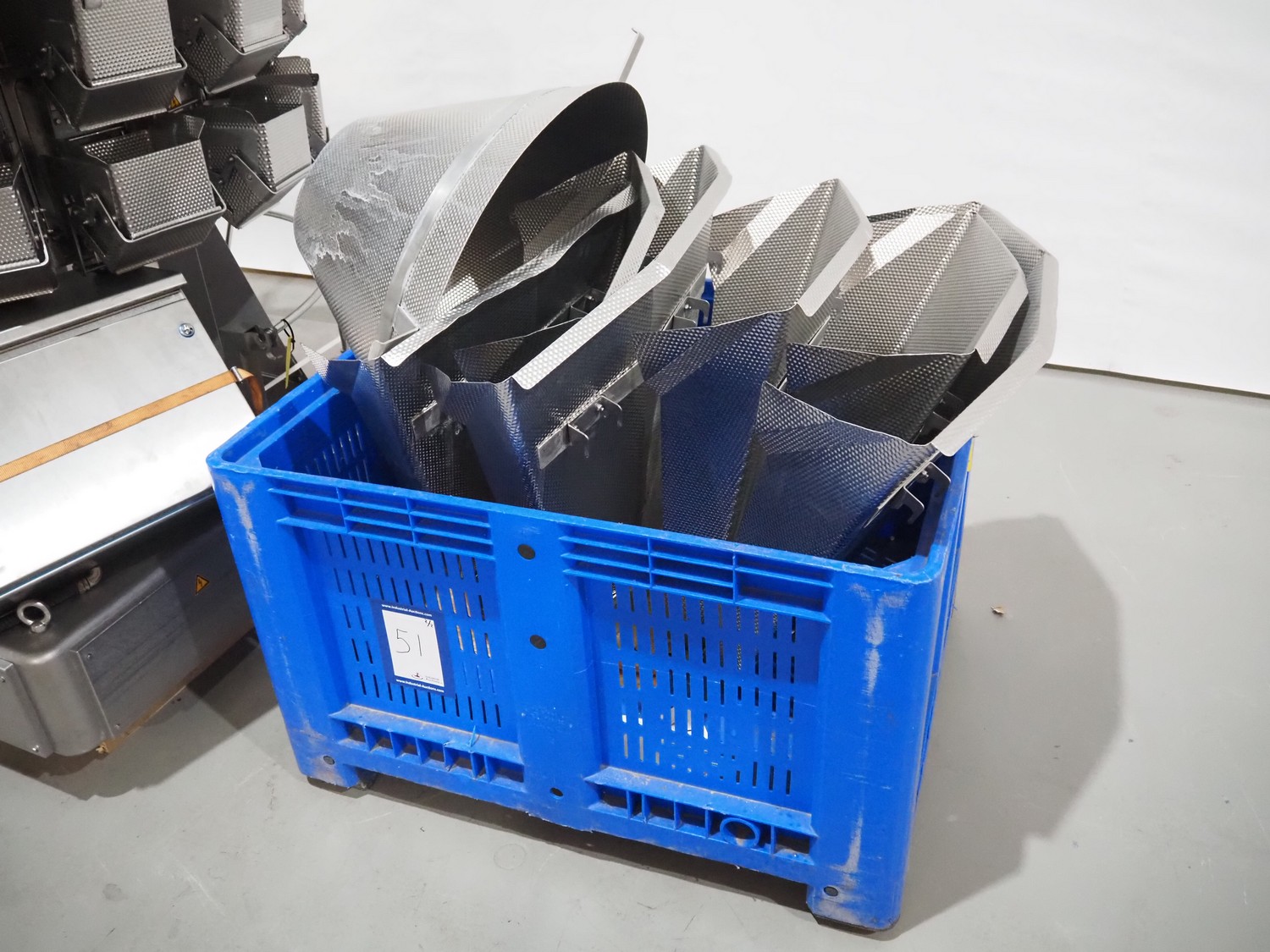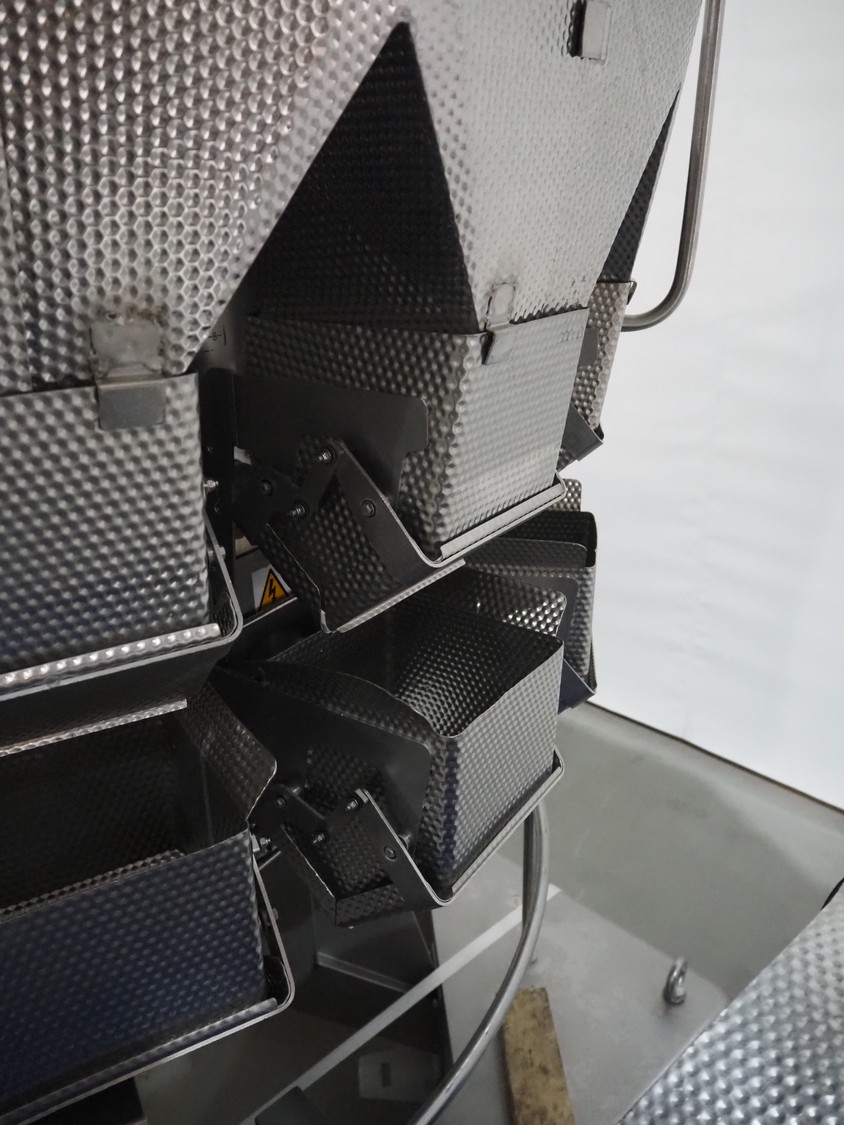 Ishida 14-heads multihead weigher, model: CCW-EM-214W-S/50-WR, serial number: 555175, year of construction: 2005, 220 V, 1 Ph, 50 Hz, 7 A, weight: 920 kg, dimensions: 1850 mm x 1700 mm x 2200 mm. Including pallet box with parts, dimensions pallet box: 1200 mm x 1000 mm x 1250 mm. Including s/s trolley, dimensions: 1710 mm x 700 mm x 2000 mm.