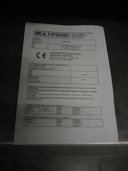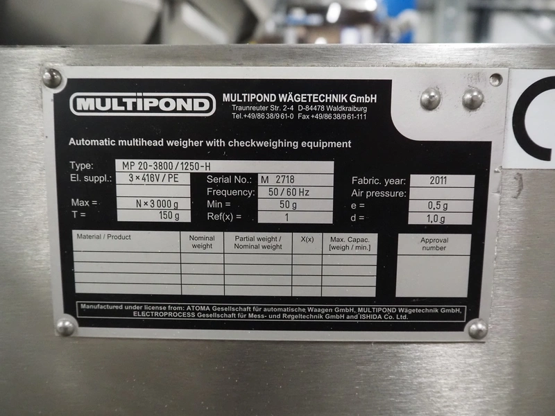 Multipond 20-heads multihead weigher, type: MP 20-3800/1250-H, serial number: M 2718, year of construction: 2011, 416 V, 3 Ph, 50/60 Hz, maximum weight: 3000 gram, minimum weight: 50 gram, e= 0.5 gram, d= 1.0 gram, T= 150 gram, total dimensions: 2600 mm x 2200 mm x 1300 mm.