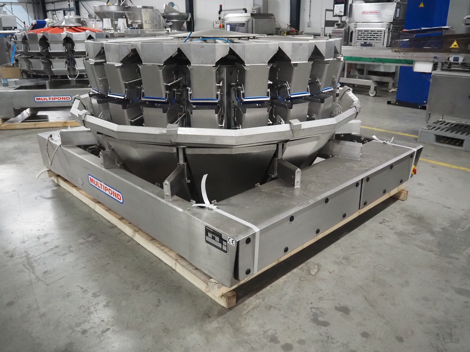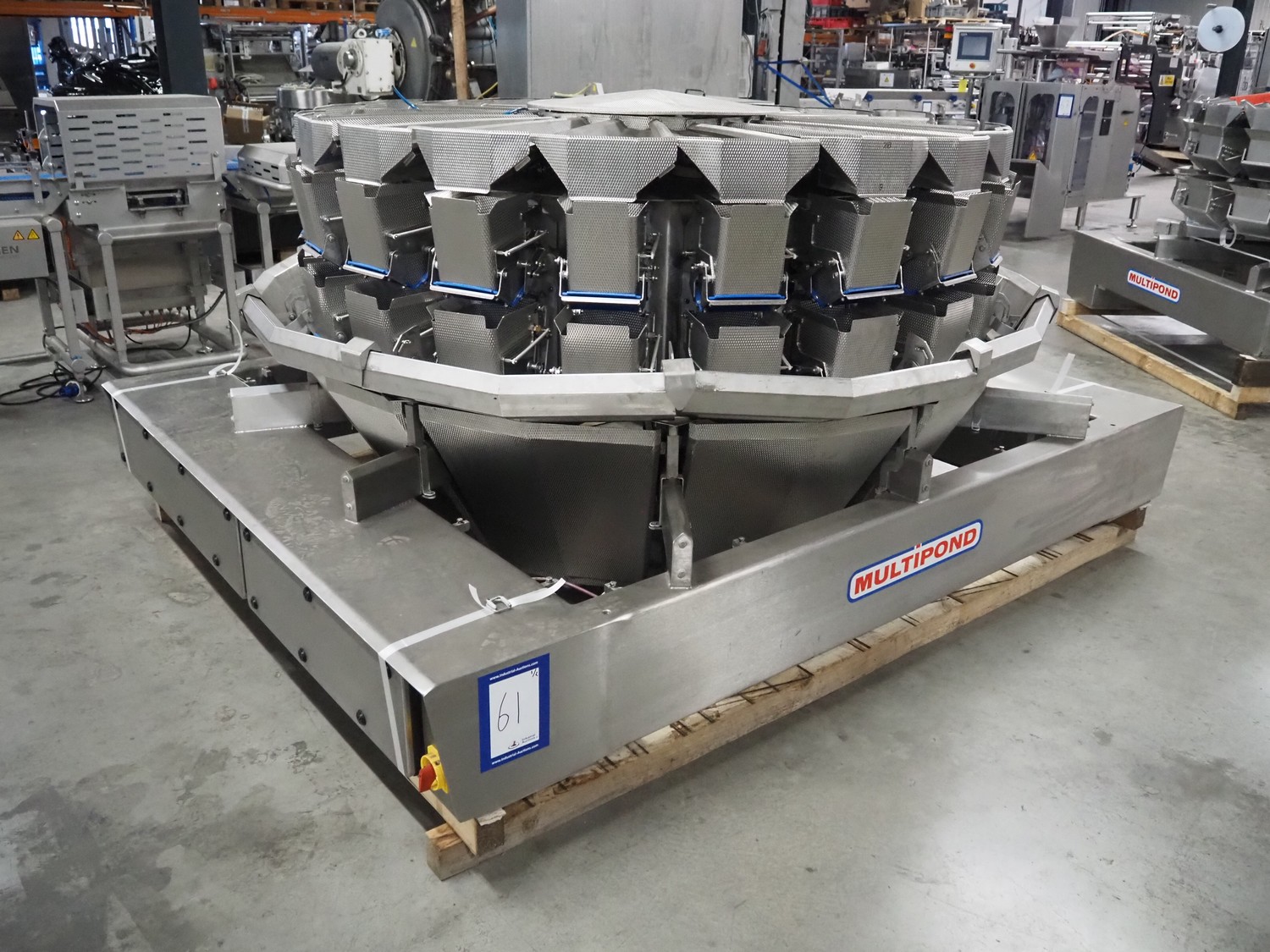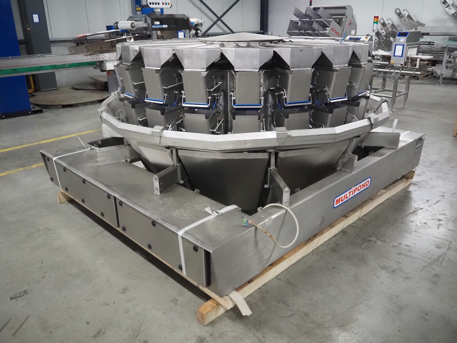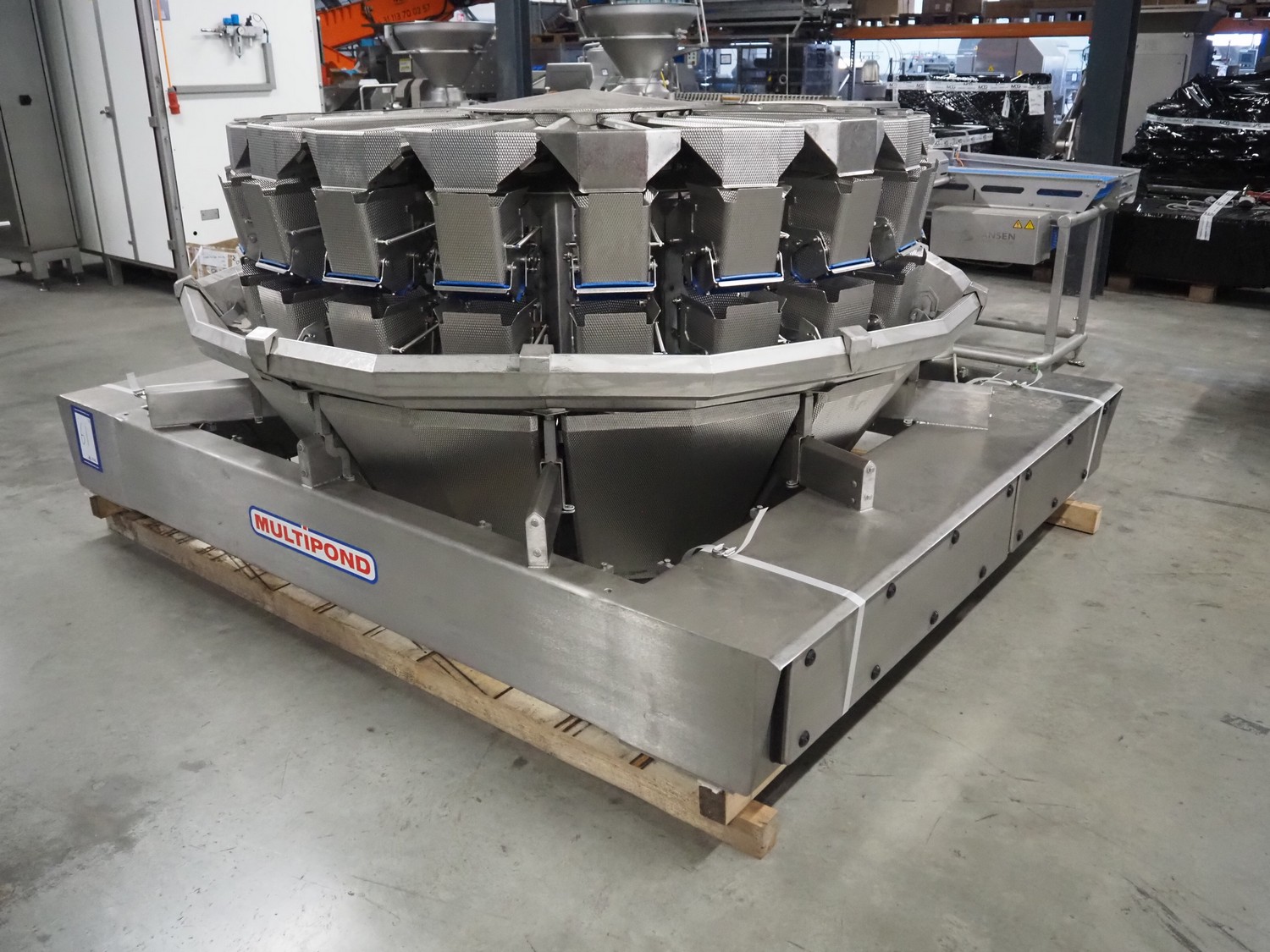 Multipond 20-heads multihead weigher, type: MP 20-3800/1250-H, serial number: M 2718, year of construction: 2011, 416 V, 3 Ph, 50/60 Hz, maximum weight: 3000 gram, minimum weight: 50 gram, e= 0.5 gram, d= 1.0 gram, T= 150 gram, total dimensions: 2600 mm x 2200 mm x 1300 mm.