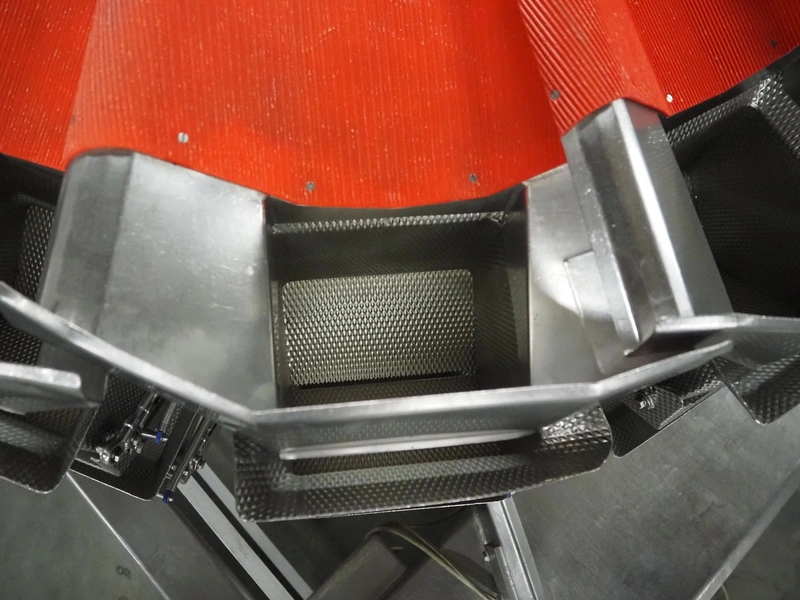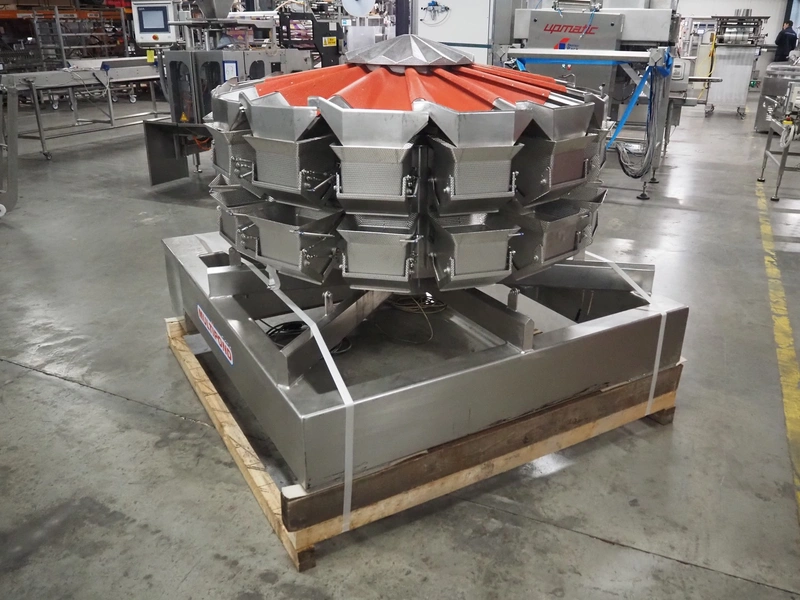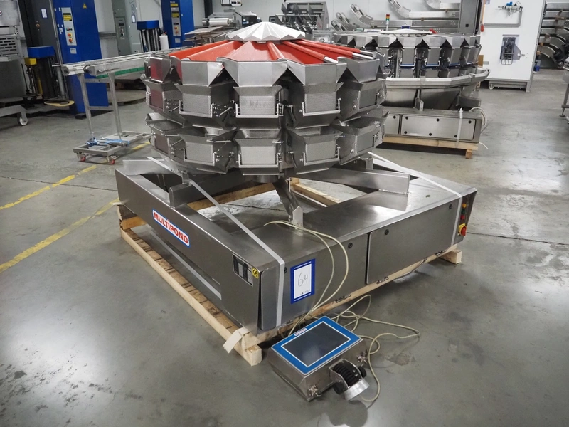 Multipond 14-heads multihead weigher, type: MP 1434-F, fabrication number: M 1420, year of construction: 2001, 230 V, 50 Hz, maximum weight: 2400/6000 gram, e=: 1/2 gram, dimensions: 1550 mm x 1900 mm x 1300 mm. Including pallet with infeed hopper.