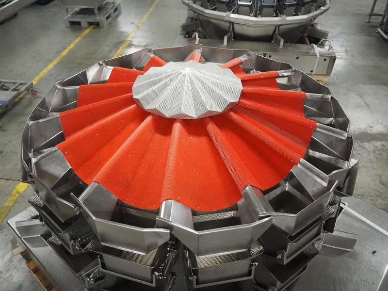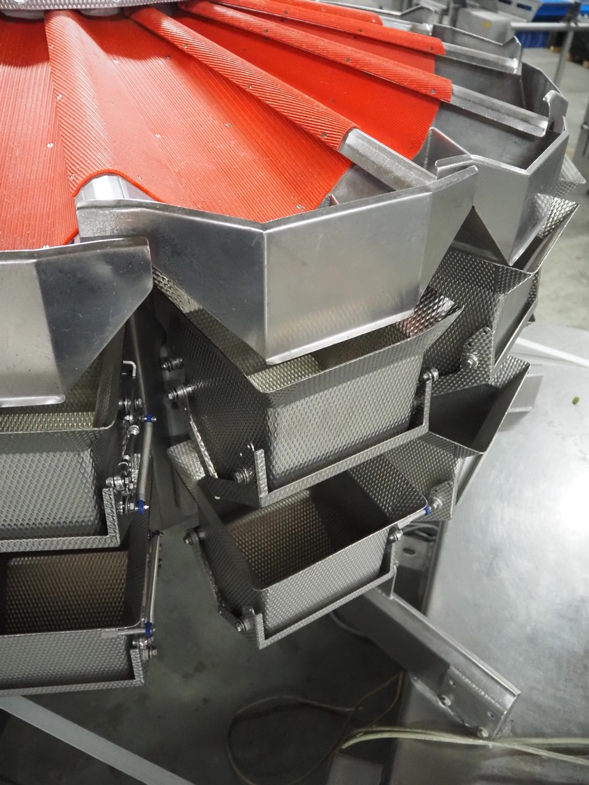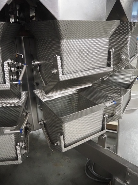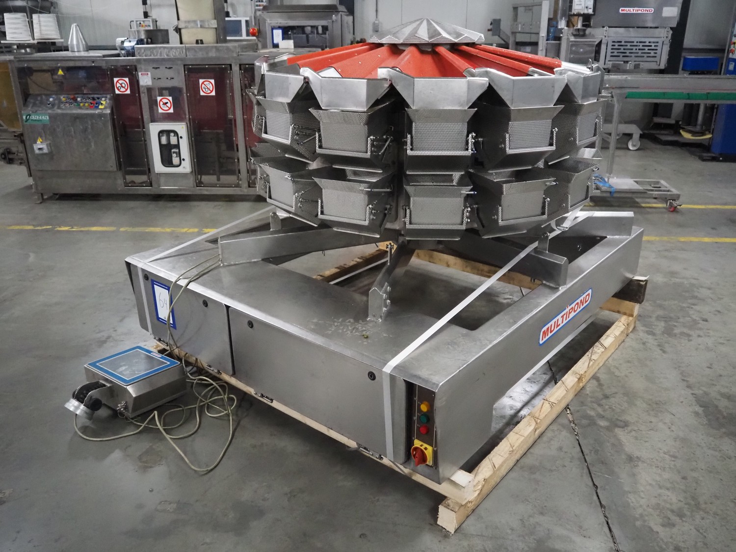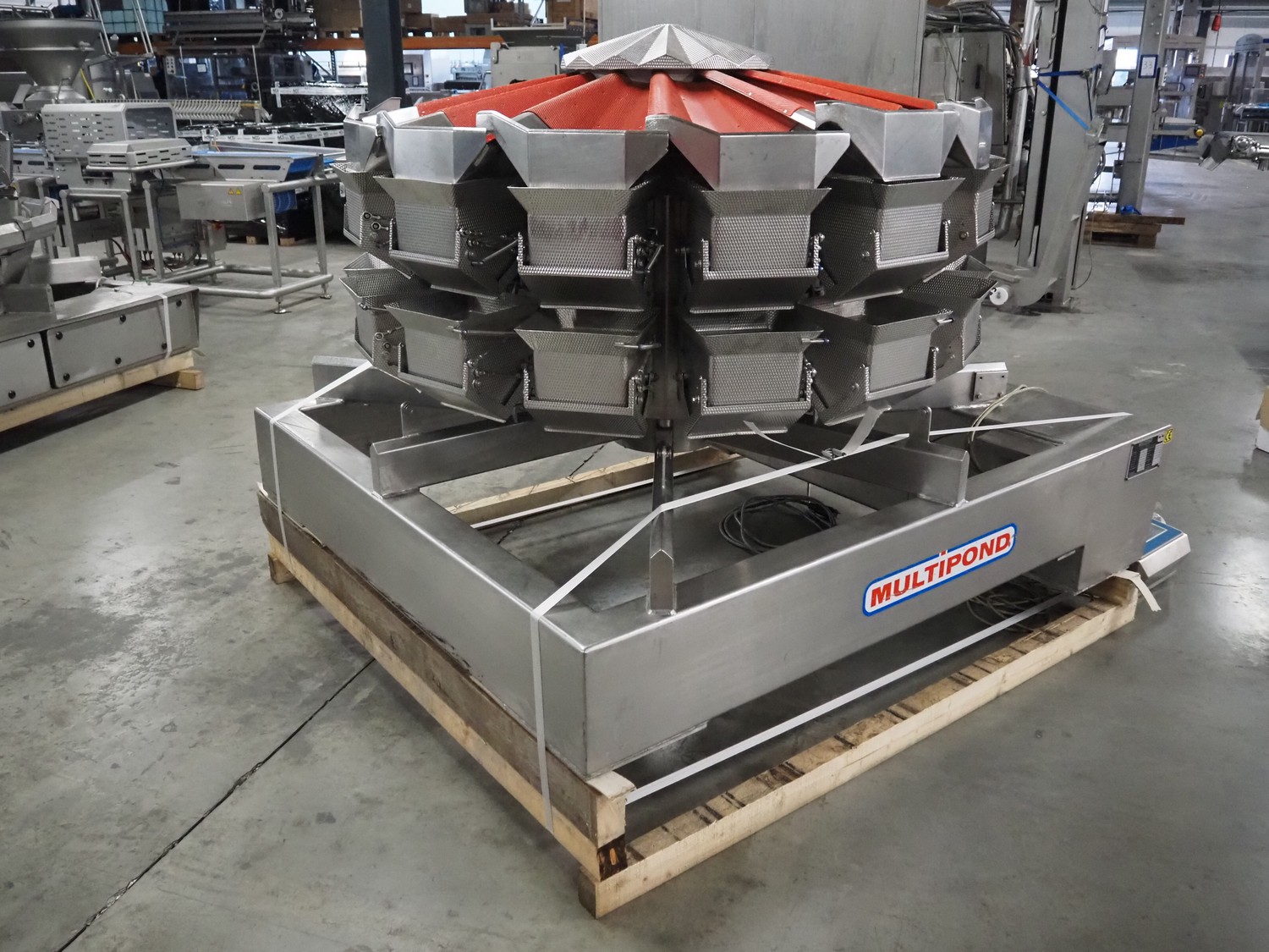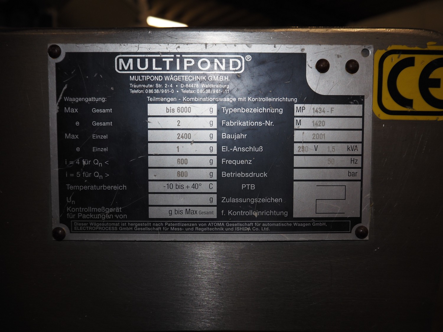 Multipond 14-heads multihead weigher, type: MP 1434-F, fabrication number: M 1420, year of construction: 2001, 230 V, 50 Hz, maximum weight: 2400/6000 gram, e=: 1/2 gram, dimensions: 1550 mm x 1900 mm x 1300 mm. Including pallet with infeed hopper.