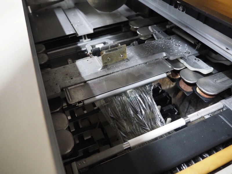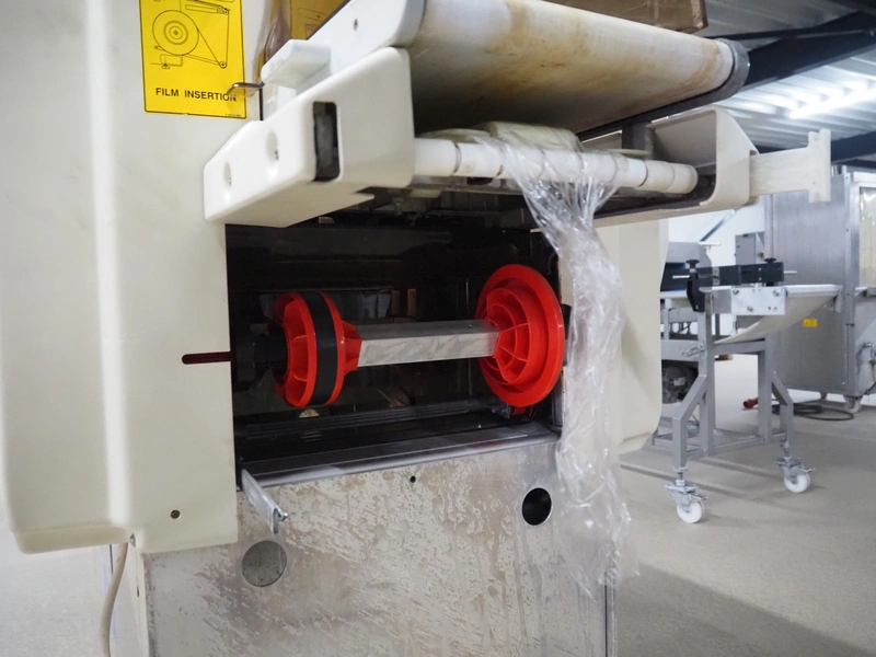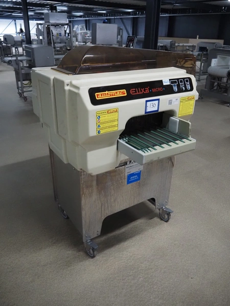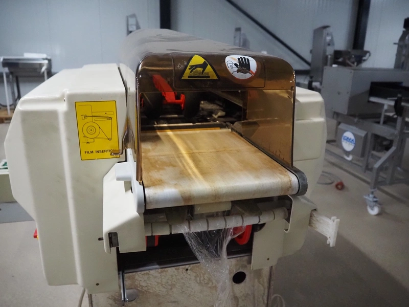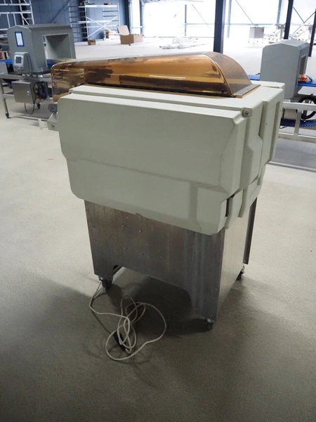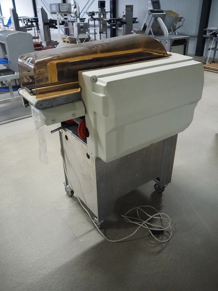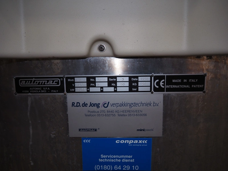 Automac S.P.A. mobile packaging machine, model: B.204, number: 3208, year of construction: 1998, 230 V, 2 Ph, 50 Hz, 1.95 kW, weight: 150 kg, string infeed belt, belt width: 330 mm, plastic outfeed belt, belt width: 1150 mm x 1050 mm x 1350 mm.