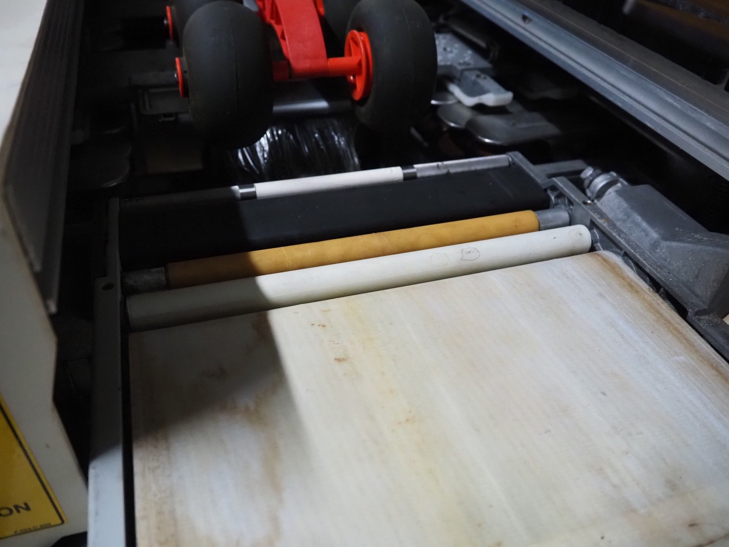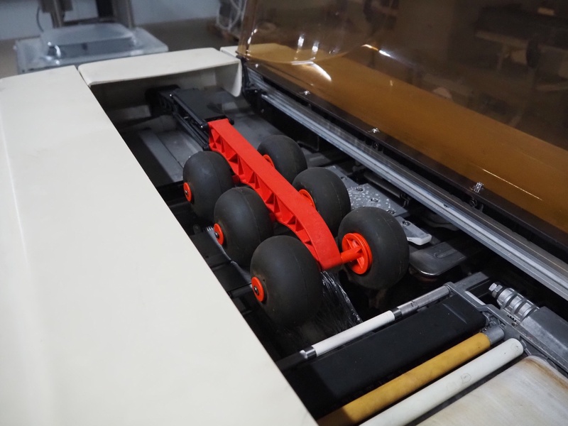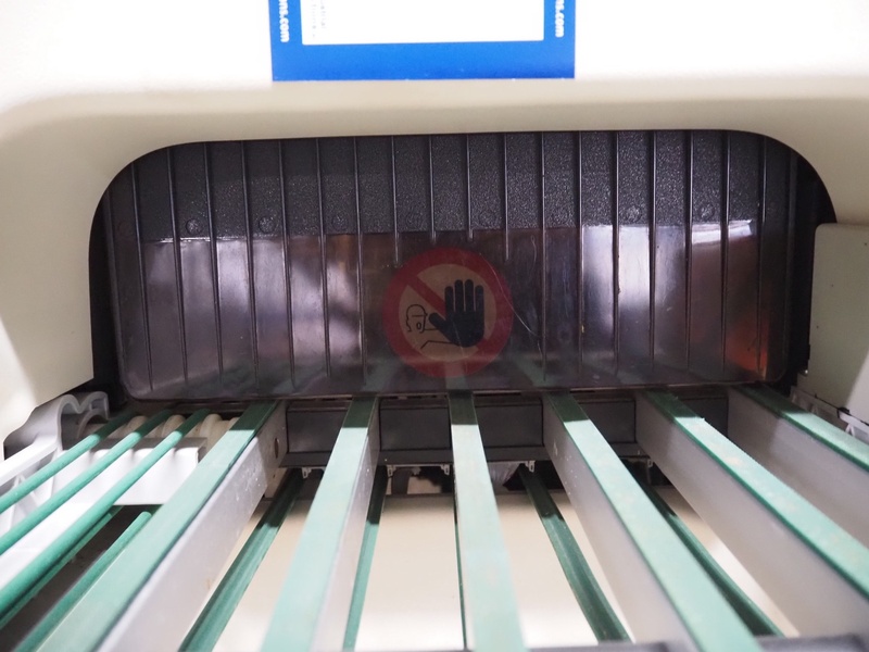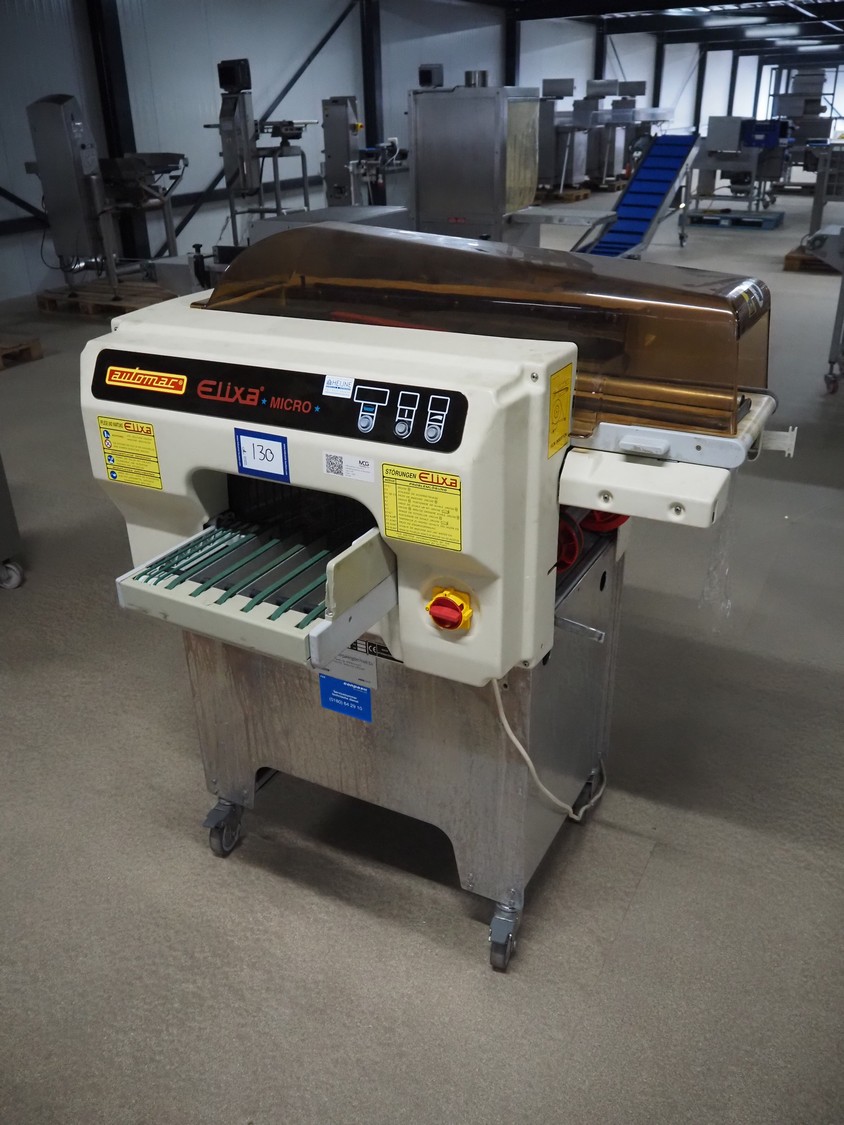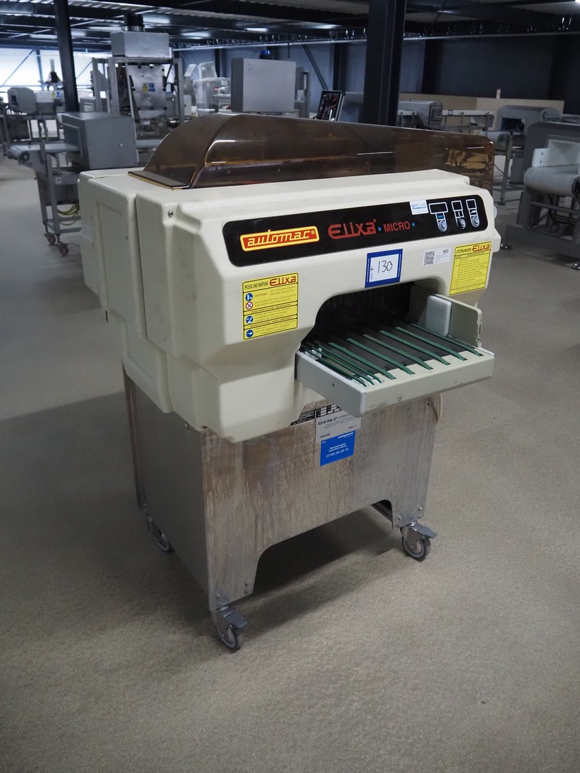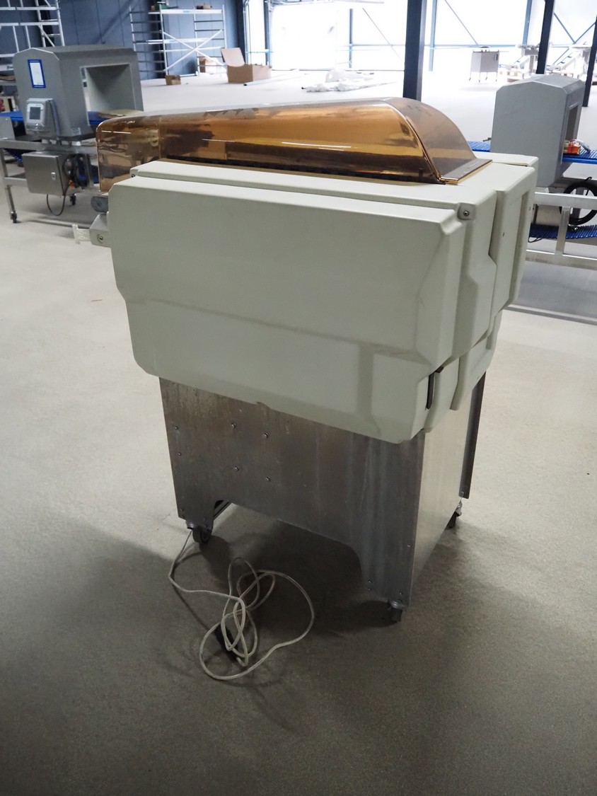 Automac S.P.A. mobile packaging machine, model: B.204, number: 3208, year of construction: 1998, 230 V, 2 Ph, 50 Hz, 1.95 kW, weight: 150 kg, string infeed belt, belt width: 330 mm, plastic outfeed belt, belt width: 1150 mm x 1050 mm x 1350 mm.