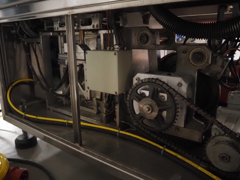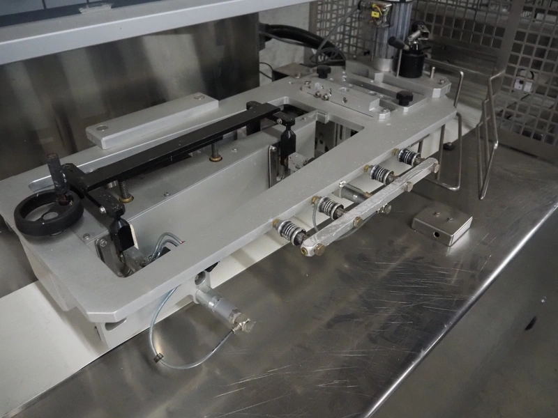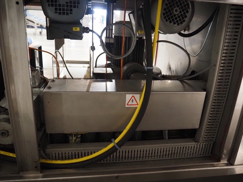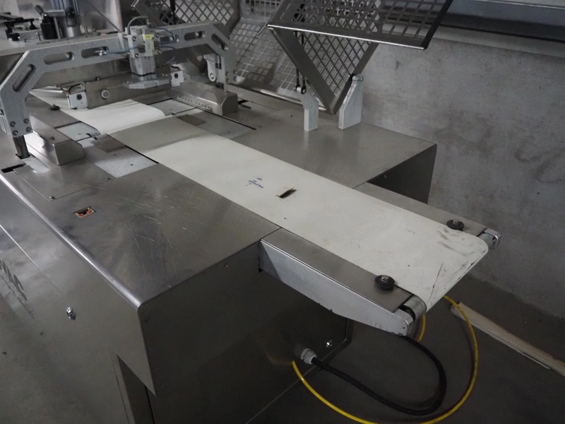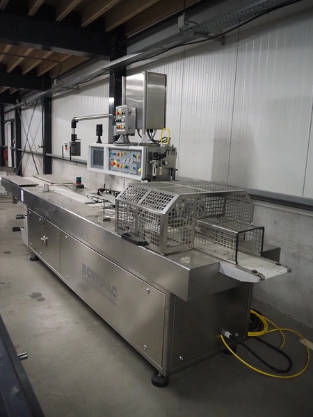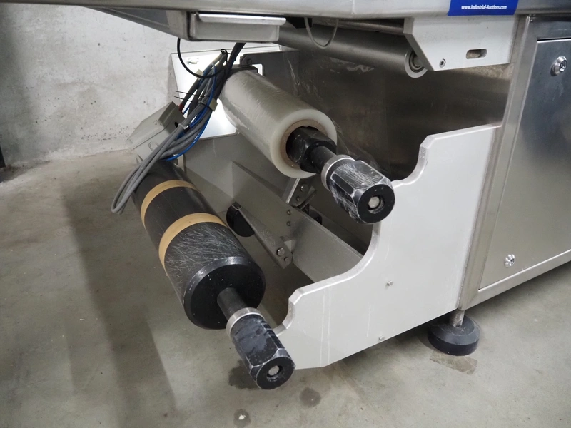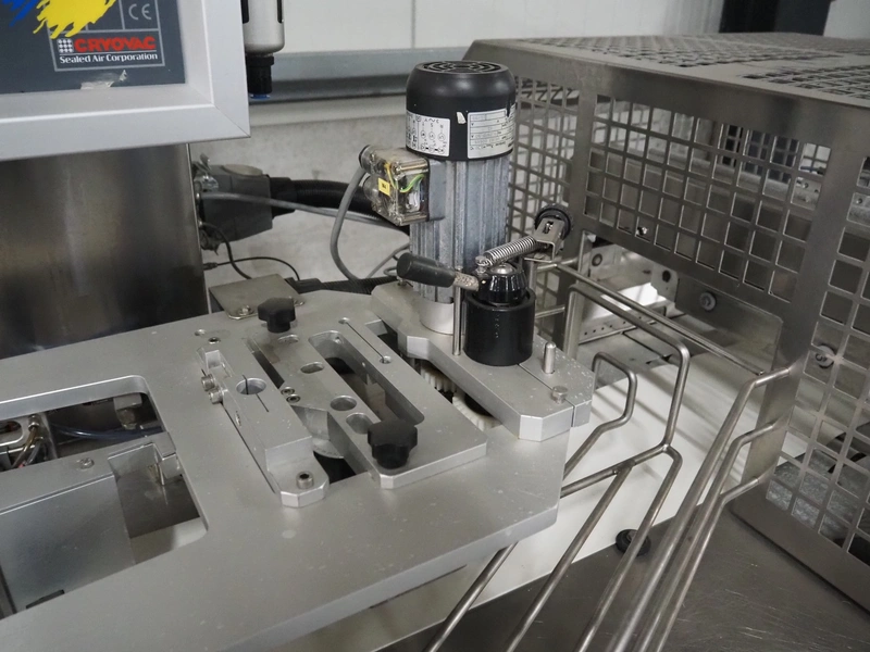 Cryovac horizontal form, fill and seal machine, type: CJ55 MD-BDF, serial number: A91600205, year of construction: 2000, 400 V, 50 Hz, 8 A, 5 kW, plastic belt, belt width: (2x) 200 mm, seal width: 250 mm, clearance: 200 mm x 60 mm, total dimensions: 5000 mm x 1100 mm x 2300 mm.