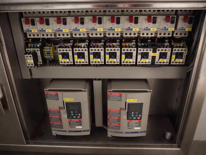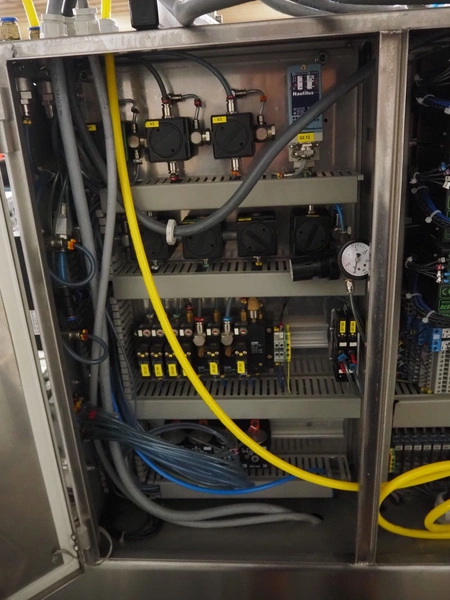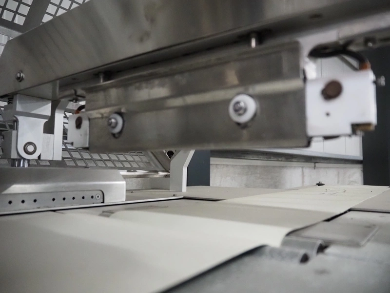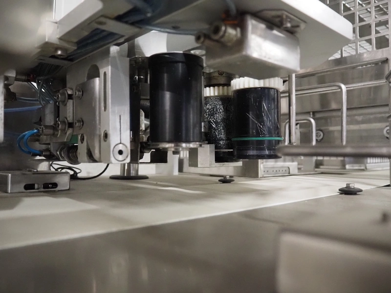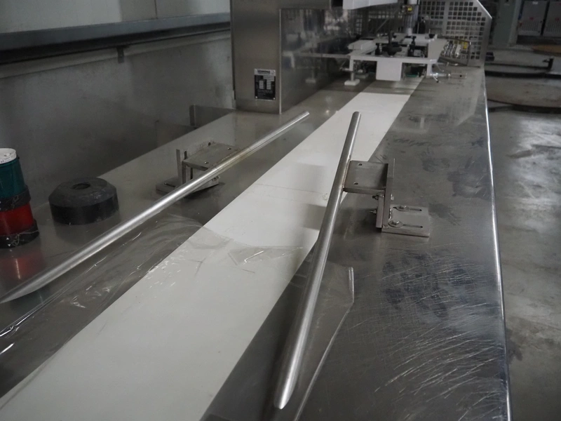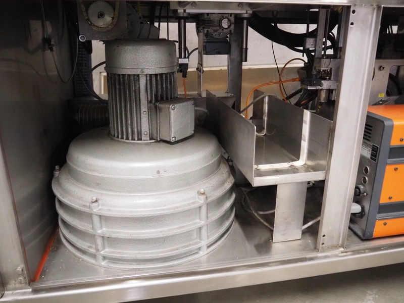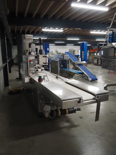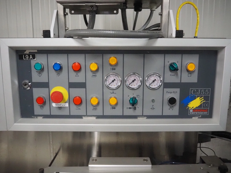 Cryovac horizontal form, fill and seal machine, type: CJ55 MD-BDF, serial number: A91600205, year of construction: 2000, 400 V, 50 Hz, 8 A, 5 kW, plastic belt, belt width: (2x) 200 mm, seal width: 250 mm, clearance: 200 mm x 60 mm, total dimensions: 5000 mm x 1100 mm x 2300 mm.
