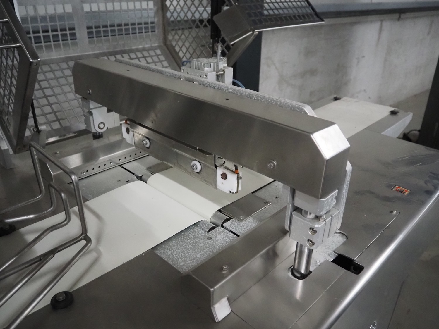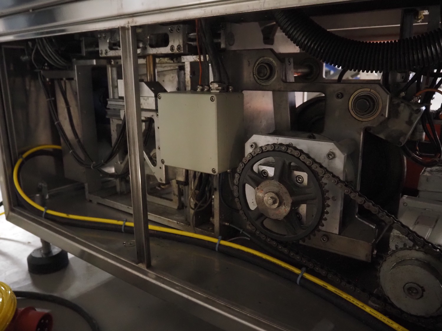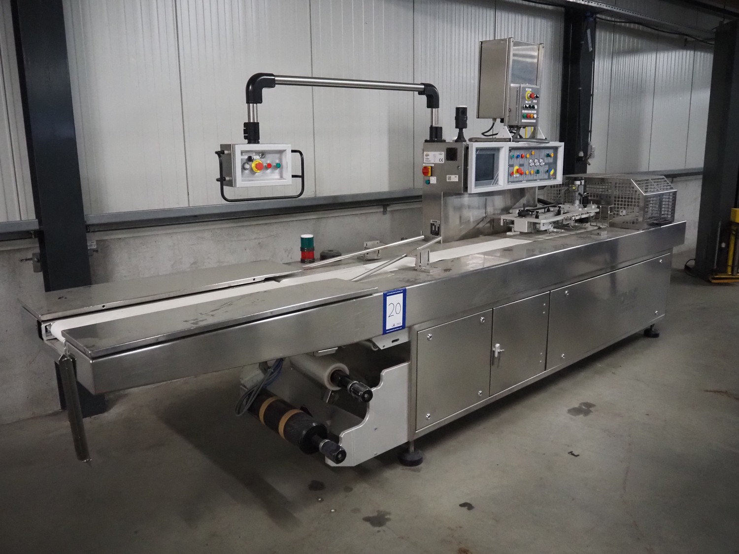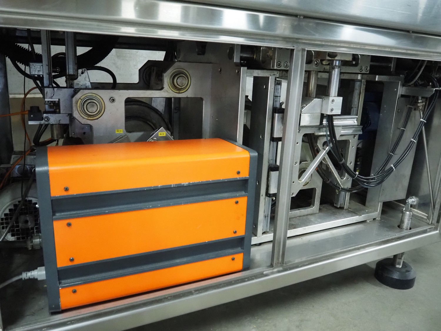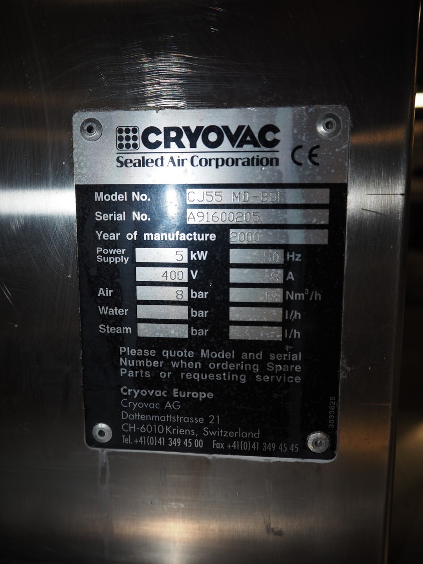 Cryovac horizontal form, fill and seal machine, type: CJ55 MD-BDF, serial number: A91600205, year of construction: 2000, 400 V, 50 Hz, 8 A, 5 kW, plastic belt, belt width: (2x) 200 mm, seal width: 250 mm, clearance: 200 mm x 60 mm, total dimensions: 5000 mm x 1100 mm x 2300 mm.