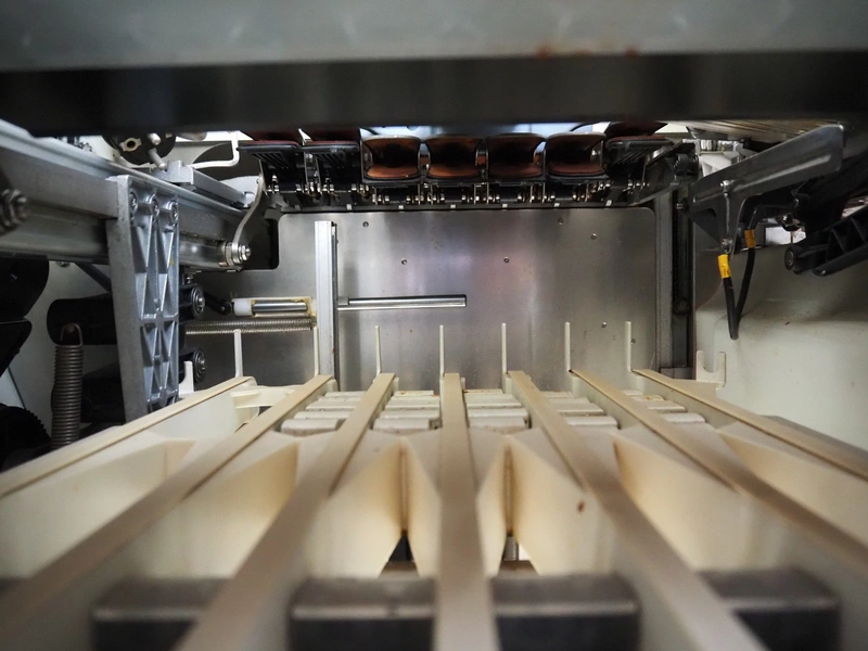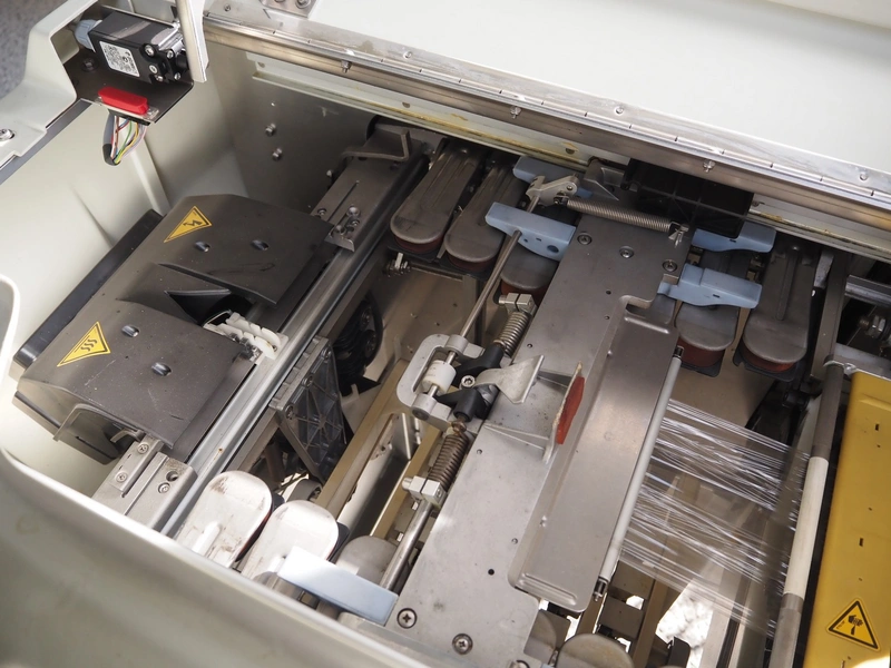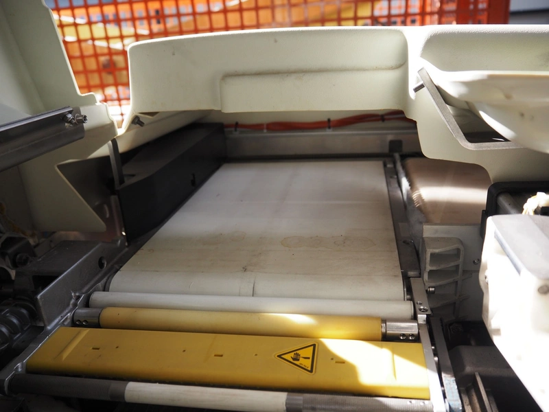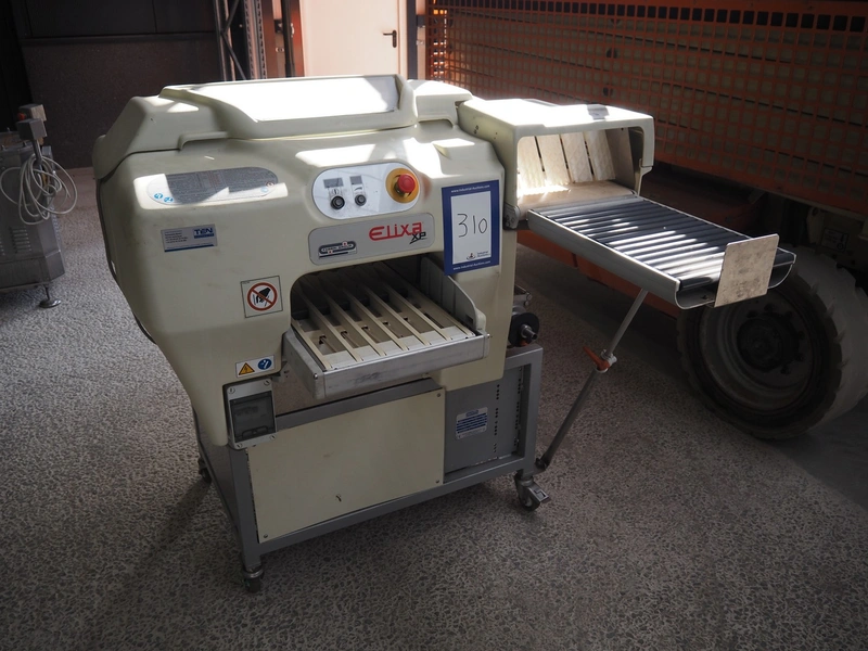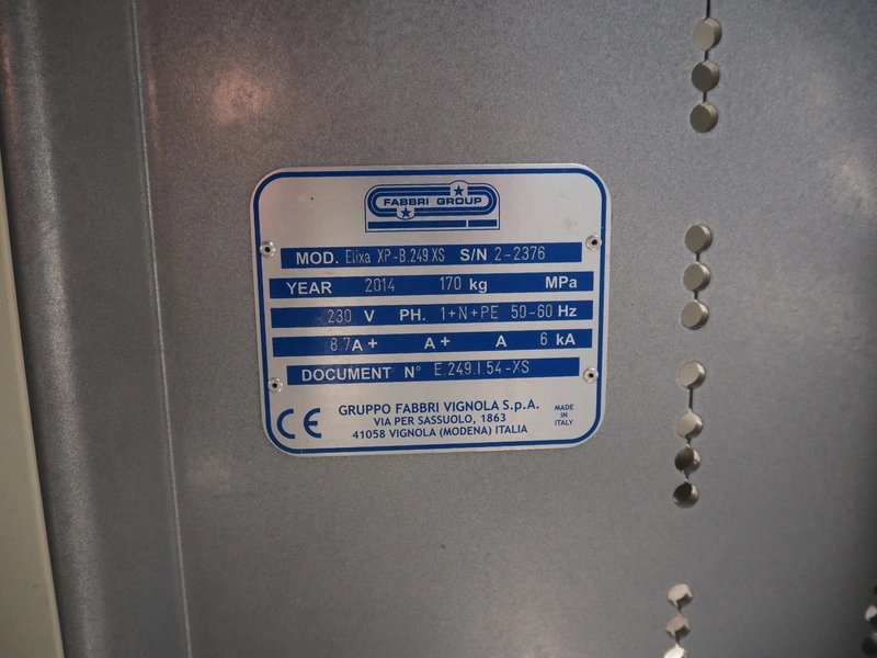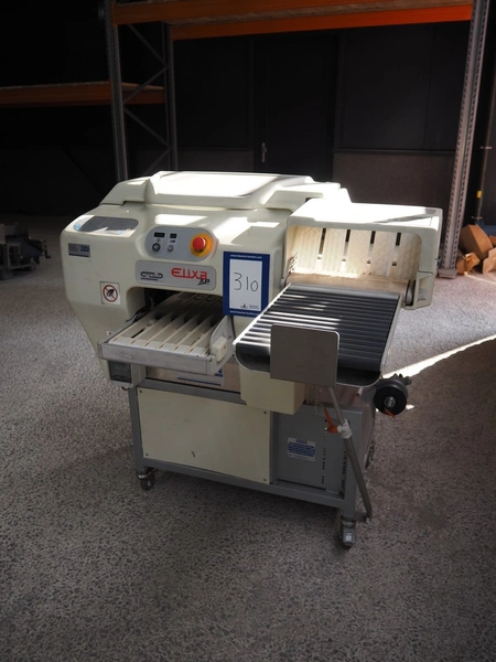 Fabbri Group packaging machine, model: Elixa XP-B.249.XS, serial number: 2-2376, year of construction: 2014, 230 V, 1 Ph, 50-60 Hz, 8.7 A, plastic string infeed belt, belt width: 330 mm, plastic outfeed belt, belt width: 340 mm, plastic outfeed rollers, roller width: 300 mm, total dimensions: 1350 mm x 1250 mm x 1300 mm.