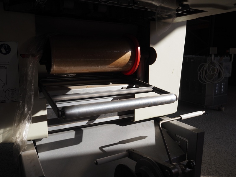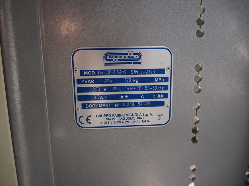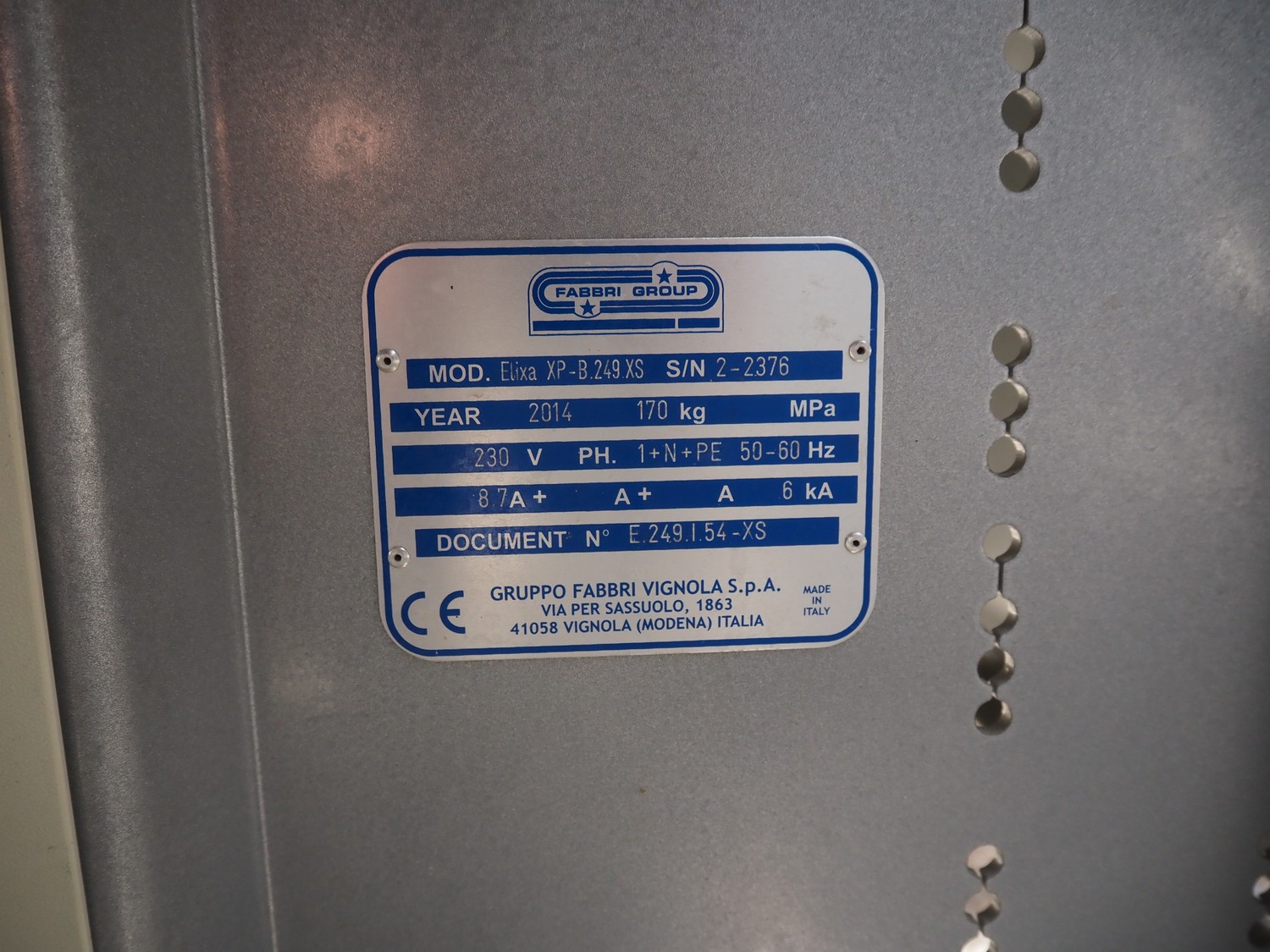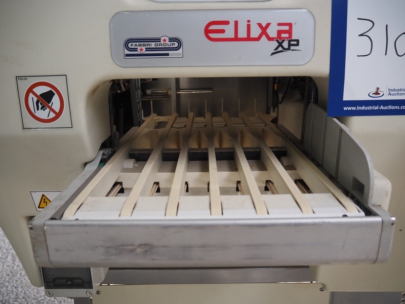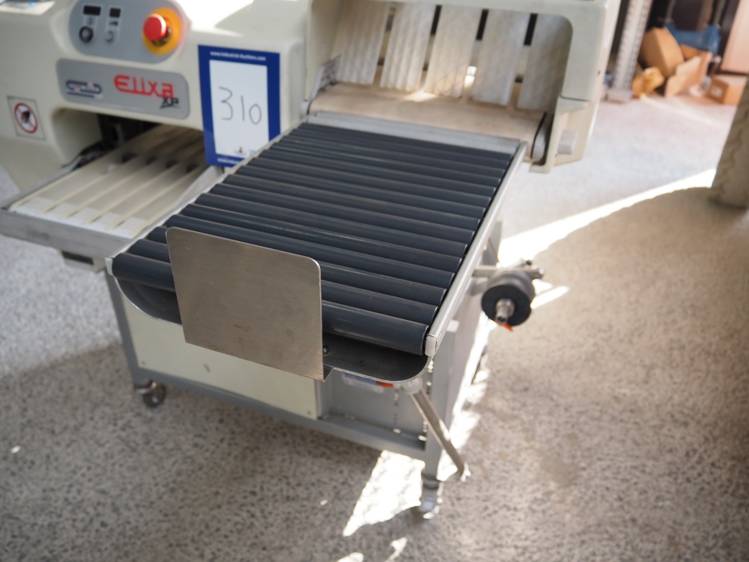 Fabbri Group packaging machine, model: Elixa XP-B.249.XS, serial number: 2-2376, year of construction: 2014, 230 V, 1 Ph, 50-60 Hz, 8.7 A, plastic string infeed belt, belt width: 330 mm, plastic outfeed belt, belt width: 340 mm, plastic outfeed rollers, roller width: 300 mm, total dimensions: 1350 mm x 1250 mm x 1300 mm.