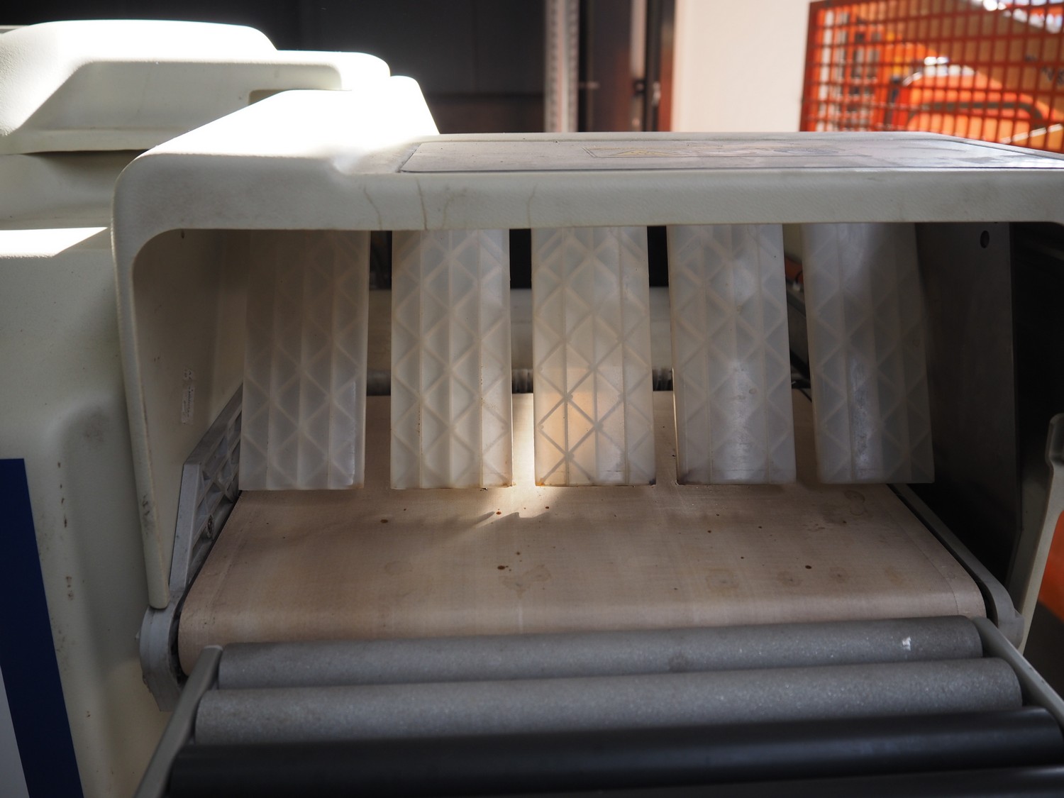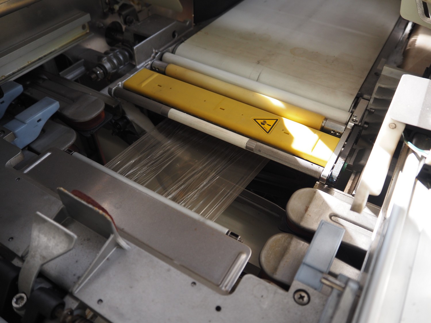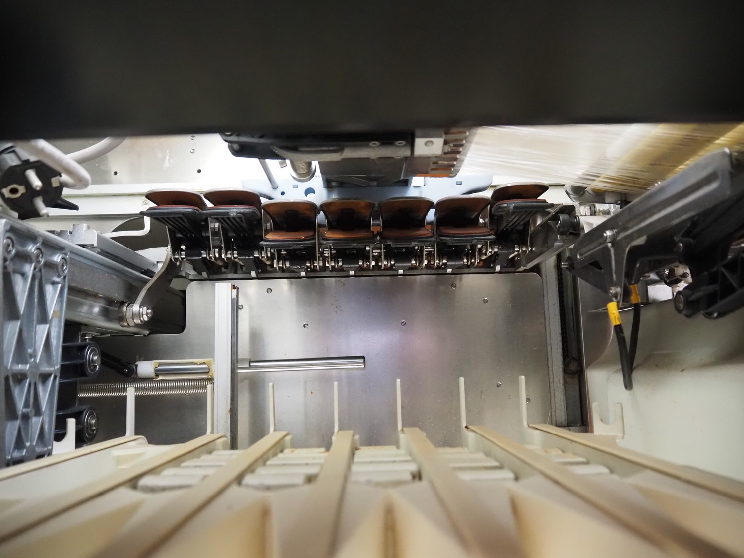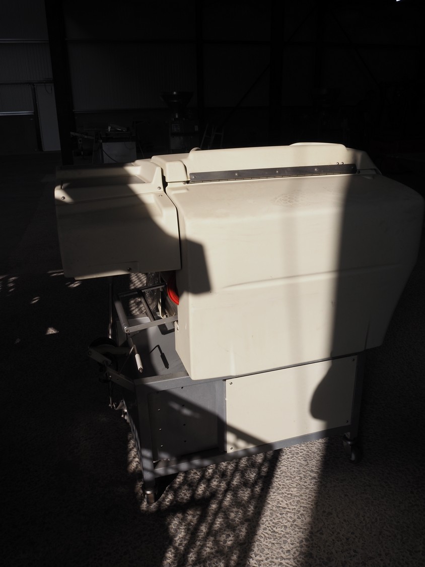 Fabbri Group packaging machine, model: Elixa XP-B.249.XS, serial number: 2-2376, year of construction: 2014, 230 V, 1 Ph, 50-60 Hz, 8.7 A, plastic string infeed belt, belt width: 330 mm, plastic outfeed belt, belt width: 340 mm, plastic outfeed rollers, roller width: 300 mm, total dimensions: 1350 mm x 1250 mm x 1300 mm.