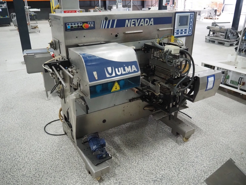 Ulma horizontal form, fill and seal machine, model number: NEVADA-BF-BI, serial number: 1600008, year of construction: 2003, 380 V, 50 Hz, 22 A, 4.6 kW, dimensions machine: 1950 mm x 1050 mm x 1550 mm, infeed belt, dimensions: 2200 mm x 600 mm x 1000 mm. Including pallet box with parts, dimensions: 1200 mm x 1000 mm x 1000 mm and pallet with film unwinding device, dimensions: 1200 mm x 900 mm x 900 mm. Incomplete, technical condition unknown.