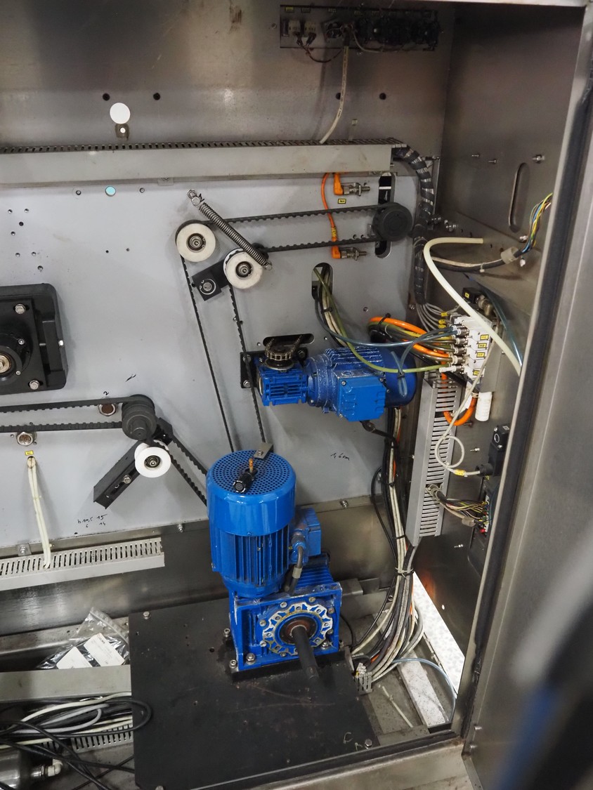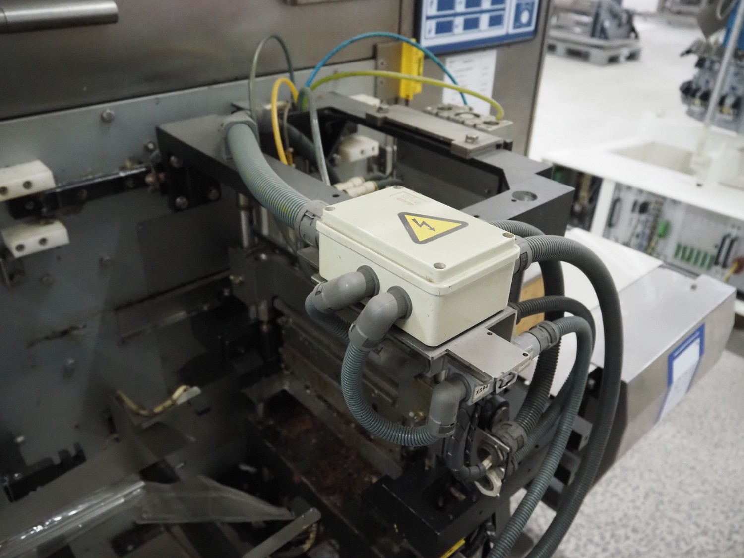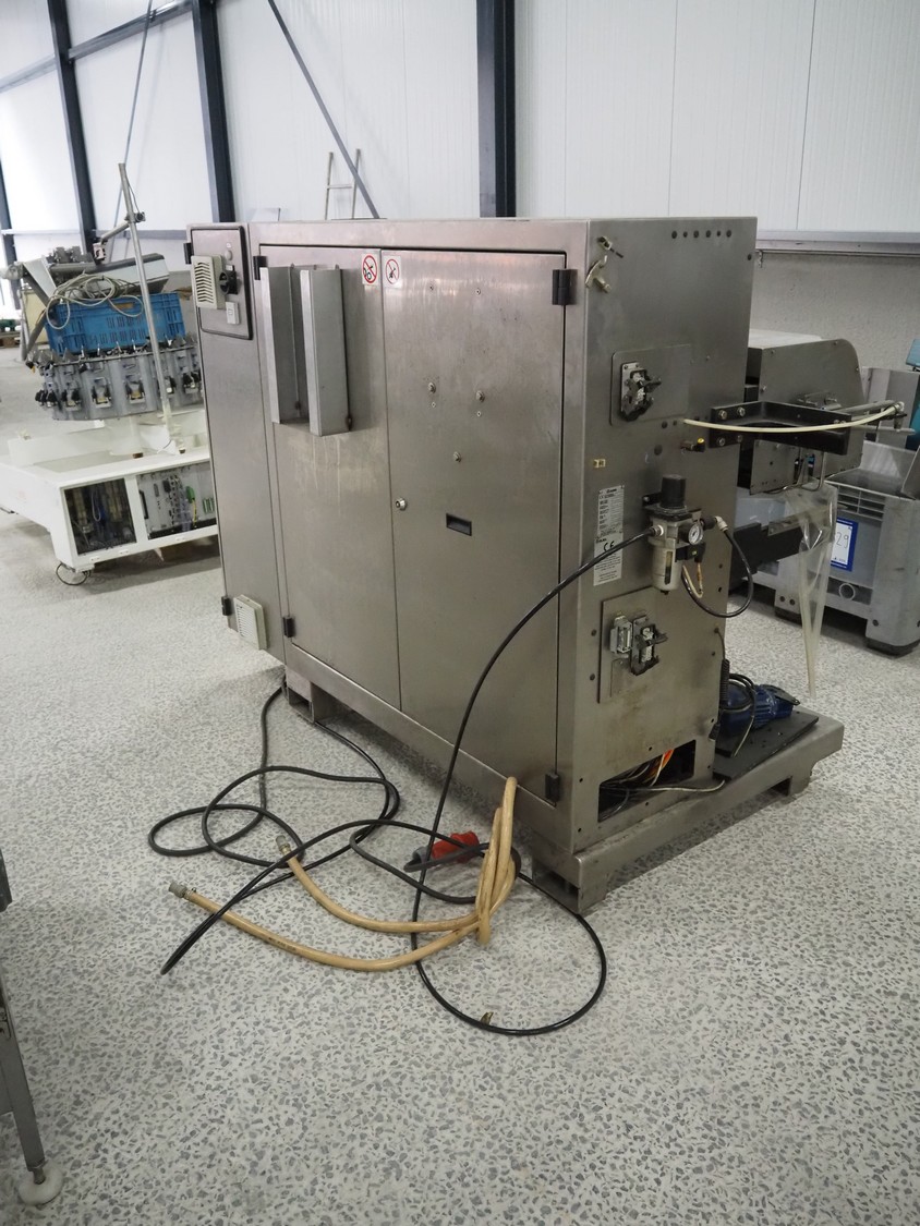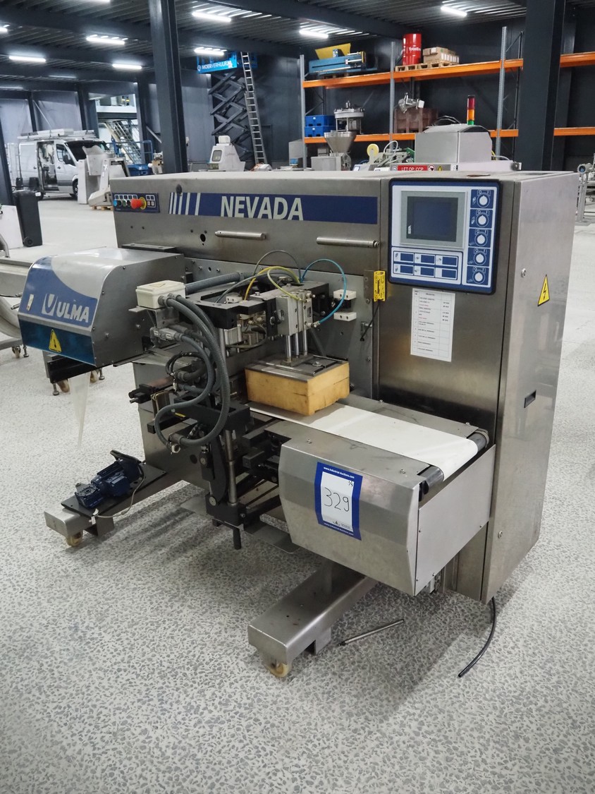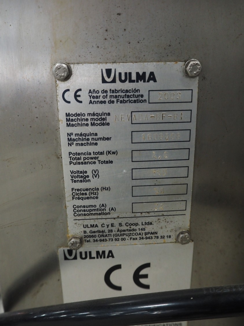 Ulma horizontal form, fill and seal machine, model number: NEVADA-BF-BI, serial number: 1600008, year of construction: 2003, 380 V, 50 Hz, 22 A, 4.6 kW, dimensions machine: 1950 mm x 1050 mm x 1550 mm, infeed belt, dimensions: 2200 mm x 600 mm x 1000 mm. Including pallet box with parts, dimensions: 1200 mm x 1000 mm x 1000 mm and pallet with film unwinding device, dimensions: 1200 mm x 900 mm x 900 mm. Incomplete, technical condition unknown.