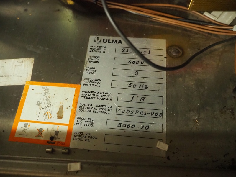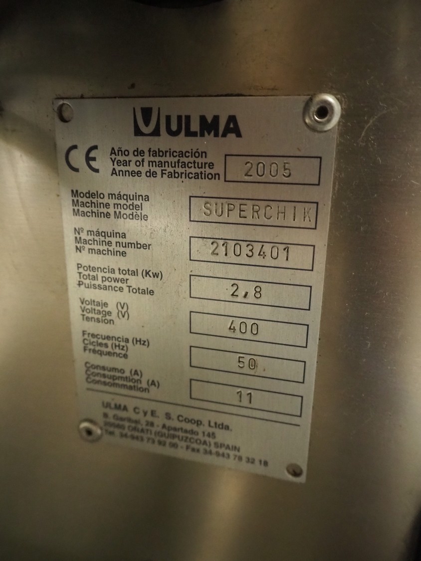 Ulma packaging machine, model: SUPERCHIK, machine number: 2103401, year of construction: 2005, 400 V, 50 Hz, 11 A, 2.8 kW, dimensions: 3500 mm x 900 mm x 1550 mm. Including pallet with part.