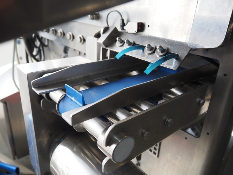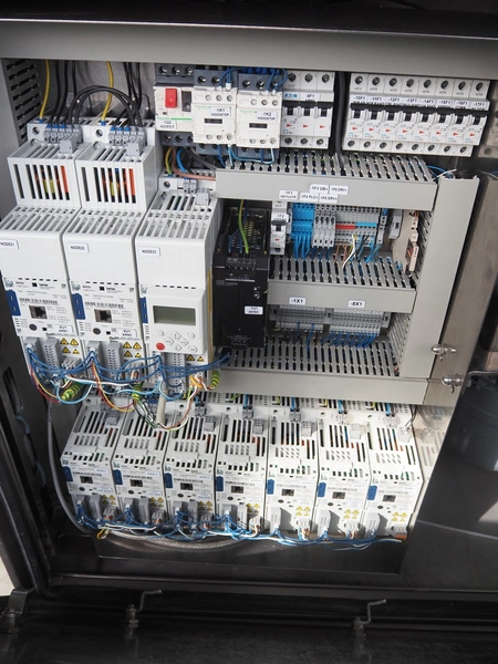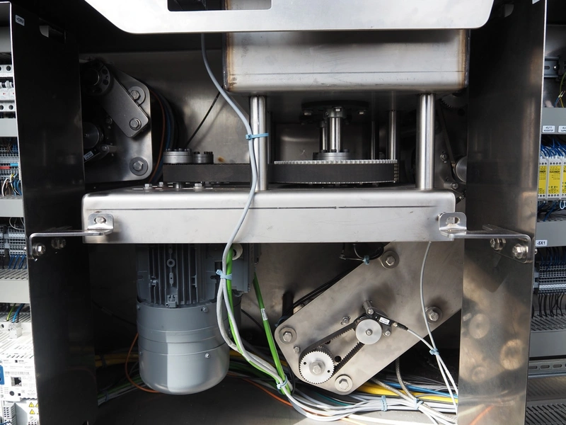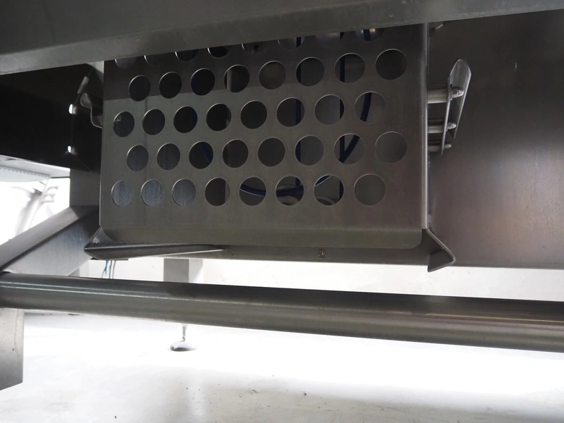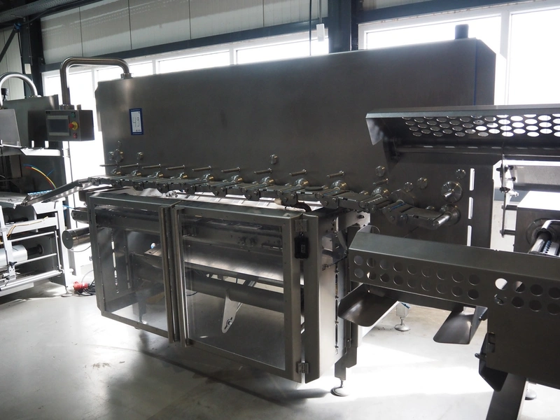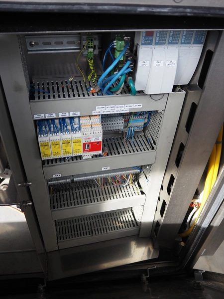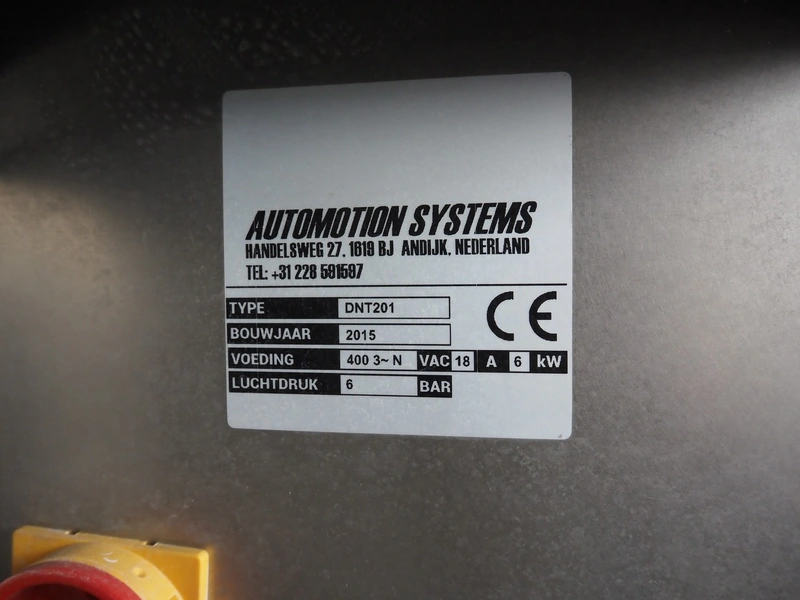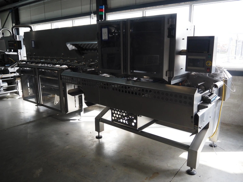 Automation Systems outfeed belt with weighing and sorting line, type: DNT101, year of construction: 2015, 400 V, 3 Ph, 18 A, 7 KW, plastic belt, belt width: 190 mm, 405 and 50 mm, tray dimensions: 175 mm x 125 mm, distance between dividers: 245 mm, total dimensions: 5750 mm x 2000 mm x 2150 mm.