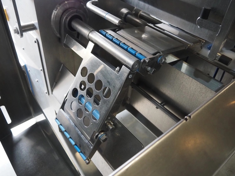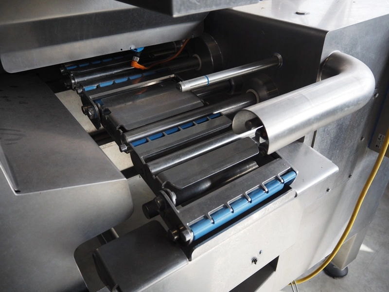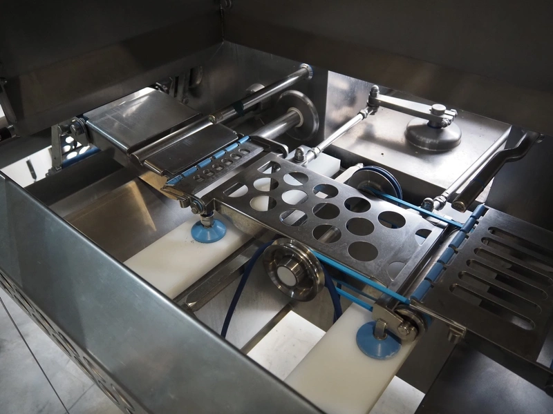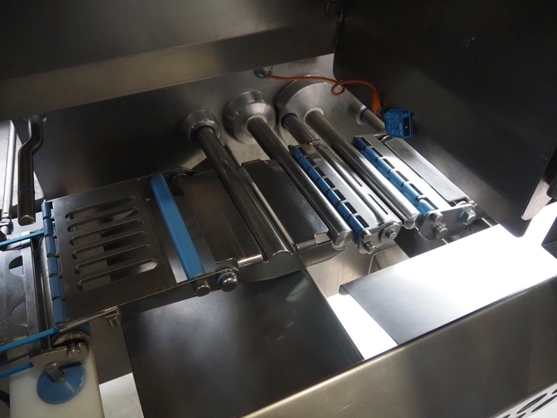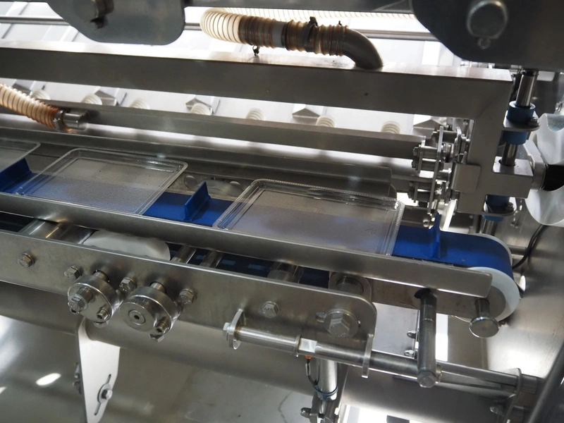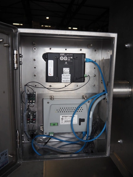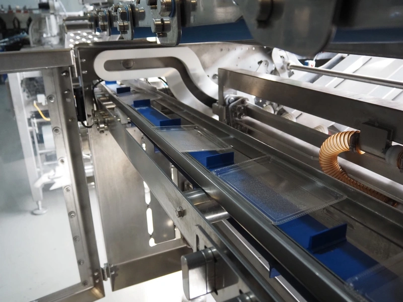 Automation Systems outfeed belt with weighing and sorting line, type: DNT101, year of construction: 2015, 400 V, 3 Ph, 18 A, 7 KW, plastic belt, belt width: 190 mm, 405 and 50 mm, tray dimensions: 175 mm x 125 mm, distance between dividers: 245 mm, total dimensions: 5750 mm x 2000 mm x 2150 mm.