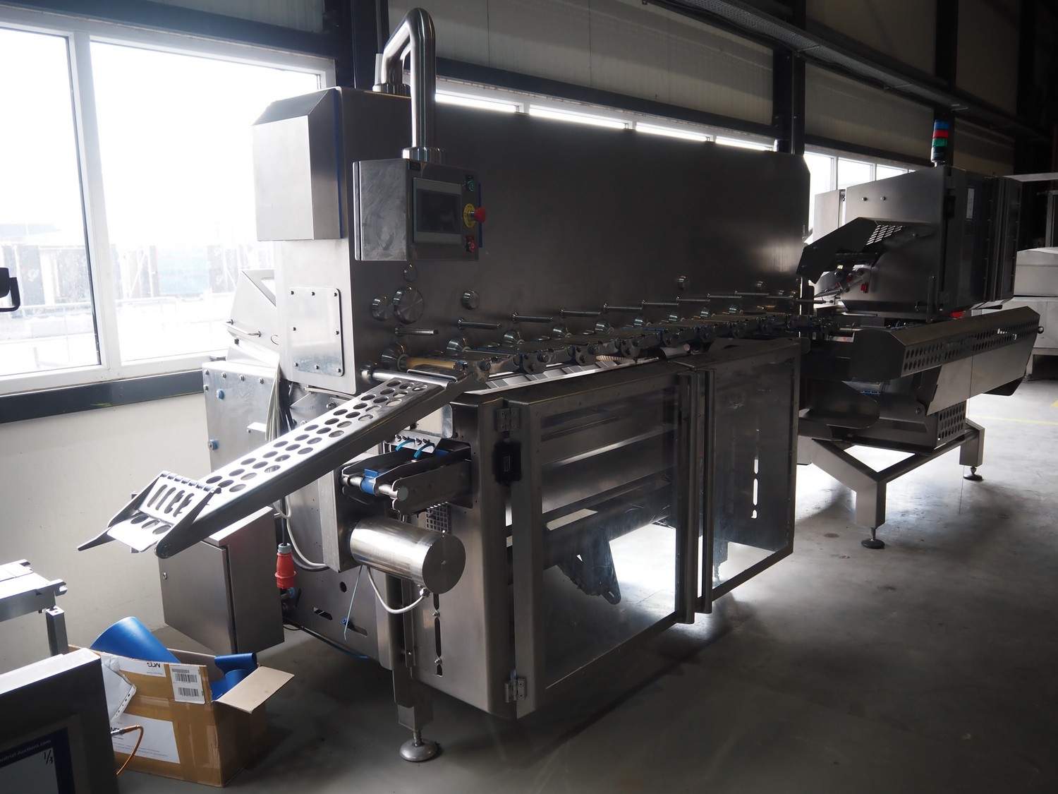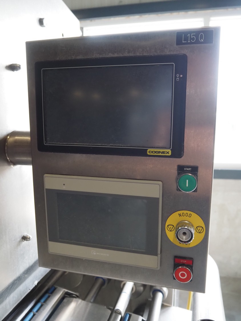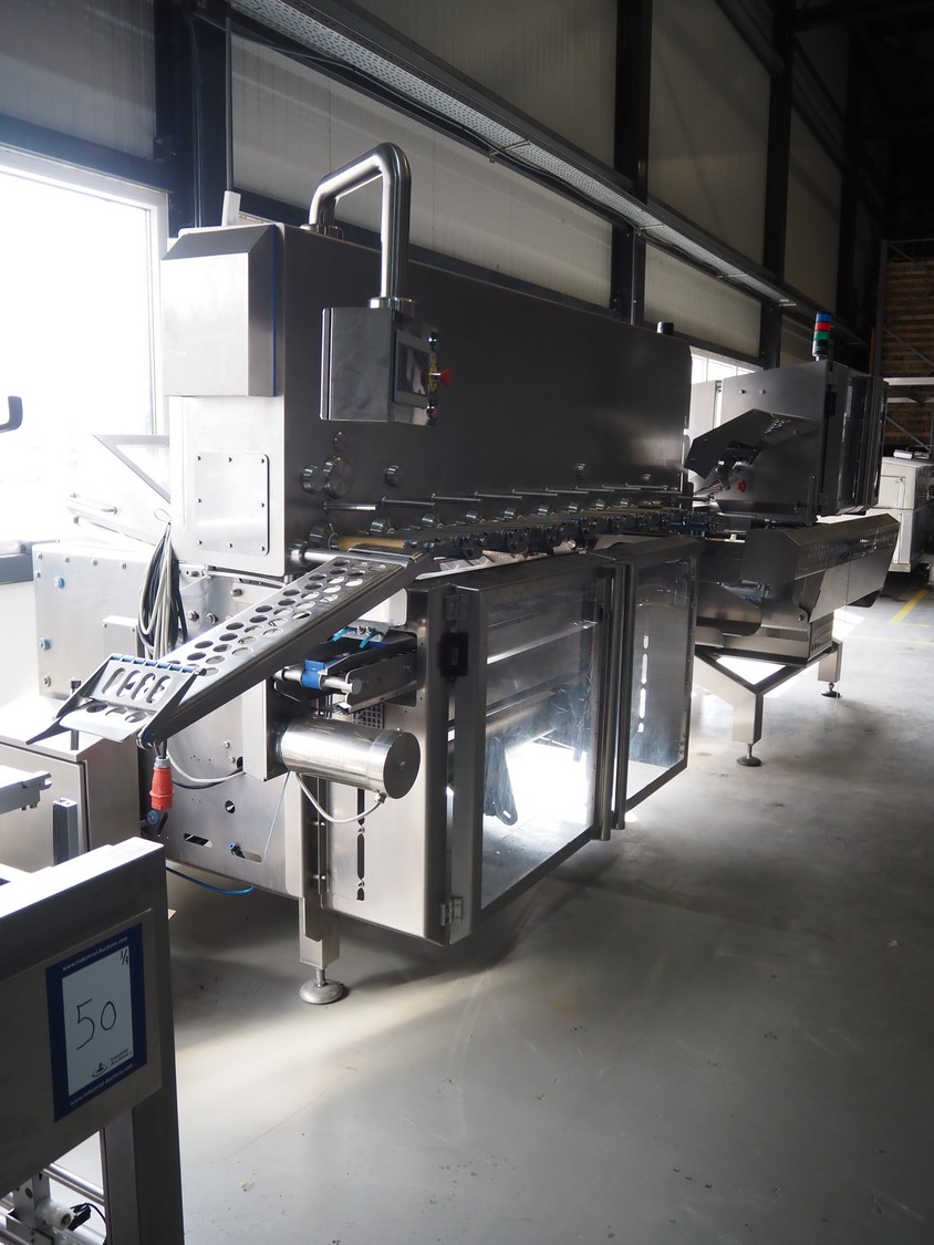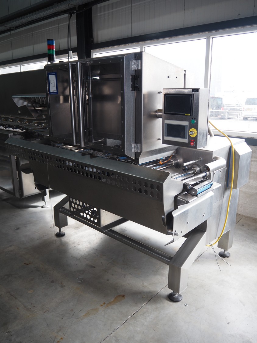 Automation Systems outfeed belt with weighing and sorting line, type: DNT101, year of construction: 2015, 400 V, 3 Ph, 18 A, 7 KW, plastic belt, belt width: 190 mm, 405 and 50 mm, tray dimensions: 175 mm x 125 mm, distance between dividers: 245 mm, total dimensions: 5750 mm x 2000 mm x 2150 mm.