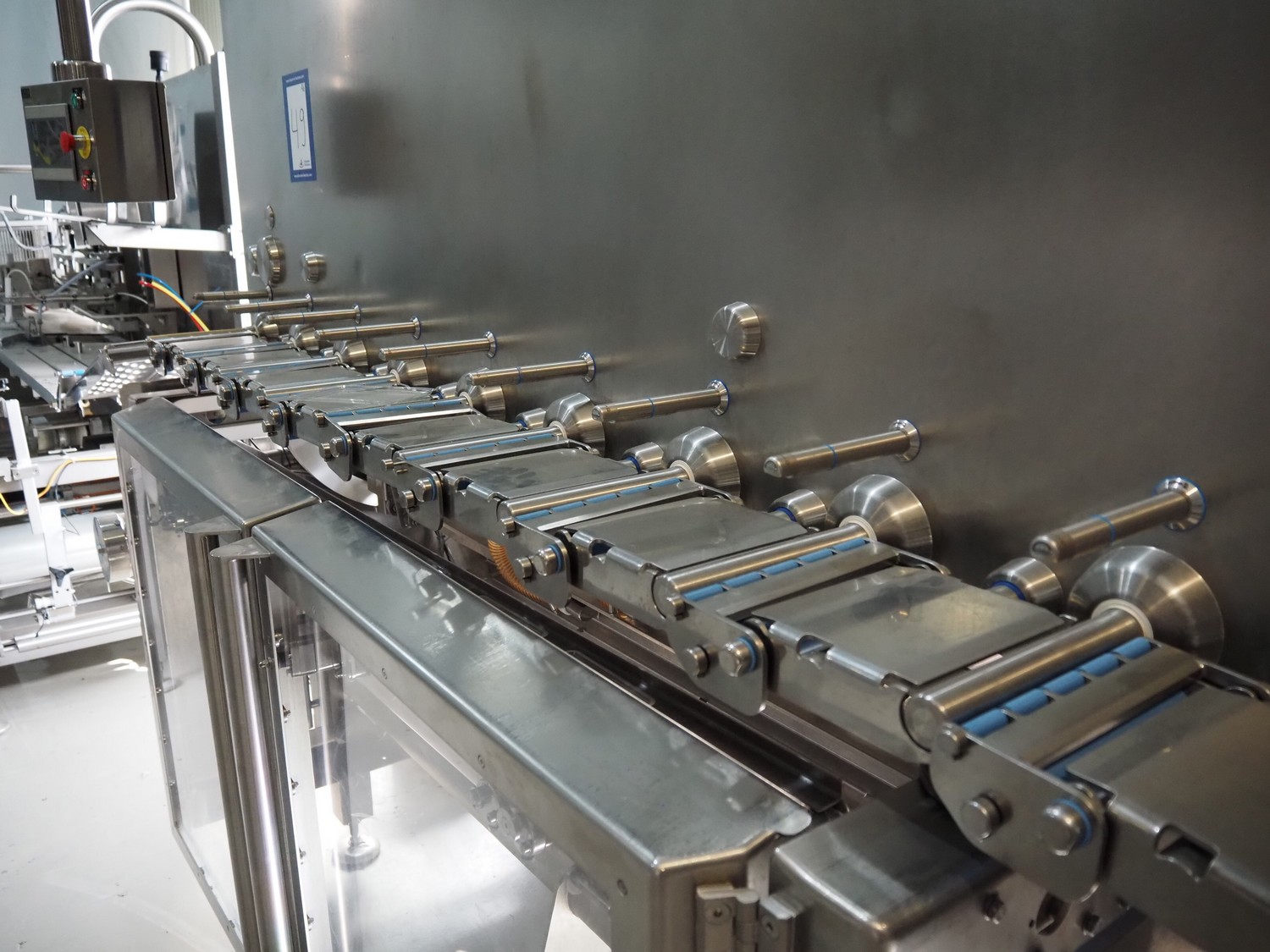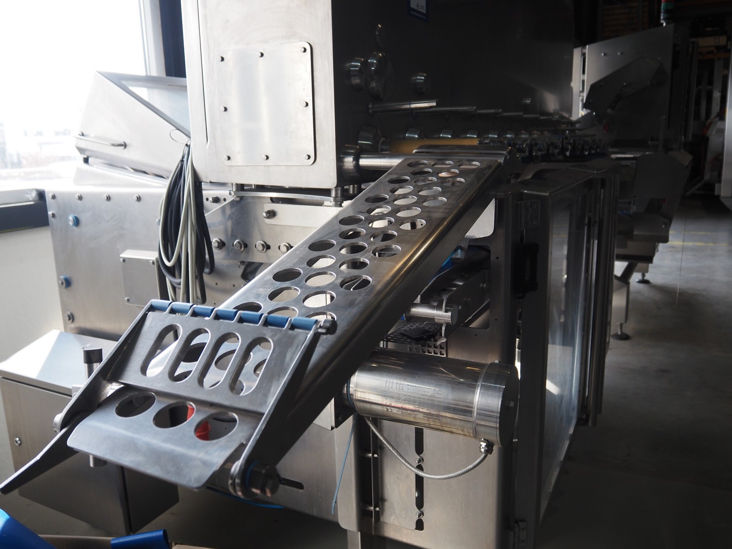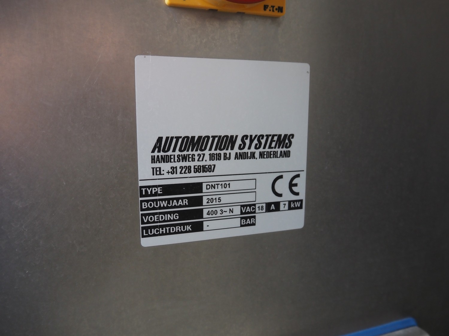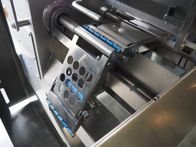 Automation Systems outfeed belt with weighing and sorting line, type: DNT101, year of construction: 2015, 400 V, 3 Ph, 18 A, 7 KW, plastic belt, belt width: 190 mm, 405 and 50 mm, tray dimensions: 175 mm x 125 mm, distance between dividers: 245 mm, total dimensions: 5750 mm x 2000 mm x 2150 mm.