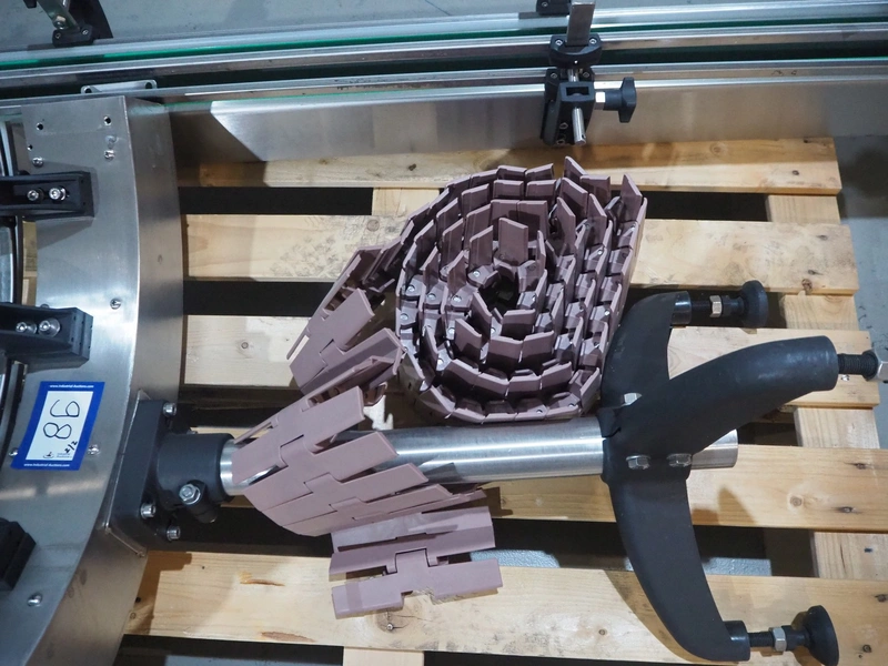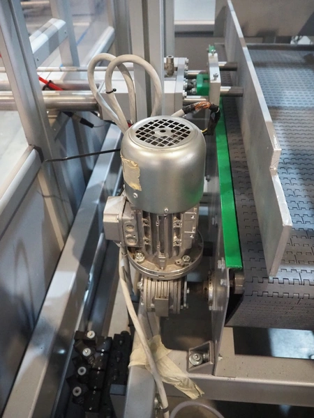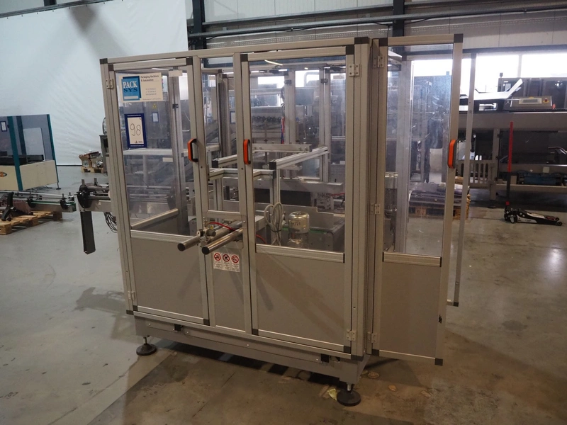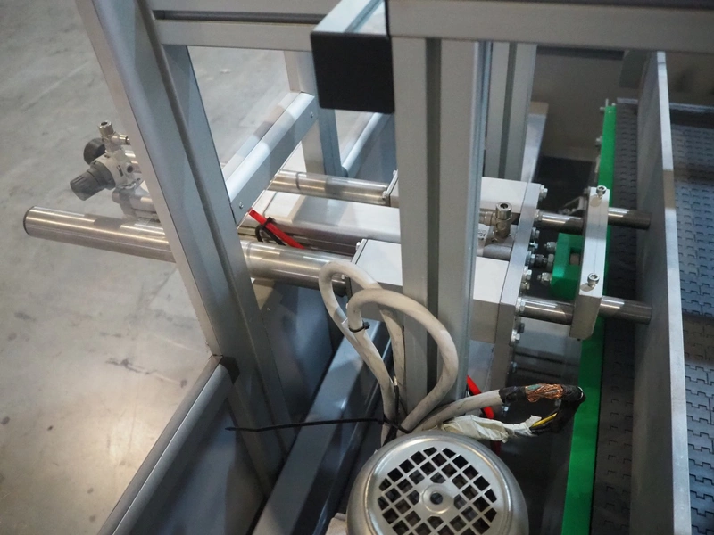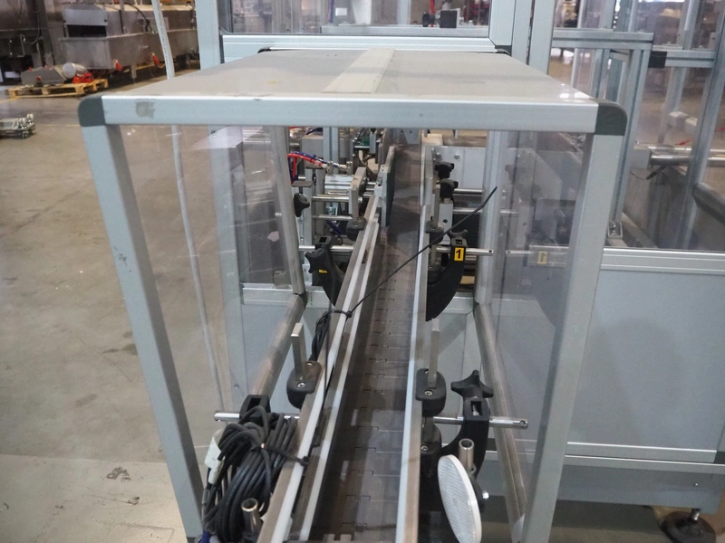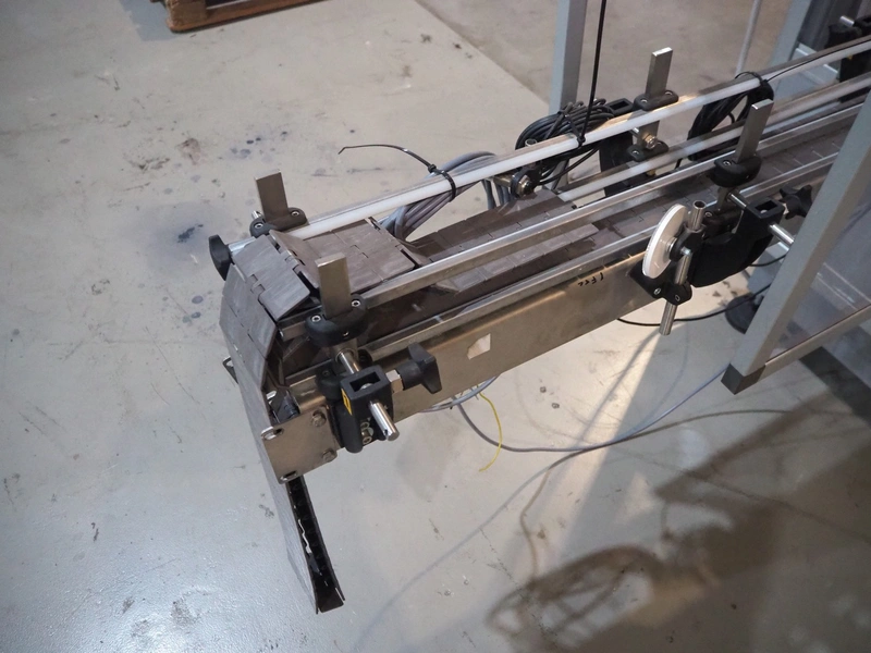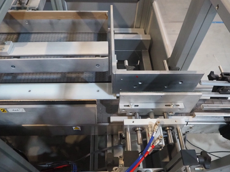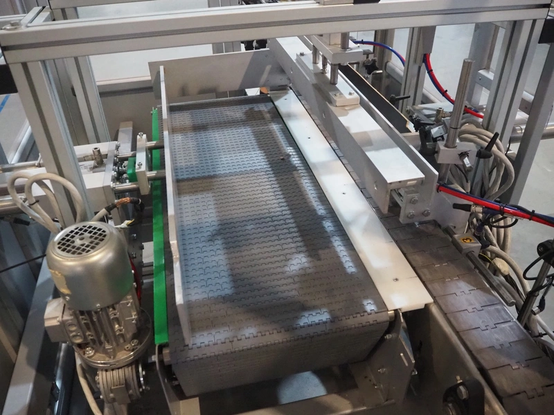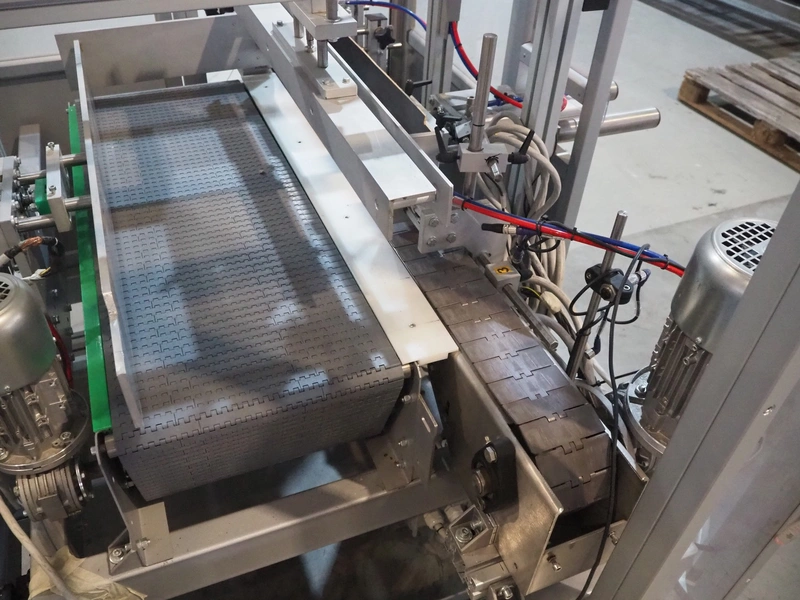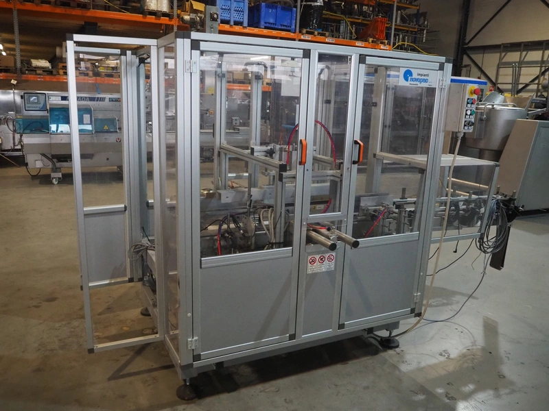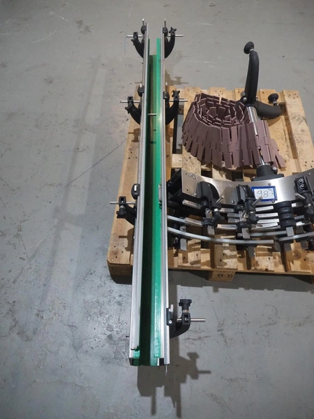 Novopac s.r.l. bundling machine, plastic belt, belt width: 360 mm and 100 mm, total dimensions: 3200 mm x 1400 mm x 1850 mm. With pallet with infeed belt.