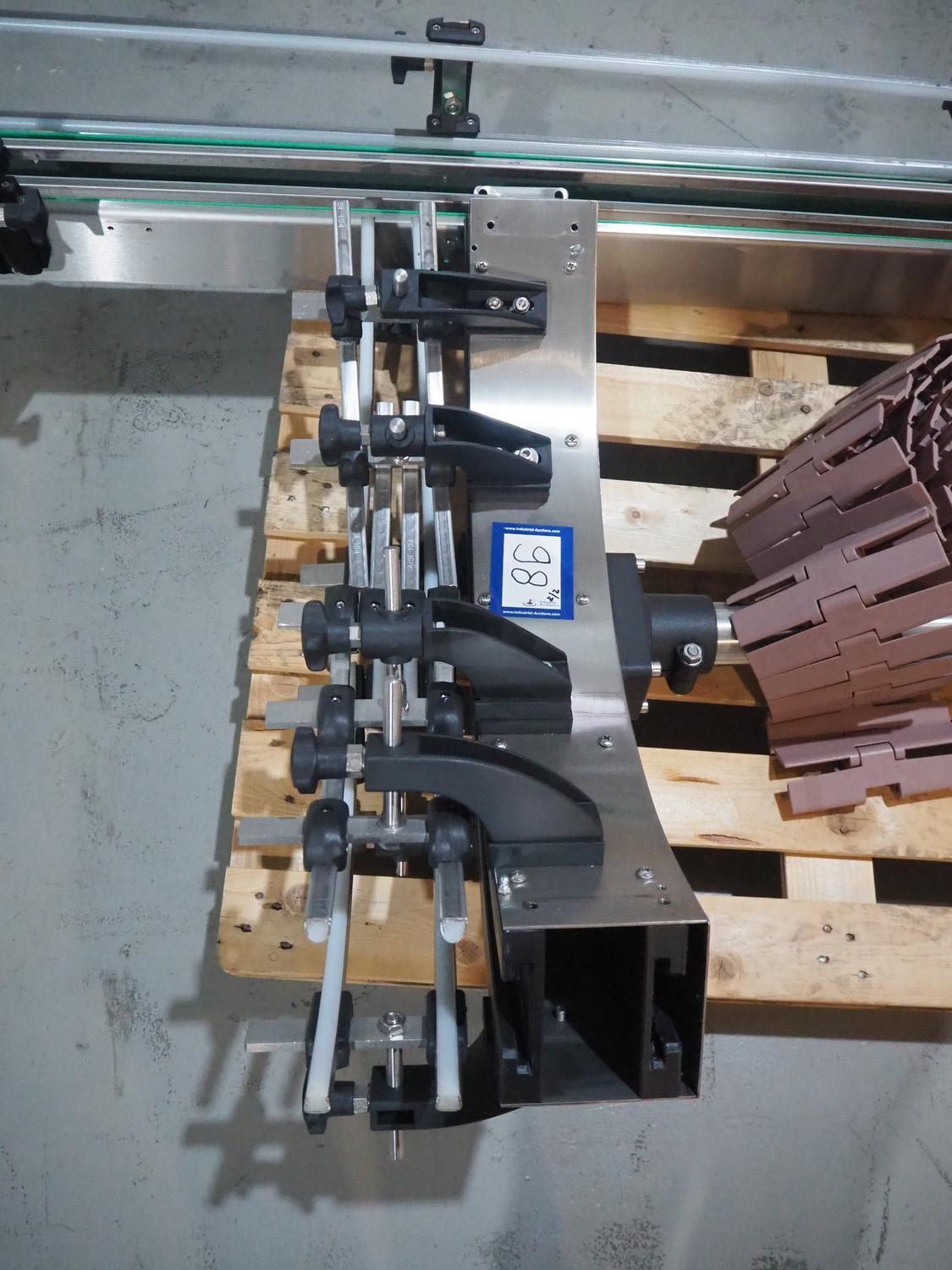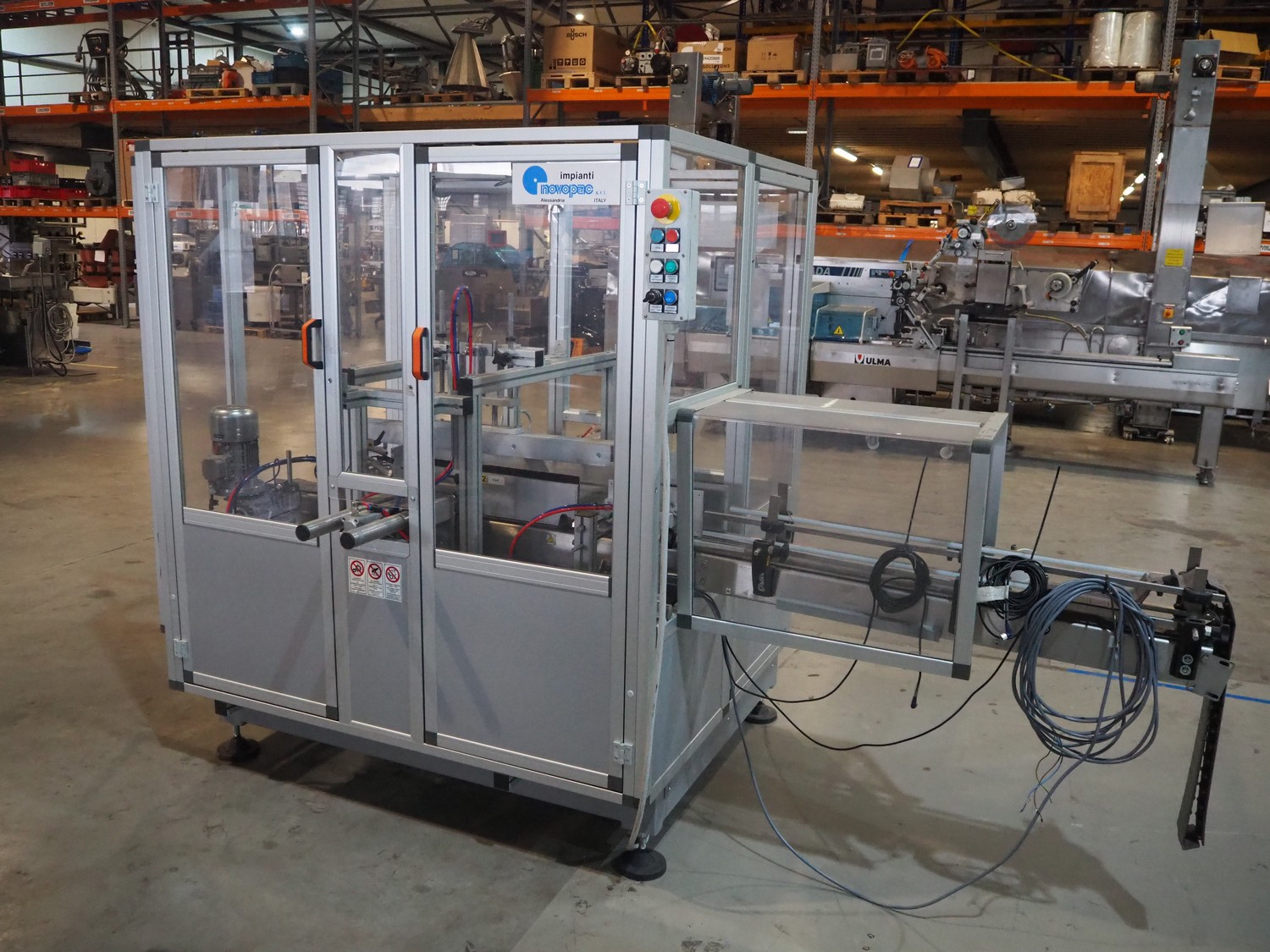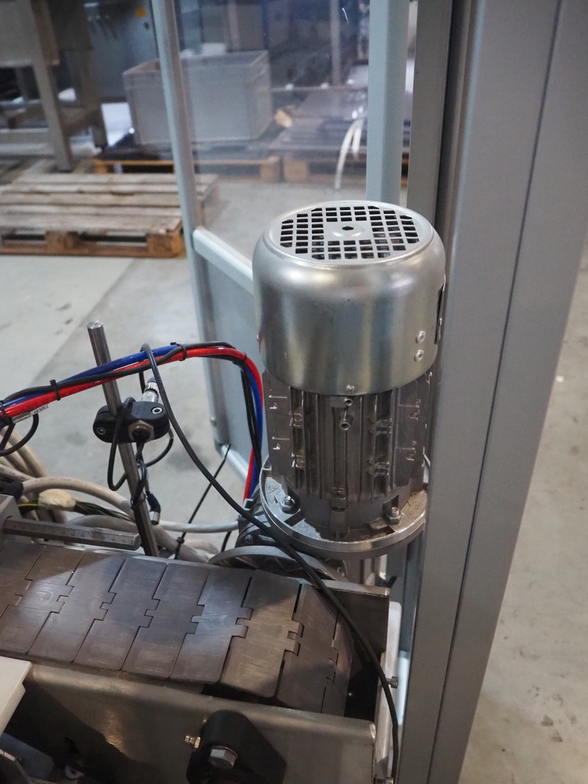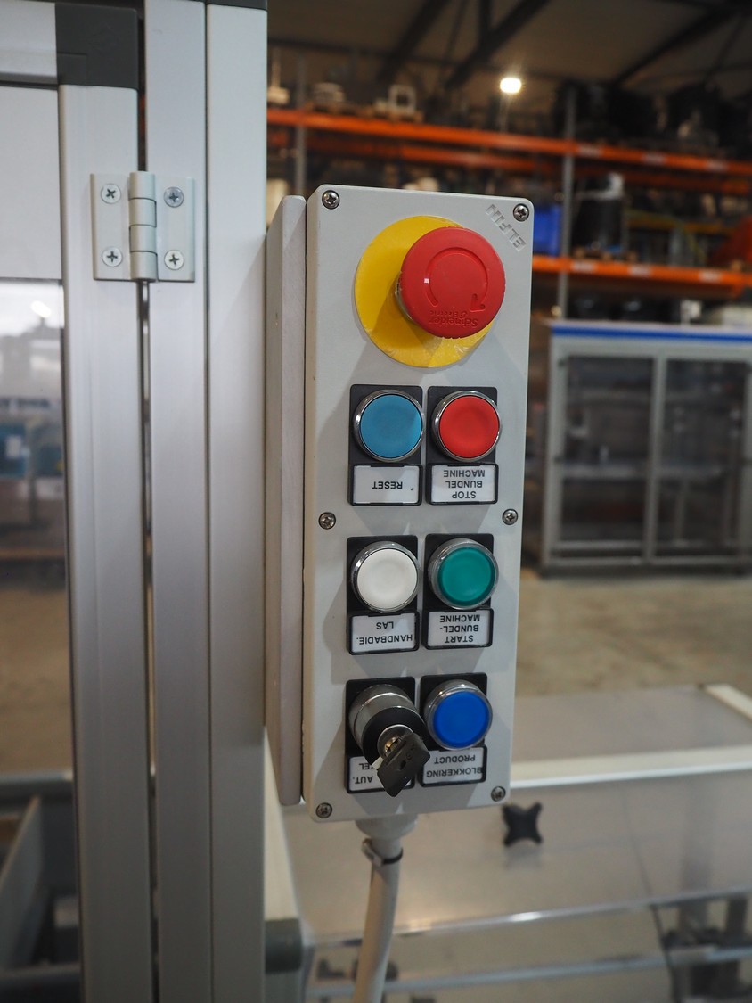 Novopac s.r.l. bundling machine, plastic belt, belt width: 360 mm and 100 mm, total dimensions: 3200 mm x 1400 mm x 1850 mm. With pallet with infeed belt.
