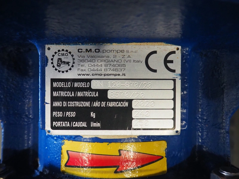 C.M.O. Pompe pump, model: MN 120-870/20, serial number: 8572/20, year of construction: 2020, weight: 240 kg, capacity: 250 liter per minute, dimensions: 2500 mm x 580 mm x 710 mm.