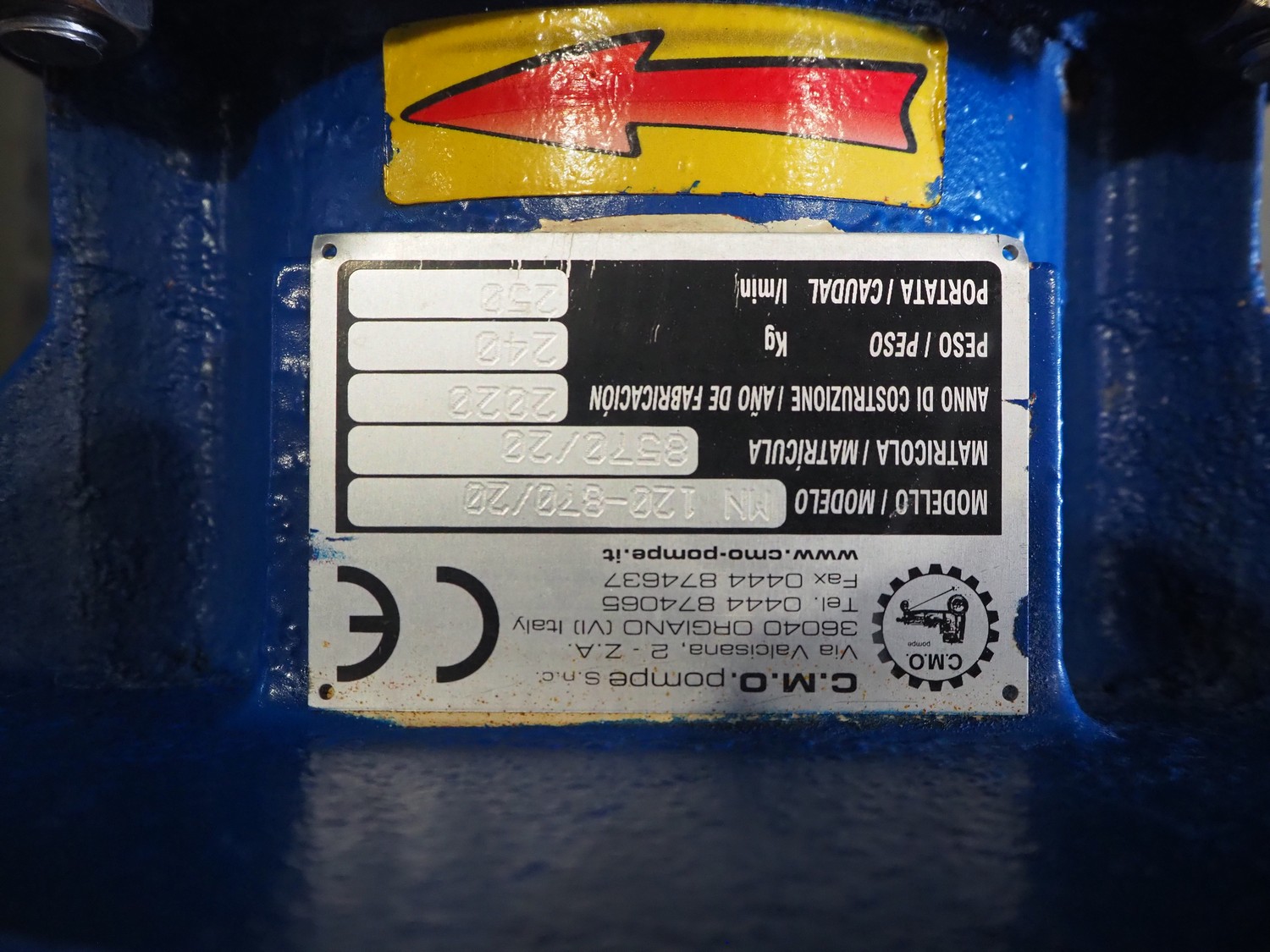 C.M.O. Pompe pump, model: MN 120-870/20, serial number: 8572/20, year of construction: 2020, weight: 240 kg, capacity: 250 liter per minute, dimensions: 2500 mm x 580 mm x 710 mm.