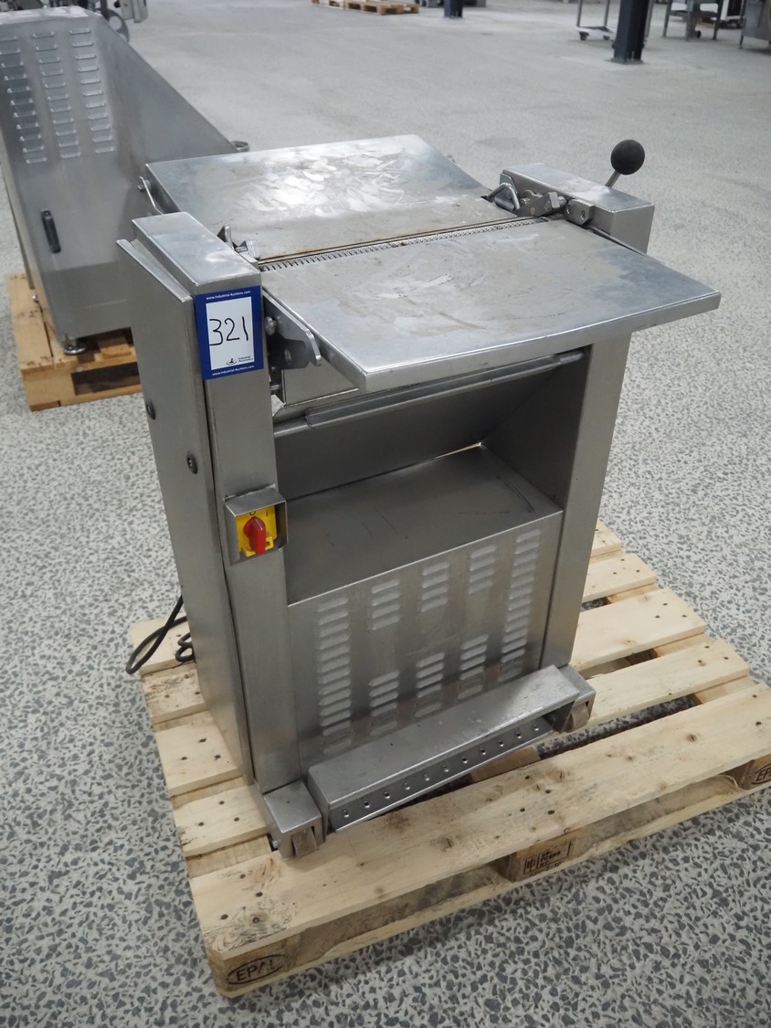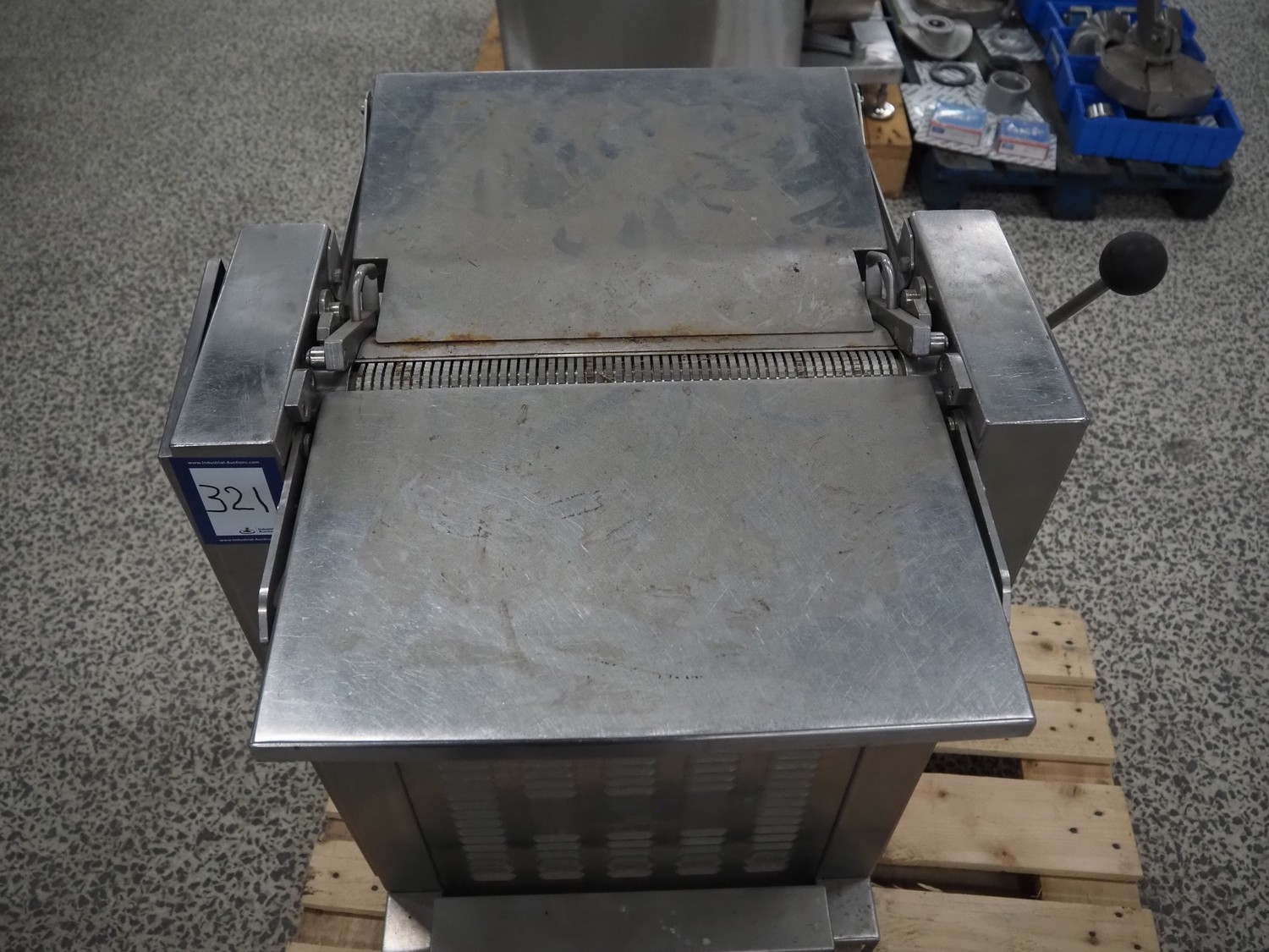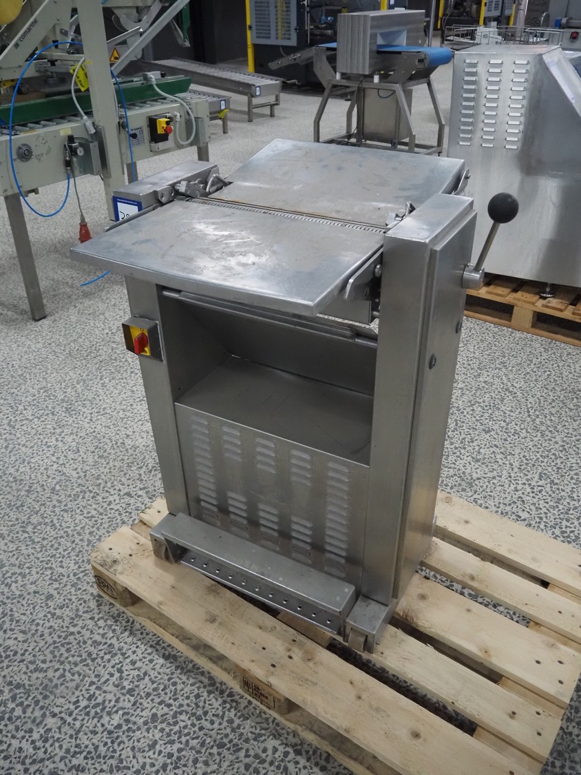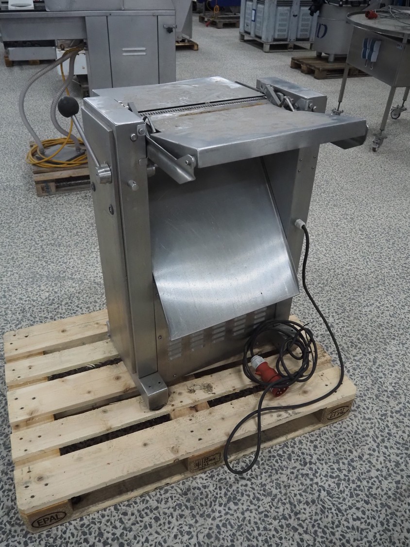 Skinning machine, working width: 435 mm, foot control, total dimensions: 700 mm x 800 mm x 1000 mm.